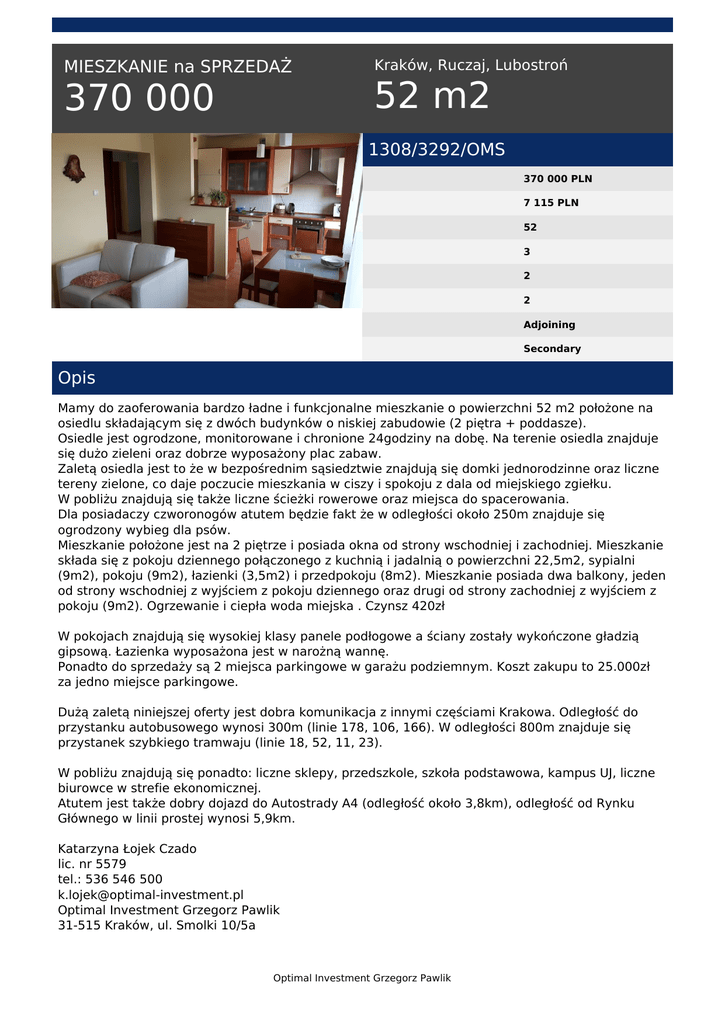 MIESZKANIE na SPRZEDAŻ 370 000 Kraków, Ruczaj, Lubostroń 52 m2 1308/3292/OMS 370 000 PLN 7 115 PLN 52 3 2 2 Adjoining Secondary Opis Mamy do zaoferowania bardzo ładne i funkcjonalne mieszkanie o powierzchni 52 m2 położone na osiedlu składającym się z dwóch budynków o niskiej zabudowie (2 piętra + poddasze). Osiedle jest ogrodzone, monitorowane i chronione 24godziny na dobę. Na terenie osiedla znajduje się dużo zieleni oraz dobrze wyposażony plac zabaw. Zaletą osiedla jest to że w bezpośrednim sąsiedztwie znajdują się domki jednorodzinne oraz liczne tereny zielone, co daje poczucie mieszkania w ciszy i spokoju z dala od miejskiego zgiełku. W pobliżu znajdują się także liczne ścieżki rowerowe oraz miejsca do spacerowania. Dla posiadaczy czworonogów atutem będzie fakt że w odległości około 250m znajduje się ogrodzony wybieg dla psów. Mieszkanie położone jest na 2 piętrze i posiada okna od strony wschodniej i zachodniej. Mieszkanie składa się z pokoju dziennego połączonego z kuchnią i jadalnią o powierzchni 22,5m2, sypialni (9m2), pokoju (9m2), łazienki (3,5m2) i przedpokoju (8m2). Mieszkanie posiada dwa balkony, jeden od strony wschodniej z wyjściem z pokoju dziennego oraz drugi od strony zachodniej z wyjściem z pokoju (9m2). Ogrzewanie i ciepła woda miejska . Czynsz 420zł W pokojach znajdują się wysokiej klasy panele podłogowe a ściany zostały wykończone gładzią gipsową. Łazienka wyposażona jest w narożną wannę. Ponadto do sprzedaży są 2 miejsca parkingowe w garażu podziemnym. Koszt zakupu to 25.000zł za jedno miejsce parkingowe. Dużą zaletą niniejszej oferty jest dobra komunikacja z innymi częściami Krakowa. Odległość do przystanku autobusowego wynosi 300m (linie 178, 106, 166). W odległości 800m znajduje się przystanek szybkiego tramwaju (linie 18, 52, 11, 23). W pobliżu znajdują się ponadto: liczne sklepy, przedszkole, szkoła podstawowa, kampus UJ, liczne biurowce w strefie ekonomicznej. Atutem jest także dobry dojazd do Autostrady A4 (odległość około 3,8km), odległość od Rynku Głównego w linii prostej wynosi 5,9km. Katarzyna Łojek Czado lic. nr 5579 tel.: 536 546 500 [email protected] Optimal Investment Grzegorz Pawlik 31-515 Kraków, ul. Smolki 10/5a Optimal Investment Grzegorz Pawlik Wszelkie dane dotyczące nieruchomości uzyskano na podstawie oświadczeń sprzedających. Zalecamy osobiste zapoznanie się ze stanem nieruchomości przed jej nabyciem. Prezentacja bezpłatna po uprzednim podpisaniu umowy pośrednictwa. Niniejsze ogłoszenie nie stanowi oferty w rozumieniu przepisów Kodeksu Cywilnego oraz innych właściwych przepisów prawnych, a dane w niej zawarte mają jedynie charakter informacyjny. Niniejsze ogłoszenie nie stanowi oferty w rozumieniu przepisów Kodeksu Cywilnego oraz innych właściwych przepisów prawnych, a dane w niej zawarte mają jedynie charakter informacyjny. Katarzyna Łojek-Czado tel. 536546500 email: [email protected] Optimal Investment Grzegorz Pawlik Powered by TCPDF (www.tcpdf.org)
