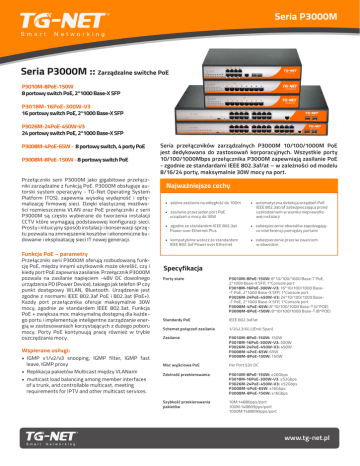 Seria P3000M Seria P3000M :: Zarządzalne switche PoE P3010M-8PoE-150W 8 portowy switch PoE, 2*1000 Base-X SFP P3018M-16PoE-300W-V3 16 portowy switch PoE, 2*1000 Base-X SFP P3026M-24PoE-450W-V3 24 portowy switch PoE, 2*1000 Base-X SFP P3008M-4PoE-65W - 8 portowy switch, 4 porty PoE P3008M-8PoE-150W - 8 portowy switch PoE Przełączniki serii P3000M jako gigabitowe przełączniki zarządzalne z funkcją PoE. P3000M obsługuje autorski system operacyjny - TG-Net Operating System Platform (TOS), zapewnia wysoką wydajność i optymalizację firmowej sieci. Dzięki elastycznej możliwości rozmieszczenia VLAN oraz PoE przełączniki z serii P3000M są często wybierane do tworzenia instalacji CCTV które wymagają podstawowej konfiguracji sieci. Prosty i intuicyjny sposób instalacji i konserwacji sprzętu pozwala na zmniejszenie kosztów i ekonomiczne budowanie i eksploatację sieci IT nowej generacji. Seria przełączników zarządzalnych P3000M 10/100/1000M PoE jest dedykowana do zastosowań korporacyjnych. Wszystkie porty 10/100/1000Mbps przełącznika P3000M zapewniają zasilanie PoE - zgodnie ze standardami IEEE 802.3af/at – w zależności od modelu 8/16/24 porty, maksymalnie 30W mocy na port. Najważniejsze cechy • zdalne zasilanie na odległość do 100m • zasilanie przez jeden port PoE urządzeń o mocy do 30W • automatyczna detekcja urządzeń PoE IEEE 802.3at/af zabezpieczająca przed uszkodzeniem w wyniku nieprawidłowej instalacji • zgodne ze standardem IEEE 802.3at Power over Ethernet Plus • zabezpieczenie obwodów zapobiegające interferencji pomiędzy portami • kompatybilne wstecz ze standardem IEEE 802.3af Power over Ethernet • zabezpieczenie przeciw zwarciom w obwodzie. Funkcja PoE – parametry Przełączniki serii P3000M oferują rozbudowaną funkcję PoE, między innymi użytkownik może określić, czy i kiedy port PoE zapewnia zasilanie. Przełącznik P3000M pozwala na zasilanie napięciem -48V DC dowolnego urządzenia PD (Power Device), takiego jak telefon IP czy punkt dostępowy WLAN, Bluetooth. Urządzenie jest zgodne z normami IEEE 802.3af PoE i 802.3at (PoE+). Każdy port przełącznika oferuje maksymalnie 30W mocy, zgodnie ze standardem IEEE 802.3at. Funkcja PoE + zwiększa moc maksymalną dostępną dla każdego portu i implementuje inteligentne zarządzanie energią w zastosowaniach korzystających z dużego poboru mocy. Porty PoE kontynuują pracę również w trybie oszczędzania mocy. Specyfikacja Porty stałe P3010M-8PoE-150W: 8*10/100/1000 Base-T PoE, 2*1000 Base-X SFP, 1*Console port P3018M-16PoE-300W-V3: 16*10/100/1000 Base-T PoE, 2*1000 Base-X SFP, 1*Console port P3026M-24PoE-450W-V3: 24*10/100/1000 Base-T PoE, 2*1000 Base-X SFP, 1*Console port P3008M-4PoE-65W: 8*10/100/1000 Base-T (4*POE) P3008M-8PoE-150W: 8*10/100/1000 Base-T (8*POE) Standardy PoE IEEE 802.3af/at Schemat połączeń zasilania 1/2(+),3/6(-),(End-Span) Zasilanie P3010M-8PoE-150W: 150W P3018M-16PoE-300W-V3: 300W P3026M-24PoE-450W-V3: 450W P3008M-4PoE-65W: 65W P3008M-8PoE-150W: 150W Moc wyjściowa PoE Per Port 53V DC Zdolność przekierowania P3010M-8PoE-150W: ≥20Gbps P3018M-16PoE-300W-V3: ≥52Gbps P3026M-24PoE-450W-V3: ≥52Gbps P3008M-4PoE-65W: ≥16Gbps P3008M-8PoE-150W: ≥16Gbps Szybkość przekierowania pakietów 10M:14880pps/port 100M:148809pps/port 1000M:1488095pps/port Wspierane usługi: • IGMP v1/v2/v3 snooping, IGMP filter, IGMP fast leave, IGMP proxy • Replikacja pakietów Multicast między VLANami • multicast load balancing among member interfaces of a trunk, and controllable multicast, meeting requirements for IPTV and other multicast services. www.tg-net.pl Seria P3000M Seria P3000M :: Zarządzalne switche PoE Kompleksowa polityka QoS (Quality of Service) oraz mechanizmy bezpieczeństwa Przełączniki P3000M klasyfikują ruch sieciowy na postawie pakietów informacji takich jak 5-tuple, preferencji adresów IP,ToS, DSCP, typ protokołu IP, typ ICMP, CoS. Każdy port obsługuje osiem kolejek priorytetowych i wiele algorytmów kolejki planowania, takich jak WRR, SP, WRR + SP. Wszystkie te parametry zapewniają wysokiej jakości transmisję głosu, wideo i danych. Przełączniki P3000M zapewniają wiele środków bezpieczeństwa w celu ochrony przed atakami typu DoS (Denial of Service), a także ataków sieci i użytkowników indywidualnych. Blokowane rodzaje ataków DoS to SYN Flood, Land, Smurf i ICMP Flood. Blokowane ataki sieci to STP BPDU/root. Blokowane ataki na użytkowników to fałszywe ataki serwer DHCP, ataki man-in-the- middle, ataki IP / MAC spoofing i DHCP request flood. Ataki DoS zmieniające pole CHADDR w pakietach DHCP są innym typem ataków na użytkownika. Specyfikacja Środowisko pracy Operating temperature: 0 oC – 50 oC Relative humidity: 5%–95% (non-condensing) Rozmiary P3010M-8PoE-150W: 280(L) *180(W) *44(H)mm P3018M-16PoE-300W-V3: 440(L) ×285(W) *44.5(H)mm P3026M-24PoE-450W-V3: 440(L) ×285(W)44.5(H)mm P3008M-4PoE-65W: 280(L) *180(W) *44(H)mm P3008M-8PoE-150W: 280(L) *180(W) *44(H)mm Waga P3010M-8PoE-150W: < 2Kg P3018M-16PoE-300W-V3: < 8Kg P3026M-24PoE-450W-V3: < 10Kg P3008M-4PoE-65W: < 1.5Kg P3008M-8PoE-150W: < 2Kg Napięcie wejściowe AC:110~240V/50~60Hz Standardy IEEE 802.3af,Power Over Ethernet IEEE 802.3at,Power Over Ethernet Plus IEEE 802.3ad, Link Aggregation IEEE 802.3,10BASE-T IEEE 802.3u,100 BASE-TX IEEE 802.3ab,1000 BASE-T IEEE 802.3z,1000 BASE-X IEEE 802.3x, Ethernet flow control IEEE 802.3az,EEE(Energy Efficient Ethernet) IEEE 802.1AB-2005,LLDP( Link Layer DiscoveryProtocol) IEEE 802.1d, Spanning Tree Protocol IEEE 802.1w, Rapid Spanning Tree Protocol IEEE 802.1q, VLAN IEEE 802.1p,QoS Tablica adresów MAC 8K MAC addresses MAC address learning and aging VLAN 4K VLANs Port-based VLANs P3010M-8PoE-150W, P3018M-16PoE-300W-V3, P3026M-24PoE-450W-V3: Voice VLAN Protokół SPP P3010M-8PoE-150W, P3018M-16PoE-300W-V3, P3026M-24PoE-450W-V3: STP(Spanning Tree Protocol), RSTP( Rapid Spanning Tree Protocol) Agregacja łącz