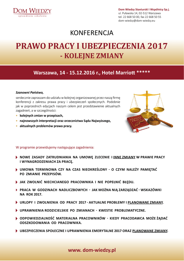 Dom Wiedzy Staniurski i Wspólnicy Sp.j. ul. Puławska 14, 02-512 Warszawa tel. 22 668 50 00, fax 22 668 50 55 [email protected] KONFERENCJA PRAWO PRACY I UBEZPIECZENIA 2017 - KOLEJNE ZMIANY Warszawa, 14 - 15.12.2016 r., Hotel Marriott ***** Szanowni Państwo, serdecznie zapraszam do udziału w kolejnej organizowanej przez naszą firmę konferencji z zakresu prawa pracy i ubezpieczeń społecznych. Podobnie jak w poprzednich edycjach naszym celem jest przedstawienie aktualnych zagadnień, a w szczególności: • kolejnych zmian w przepisach, • najnowszych interpretacji oraz orzecznictwa Sądu Najwyższego, • aktualnych problemów prawa pracy. W programie przewidujemy następujące zagadnienia: NOWE ZASADY ZATRUDNIANIA NA UMOWĘ ZLECENIE I INNE ZMIANY W PRAWIE PRACY I WYNAGRODZENIACH ZA PRACĘ. UMOWA TERMINOWA CZY NA CZAS NIEOKREŚLONY - O CZYM NALEŻY PAMIĘTAĆ PO ZMIANIE PRZEPISÓW. JAK ZWOLNIĆ NIECHCIANEGO PRACOWNIKA I NIE POPEŁNIĆ BŁĘDU. PRACA W GODZINACH NADLICZBOWYCH - JAK MOŻNA NIĄ ZARZĄDZAĆ - WSKAZÓWKI NA ROK 2017. URLOPY I ZWOLNIENIA OD PRACY 2017 - AKTUALNE PROBLEMY I PLANOWANE ZMIANY. UPRAWNIENIA RODZICIELSKIE PO ZMIANACH - KWESTIE PROBLEMATYCZNE. ODPOWIEDZIALNOŚĆ MATERIALNA PRACOWNIKÓW - KIEDY PRACODAWCA MOŻE ŻĄDAĆ ODSZKODOWANIA OD PRACOWNIKA. UBEZPIECZENIA SPOŁECZNE I UPRAWNIENIA EMERYTALNE 2017 ORAZ PLANOWANE ZMIANY. www. dom-wiedzy.pl Do prowadzenia poszczególnych tematów zaprosiliśmy ekspertów znanych doskonale Państwu z naszych poprzednich konferencji. mec. Anna TELEC dyr. Anita GWAREK mec. Karol SIERGIEJ mec. Maria ŁABA mec. Piotr WOJCIECHOWSKI Poniżej przedstawiam szczegółowy program konferencji. Zapraszam do uczestnictwa i mam nadzieję do zobaczenia na konferencji. Serdecznie pozdrawiam, Mariusz Staniurski Program konferencji: NOWE ZASADY ZATRUDNIANIA NA UMOWĘ ZLECENIE I INNE ZMIANY W PRAWIE PRACY I WYNAGRODZENIACH ZA PRACĘ. 1. ZASADY USTALANIA STAWKI GODZINOWEJ W PRZYPADKU UMÓW CYWILNOPRAWNYCH. 2. UPRAWNIENIA INSPEKTORA PRACY W ZAKRESIE KONTROLOWANIA UMÓW CYWILNOPRAWNYCH. 3. ZMIANY W USTALANIU MINIMALNEGO WYNAGRODZENIA DLA PRACOWNIKÓW. 4. ZNIESIENIE MINIMALNEGO WYNAGRODZENIA DLA OSÓB W PIERWSZYM ROKU PRACY W WYSOKOŚCI 80% PEŁNEJ PŁACY MINIMALNEJ. 5. WLICZANIE DODATKU NOCNEGO DO PODSTAWY WYMIARU MINIMALNEGO WYNAGRODZENIA – OBOWIĄZUJE OD 1.01.2017 R. 6. ZMIANY W OCHRONIE CIĘŻARNYCH PRZED PRACAMI UCIĄŻLIWYMI, NIEBEZPIECZNYMI LUB SZKODLIWYMI DLA ZDROWIA. 7. ZMIANY W POTWIERDZANIU UMÓW O PRACĘ (SYNDROM PIERWSZEJ DNIÓWKI ROBOCZEJ) – OBOWIĄZUJĄ OD 1.09.2016 R. 8. OBOWIĄZEK TWORZENIA REGULAMINU WYNAGRADZANIA, REGULAMINU PRACY I FUNDUSZU SOCJALNEGO PRZEZ ZATRUDNIAJĄCYCH CO NAJMNIEJ 50 PRACOWNIKÓW. 9. ZMIANA ZASAD WYDAWANIA ŚWIADECTWA PRACY W PRZYPADKU ZATRUDNIANIA PRACOWNIKA NA KOLEJNEJ UMOWIE O PRACĘ. 10.ROZSZERZENIE KRĘGU PRACODAWCÓW MOGĄCYCH SIĘ DOMAGAĆ OD KANDYDATA DO PRACY ZAŚWIADCZENIA O NIEKARALNOŚCI. 11.WYDŁUŻENIE DO 14 DNI TERMINU NA ODWOŁANIE PRACOWNIKA DO SĄDU PRACY OD WYPOWIEDZENIA. 12.SKRÓCENIE OKRESU PRZECHOWYWANIA DOKUMENTACJI PRACOWNICZEJ Z 50 DO 10 LAT ORAZ MOŻLIWOŚĆ ICH GROMADZENIA W FORMIE ELEKTRONICZNEJ. 13.ZASADY DELEGOWANIA PRACOWNIKÓW PO ZMIANACH. Prowadzenie: mec. Piotr WOJCIECHOWSKI Adwokat specjalizujący się w prawie pracy, były Wicedyrektor Departamentu Prawa Pracy w Głównym Inspektoracie Pracy. UMOWA TERMINOWA CZY NA CZAS NIEOKREŚLONY – O CZYM NALEŻY PAMIĘTAĆ PO ZMIANIE PRZEPISÓW. 1. Czym należy się kierować przy wyborze rodzaju umowy? 2. Cele zawarcia umowy terminowej – w jaki sposób uniknąć ograniczeń? 3. Różnice w zakresie rozwiązywania umów o pracę – które ułatwienia pozostały? 4. Umowy zawarte na starych zasadach a nowe limity – gdzie uważać na pułapki? Prowadzenie: mec. Karol SIERGIEJ Radca Prawny, Wspólnik Zarządzający w Kancelarii Siergiej i Partnerzy. JAK ZWOLNIĆ NIECHCIANEGO PRACOWNIKA I NIE POPEŁNIĆ BŁĘDU. 1. Wypowiedzenie umowy o pracę jako zwykły sposób rozstania się z pracownikiem. 2. Kiedy wybrać zwolnienie dysplinarne. 3. Sposób konstruowania przyczyny wypowiedzenia. 4. Jak skutecznie wypowiedzieć pracownikowi umowę o pracę – aspekty praktyczne w świetle orzecznictwa sądów pracy. 5. Ochrona przed wypowiedzeniem umowy o pracę. Prowadzenie: mec. Anna TELEC Radca Prawny prowadzący kancelarię prawa pracy, były sędzia sądu pracy. UPRAWNIENIA RODZICIELSKIE PO ZMIANACH - KWESTIE PROBLEMATYCZNE. 1. OMÓWIENIE NOWYCH ZASAD UDZIELANIA URLOPU MACIERZYŃSKIEGO I RODZICIELSKIEGO. 2. TERMINY SKŁADANIA WNIOSKÓW I KONSEKWENCJE ICH NIEDOTRZYMANIA. 3. DZIELENIE URLOPÓW POMIĘDZY OBOJE RODZICÓW. 4. ŁĄCZENIE URLOPU RODZICIELSKIEGO Z PRACĄ. 5. ZASADY WYDŁUŻANIA URLOPU RODZICIELSKIEGO W ZWIĄZKU W WYKONYWANIEM PRACY W NIEPEŁNYM WYMIARZE. 6. WYMIAR URLOPU WYPOCZYNKOWEGO PRZYSŁUGUJĄCEGO W PRZYPADKU ŁĄCZENIA URLOPU Z PRACĄ. Prowadzenie: mec. Karol SIERGIEJ Radca Prawny, Wspólnik Zarządzający w Kancelarii Siergiej i Partnerzy. URLOPY I ZWOLNIENIA OD PRACY 2016/2017 – AKTUALNE PROBLEMY I PLANOWANE ZMIANY. 1. Urlop wypoczynkowy w świetle orzecznictwa sądowego. • Zasady nabywania i udzielania urlopu. • Termin udzielenia urlopu (plan urlopów, porozumienie, ostateczny termin). • Urlop wypoczynkowy a inne okresy niewykonywania pracy. • Przedawnienie roszczenia o urlop (zawieszenie roszczenia o urlop). • Planowane zmiany w zakresie urlopów wypoczynkowych. 2. Zwolnienia od pracy. • Prawo pracownika do zwolnienia od pracy i obowiązek pracodawcy udzielania zwolnienia. • Kategorie zdarzeń uprawniające do zwolnienia. 3. Zwolnienie na opiekę nad dzieckiem. • Możliwość korzystania ze zwolnienia na dziecko w wymiarze godzinowym. • Pierwszy wniosek w roku decydujący o sposobie korzystania ze zwolnienia w danym roku. Prowadzenie: dyr. Anita GWAREK Dyrektor Departamentu Prawa Pracy w Ministerstwie Rodziny, Pracy i Polityki Społecznej. PRACA W GODZINACH NADLICZBOWYCH – JAK MOŻNA NIĄ Z