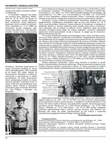 OPOWIEŒCI GENEALOGICZNE dokoñczenie z poprzedniej strony Dzieci Maksyma powi¹za³y siê a¿ trzema ma³¿eñstwami z Rudowskimi, dzieæmi Szczepana i Zuzanny z Przybylskich gospodarzy z Kisielewa w parafii £êg. Franciszka (ur. 2 IV 1904 – zm. 19 XI 1995) poœlubi³a Kajetana Rudowskiego. Jej bracia Adam (ur. 17 X 1887 – zm. ?) i Franciszek (ur. 4 IX 1892 – zm. 15 XII 1972) mieli za ¿ony Stanis³awê i Reginê Rudowskie. Adam i Franciszek mieli gospodarstwa na ojcowiŸnie, nastêpnie prowadzone przez ich synów Adama i Stefana. Koszmary II wojny œwiatowej doœwiadczy³y Gutowskich podobnie jak ca³e spo³eczeñstwo. Wyj¹tkowym przyk³adem tego s¹ losy Jana Feliksa (ur. 24 VI 1923), syna Stanis³awa i Marianny. Zosta³ uwiêziony w Dzia³dowie, a nastêpnie w Stutthofie. Niemcy w ramach ewakuacji obozu wys³ali cztery barki z wycieñczonymi wiêŸniami, aby je zatopiæ na pe³nym morzu. WiêŸniom uda³o siê jedn¹ odczepiæ. Dryfuj¹c¹ bark¹ zajê³y siê wojska angielskie. Uwolnieni wyg³odzeni wiêŸniowie zostali sprowadzeni na l¹d w Szwecji. Tu zajêto siê ich leczeniem. Wœród uratowanych by³ Jan. Po II wojnie œwiatowej pañstwo wprowadzaj¹ce nowy ustrój, niechêtnie odnosi³o siê do osób maj¹cych „niew³aœciwe pochodzenie” Gospodarstwa Gutowskich nie kwalifikowa³y siê ze wzglêdu na powierzchniê (poni¿ej 50 ha) do upañstwowienia. Starano siê je wrêcz zniszczyæ pozbawiaj¹c r¹k do pracy. Wcielano m³odych ludzi zamiast do normalnego wojska do s³u¿by wojskowej zwi¹zanej z prawie niewolnicz¹ prac¹ w górnictwie. „Zgodnie z rozkazem Konstantego Rokossowskiego podstaw¹ do zakwalifikowania poborowego do s³u¿by zastêpczej by³o jego pochodzenie spo³eczne, oblicze spo³eczne i moralne oraz przesz³oœæ polityczna.” Starano siê poddaæ komunistycznej indoktrynacji przedstawicieli m³odszego pokolenia. Chodzi³o o ³amanie charakterów. ¯o³nierze-górnicy niekiedy powa¿nie nadwerê¿ali swoje zdrowie, a niektórzy tracili ¿ycie. Do takiej s³u¿by zostali przydzieleni Izydor (ur. 6 V 1930) i Ryszard Gutowscy (ur. 9 VIII 1931), synowie Stanis³awa, Marianna z Siemi¹tkowskich (1898-1926), wnukowie Jana, i Stefan Gutowski (ur. 11 VIII 1929), syn Franciszka, wnuk Maksyma, oraz ich krewni z rodziny Chorzewskich. pierwsza ¿ona Stanis³awa Gutowskiego. Dzisiaj wiêkszoœæ Gutowskich, którzy maj¹ korzenie w Gutowie w parafii S³upia, mieszka daleko od gniazda rodzinnego. Kolejnym pokoleniom bêdzie coraz Konstancji. Stanis³aw gospodarzy³ na trudniej utrzymaæ pamiêæ o przesz³oœci rodziny. Ci, którzy pozostali na miejscu czêœci Chorzewa przejêtej po teœciu kultywuj¹ pamiêæ o d³ugim wielopokoleniowym trwaniu w rodzinnej miejscowoœci. Janie Siemi¹tkowskim, który posiada³ Na ganku domu w j¹ od koñca XIX wieku nabyt¹ od Chorzewie. Siedz¹ po Chorzewskich. Stanis³aw z rodzin¹ zabokach mieszkiwa³ w zbudowanym w latach Stanis³aw i Julia z dwudziestych XX wieku drewnianym Siemi¹tkowskich domu nawi¹zuj¹cym stylem do mazoGutowscy, w œrodku wieckich dworków. Stanis³aw zmar³ 14 Jadwiga z Gi¿yñskich lutego 1948 roku pozostawiwszy dzieSiemi¹tkowska wiêcioro dzieci. Dzisiaj w Chorzewie (matka Julii). Wokó³ gospodarz¹ jego wnukowie Stanis³aw, dziewiêcioro dzieci syn Jana Feliksa, i Miros³aw, syn Stanis³awa. W oknie Ryszarda. Kazimierz Gutowski z narzeczon¹. niegdyœ by³o wiele w wioskach szlachty cz¹stkowej. Z rolnictwem zwi¹zani byli tak¿e inni synowie Jana i Marianny. W³adys³aw (ur. 16 XII 1877) by³ ¿onaty ze swoj¹ stryjeczn¹ siostr¹ Mariann¹ Ew¹ Gutowsk¹, córk¹ Maksyma. Mieszka³ z ¿on¹ i z dzieæmi w GutowieOrlim. Stanis³aw (ur. 11 IX 1888) by³ dwukrotnie ¿onaty. Kolejnymi jego ¿onami by³y Marianna i Julia Siemi¹tkowskie, siostry wy¿ej wspomnianej Sierpczanie przewa¿nie bardziej znaj¹ Gutowskich, którzy byli w³aœcicielami cegielni. Adam (ur. ok. 1851 – zm. 31 VII 1907), syn Jana i Pauliny z Miszewskich, by³ wczeœniej ekonomem w Kosmaczewie, a nastêpnie w Gutowie-Stradzyno. Pod koniec XIX wieku osiad³ w Sierpcu i by³ w³aœcicielem cegielni. Spoœród jego dzieci wymieñmy synów: Teodora (ur. 11 V 1879 Gutowo-Stradzyno – zm. 31 VII 1930 Sierpc) i Modesta (ur. 15 VI 1900 Sierpc – zm. 16 VI 1965 tam¿e). Nastêpne pokolenie reprezentowali Feliks i Henryk, synowie Teodora, oraz Tadeusz, syn Modesta. Nie uda³o siê ustaliæ pokrewieñstwa tej linii rodziny z wczeœniej zaprezentowan¹ ga³êzi¹ z Gutowa-Orlego i Gutowa-Górek. Pawe³ Bogdan G¹siorowski Józef Gutowski, syn Jana, w mundurze rosyjskim. 18 Podstawa Ÿród³owa: Archiwum Pañstwowe w P³ocku, Akta stanu cywilnego gminy i parafii S³upia, 181_-1908; Jerzy £empicki, Herbarz Mazowiecki, t. 3, Poznañ 1998, s. 43-45 i 229-237; W³adys³aw G¹siorowski, ¯o³nierze z kilofami, Monografia ¯o³nierzy-Górników Okrêgu P³ockiego, Sierpc 2001; Informacje pochodz¹ce od cz³onków rodziny, przede wszystkim Barbary z Gutowskich Chorzewskiej, Jadwigi z Kuskowskich Gutowskiej, Weroniki z Osieckich Gutowskiej, Paw³a Gi¿yñskiego, Roberta Gutowskiego, Anny z Gutowskich Malanowskiej.