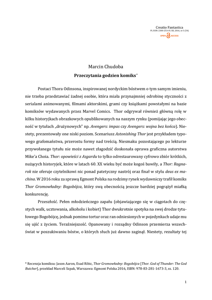 Creatio Fantastica PL ISSN: 2300-2514 R. XII, 2016, nr 3 (54) Marcin Chudoba Przeczytania godzien komiks ∗ Postaci Thora Odinsona, inspirowanej nordyckim bóstwem o tym samym imieniu, nie trzeba przedstawiać żadnej osobie, która miała przynajmniej odrobinę styczności z serialami animowanymi, filmami aktorskimi, grami czy książkami powstałymi na bazie komiksów wydawanych przez Marvel Comics. Thor odgrywał również główną rolę w kilku historyjkach obrazkowych opublikowanych na naszym rynku (pomijając jego obec- ność w tytułach „drużynowych” np. Avengers: impas czy Avengers: wojna bez końca). Nie- stety, prezentowały one niski poziom. Scenariusz Astonishing Thor jest przykładem typowego grafomaństwa, przerostu formy nad treścią. Niesmaku pozostającego po lekturze przywołanego tytułu nie może nawet złagodzić doskonała oprawa graficzna autorstwa Mike’a Choia. Thor: opowieści z Asgardu to tylko odrestaurowany cyfrowo zbiór krótkich, nużących historyjek, które w latach 60. XX wieku być może kogoś bawiły, a Thor: Ragnarok nie oferuje czytelnikowi nic ponad patetyczny nastrój oraz finał w stylu deus ex machina. W 2016 roku za sprawą Egmont Polska na rodzimy rynek wydawniczy trafił komiks Thor Gromowładny: Bogobójca, który swą obecnością jeszcze bardziej pogrążył miałką konkurencję. Przeszłość. Pełen młodzieńczego zapału (objawiającego się w ciągotach do czę- stych walk, ucztowania, alkoholu i kobiet) Thor dwukrotnie spotyka na swej drodze tytu- łowego Bogobójcę, jednak pomimo tortur oraz ran odniesionych w pojedynkach udaje mu się ujść z życiem. Teraźniejszość. Opanowany i rozsądny Odinson przemierza wszechświat w poszukiwaniu bóstw, o których słuch już dawno zaginął. Niestety, rezultaty tej * Recenzja komiksu: Jason Aaron, Esad Ribic, Thor Gromowładny: Bogobójca [Thor. God of Thunder: The God Butcher], przekład Marceli Szpak, Warszawa: Egmont Polska 2016, ISBN: 978-83-281-1673-3, ss. 120. 1 wyprawy są bardzo szokujące dla głównego bohatera. Jedyne, co odnajduje Gromowładny, to zwłoki poległych bogów strzeżone przez sługi mężczyzny, którego poznał ty- siące lat temu. Odległa przyszłość. Król Thor jest władcą i ostatnim mieszkańcem upadłego Asgardu. Kiedy przychodzi mu zmierzyć się z armią Bogobójcy, pomimo zgorzknie- nia czającego się w jego sercu jak zwykle staje do walki. Jednak, czy aby na pewno pragnie właśnie tego? Recenzowana publikacja wciąga już od pierwszych stron i nie pozwala czytelni- kowi na przerwanie lektury. Pierwszy element odpowiedzialny za ów stan rzeczy to scenariusz autorstwa Jasona Aarona, znanego w Polsce m. in. dzięki komiksom X-Men: roz- łam, Skalp czy Bękarty z południa. Historia przedstawiona przez amerykańskiego twórcę rozgrywa się naprzemiennie w jednej z trzech różnych płaszczyzn czasowych i porusza tematykę egzystencjalną. Czy nasza przyszłość zależy od tego, jacy jesteśmy tu i teraz? Jak bardzo to, co robiliśmy w przeszłości, może wpłynąć na naszą teraźniejszość? Odpowiedzi na te pytania należy szukać w trakcie obserwacji poczynań trzech różnych Thorów. W warstwie fabularnej równie istotną rolę odgrywa klimat rodem z kryminałów czy thrille- rów. Tajemnica tożsamości Bogobójcy oraz motywy, którymi się kieruje, odkrywane są przed czytelnikiem stopniowo, z odpowiednią dozą napięcia. Historia rozwija się wła- snym tempem i na całe szczęście nie gna na łeb na szyję. Nie zabrakło również kilku pojedynków. Drugim z elementów, które przyczyniły się do wybitności omawianego komiksu, jest oprawa graficzna autorstwa Esada Ribica. Szczegółowe, malownicze, zachwycające oraz bardzo realistyczne prace są znakiem rozpoznawczym chorwackiego rysownika. Ribic doskonale wywiązał się z postawionego mu zadania i stworzył nastrojowe ilustracje, które potęgują emocje czytelnika (zwłaszcza w trakcie odkrywania kolejnych szokujących faktów), jak również nadają całej historii baśniowego klimatu. Polskie wydanie Thora Gromowładnego nie różni się w żaden sposób od innych komiksów Marvel Comics opublikowanych przez Egmont Polska. Standardowo album wydrukowano na kredowym papierze, a jego okładka jest miękka. Na skrzydełkach tejże znajdują się informacje na temat autorów komiksu, spis dotychczasowo wydanych tytu- łów Marvel Comics oraz lista nadchodzących premier. Jedenaście stron poświęcono na galerię okładek alternatywnych pochodzących z amerykańskiej wersji zeszytowej, ko- lejne cztery zawierają rysunki ze szkicownika Esada Ribica. Na ostatniej stronicy znajdziemy zapowiedź kolejnego tomu, noszącego podtytuł Boża bomba. 2 Thor Gromowładny: Bogobójca to komiks bardzo dobry, który wybija się na tle in- nych, nijakich opowieści o Odinsonie, jak również większości publikacji z gatunku superhero wydawanych na polskim rynku. Wszystkie elementy recenzowanego albumu dosko- nale się uzupełniają, w wyniku czego trudno jest mu cokolwiek zarzucić. Miłośnicy baśniowych, mitycznych opowieści z nutką kryminalnej intrygi, jak również zwykli czytel- nicy z pewnością będą zadowoleni z lektury. Dla fanów Thora jest to natomiast pozycja obowiązkowa. 3