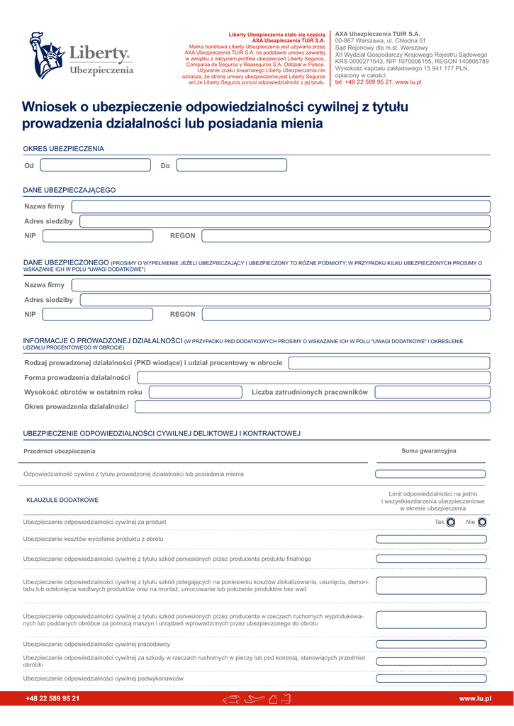 Liberty Ubezpieczenia stało się częścią AXA Ubezpieczenia TUiR S.A. Marka handlowa Liberty Ubezpieczenia jest używana przez AXA Ubezpieczenia TUiR S.A. na podstawie umowy zawartej w związku z nabyciem portfela ubezpieczeń Liberty Seguros, Compania de Seguros y Reaseguros S.A. Oddział w Polsce. Używanie znaku towarowego Liberty Ubezpieczenia nie oznacza, że stroną umowy ubezpieczenia jest Liberty Seguros ani że Liberty Seguros ponosi odpowiedzialność z jej tytułu. AXA Ubezpieczenia TUiR S.A. 00-867 Warszawa, ul. Chłodna 51 Sąd Rejonowy dla m.st. Warszawy XII Wydział Gospodarczy Krajowego Rejestru Sądowego KRS 0000271543, NIP 1070006155, REGON 140806789 Wysokość kapitału zakładowego 15 941 177 PLN, opłacony w całości. tel. +48 22 589 95 21, www.lu.pl Wniosek o ubezpieczenie odpowiedzialności cywilnej z tytułu prowadzenia działalności lub posiadania mienia OKRES UBEZPIECZENIA Od Do DANE UBEZPIECZAJĄCEGO Nazwa firmy Adres siedziby NIP REGON DANE UBEZPIECZONEGO (PROSIMY O WYPEŁNIENIE JEŻELI UBEZPIECZAJĄCY I UBEZPIECZONY TO RÓŻNE PODMIOTY; W PRZYPADKU KILKU UBEZPIECZONYCH PROSIMY O WSKAZANIE ICH W POLU "UWAGI DODATKOWE") Nazwa firmy Adres siedziby NIP REGON INFORMACJE O PROWADZONEJ DZIAŁALNOŚCI (W PRZYPADKU PKD DODATKOWYCH PROSIMY O WSKAZANIE ICH W POLU "UWAGI DODATKOWE" I OKREŚLENIE UDZIAŁU PROCENTOWEGO W OBROCIE) Rodzaj prowadzonej działalności (PKD wiodące) i udział procentowy w obrocie Forma prowadzenia działalności Wysokość obrotów w ostatnim roku Liczba zatrudnionych pracowników Okres prowadzenia działalności UBEZPIECZENIE ODPOWIEDZIALNOŚCI CYWILNEJ DELIKTOWEJ I KONTRAKTOWEJ Przedmiot ubezpieczenia Suma gwarancyjna Odpowiedzialność cywilna z tytułu prowadzonej działalności lub posiadania mienia KLAUZULE DODATKOWE Ubezpieczenie odpowiedzialności cywilnej za produkt Limit odpowiedzialności na jedno i wszystkiezdarzenia ubezpieczeniowe w okresie ubezpieczenia Tak Nie Ubezpieczenie kosztów wycofania produktu z obrotu Ubezpieczenie odpowiedzialności cywilnej z tytułu szkód poniesionych przez producenta produktu finalnego Ubezpieczenie odpowiedzialności cywilnej z tytułu szkód polegających na poniesieniu kosztów zlokalizowania, usunięcia, demontażu lub odsłonięcia wadliwych produktów oraz na montaż, umocowanie lub położenie produktów bez wad Ubezpieczenie odpowiedzialności cywilnej z tytułu szkód poniesionych przez producenta w rzeczach ruchomych wyprodukowanych lub poddanych obróbce za pomocą maszyn i urządzeń wprowadzonych przez ubezpieczonego do obrotu Ubezpieczenie odpowiedzialności cywilnej pracodawcy Ubezpieczenie odpowiedzialności cywilnej za szkody w rzeczach ruchomych w pieczy lub pod kontrolą, stanowiących przedmiot obróbki Ubezpieczenie odpowiedzialności cywilnej podwykonawców +48 22 589 95 21 www.lu.pl Ubezpieczenie odpowiedzialności cywilnej za szkody w środowisku Ubezpieczenie odpowiedzialności cywilnej wzajemnej Ubezpieczenie odpowiedzialności cywilnej z tytułu czystych strat finansowych Rozszerzenie zakresu terytorialnego poza terytorium RP W PRZYPADKU ROZSZERZENIA OCHRONY UBEZPIECZENIOWEJ O ODPOWIEDZIALNOŚĆ CYWILNĄ ZA PRODUKT PROSIMY O PODANIE DODATKOWYCH INFORMACJI Tak Rodzaj prowadzonej działalności Nie Produkcja Sprzedaż detaliczna Sprzedaż hurtowa Import Kraje wytworzenia produktu Export PLN Planowany obrót w okresie ubezpieczenia w tym export do: UE, Rosji, Szwajcarii, Norwegii PLN USA, Kanady, Australii, Nowej Zelandii PLN Pozostałych krajów PLN Liczba zakładów produkcyjnych Jak długo produkt jest obecny na rynku Czy Ubezpieczony posiada aktywny certyfikat zarządzania jakością ISO? RODZAJ PRODUKTÓW WPROWADZANYCH DO OBROTU Nazwa produktu Opis użycia/zastosowania Rodzaj produkcji W przypadku produkcji seryjnej, prosimy o podanie wielkości serii Tak Nie Czy produkty sprzedawane są z instrukcją obsługi, datą przydatności, gwarancją? Tak Nie Czy produkty podlegają i spełniają wymogi właściwych norm bezpieczeństwa? Tak Nie Czy w okresie ostatnich 3 lat wprowadzono nowe produkty? Tak Nie Czy w ciągu ostatnich 5 lat została przerwana produkcja jakichkolwiek wyrobów lub nastąpiło ich wycofanie z rynku? Tak Nie Czy produkty wykorzystywane są jako część składowa innego produktu finalnego? Jakiego produktu finalnego? Kto jest potencjalnym nabywcą produktu? +48 22 589 95 21 www.lu.pl DOTYCHCZASOWY PRZEBIEG UBEZPIECZENIA Poprzedni Ubezpieczyciel Liczba szkód w okresie ostatnich 5 lat Liczba bezszkodowych lat ubezpieczenia Informacje dodatkowe o szkodach i roszczeniach (rok wystąpienia, przyczyna, wartość odszkodowania) LICZBA RAT, POSTANOWIENIA DODATKOWE Liczba rat Uwagi dodatkowe (miejsce na uwagi, opisy, wnioskowane rozszerzenia zakresu, dodanie Ubezpieczonych, PKD, itp.) OŚWIADCZENIA I PODPISY (OŚWIADCZENIE 2 ORAZ 3 DOTYCZY WYŁĄCZNIE OSÓB FIZYCZNYCH) 1. Oświadczam, że dane zawarte w niniejszym wniosku są prawdziwe, zgodne z moją wiedzą. Przed sporządzeniem wniosku otrzymałem/am Ogólne Warunki Ubezpieczenia odpowiedzialności cywilnej Liberty zatwierdzone uchwałą AXA Ubezpieczenia TUiR S.A. z dnia 30 sierpnia 2016 r., które mają zastosowanie do umowy ubezpieczenia i zapoznałem/am się z ich treścią. 2. Oświadczam, że zostałem poinformowany/a, iż administratorem danych osobowych jest AXA Ubezpieczenia Towarzystwo Ubezpieczeń i Reasekuracji S.A., ul. Chłodna 51, 00-867 Warszawa. Dane osobowe będą przetwarzane w celu podjęcia działań przed zawarciem umowy ubezpieczenia, wykonania umowy ubezpieczenia oraz wypełnienia prawnie usprawiedliwionych celów administratora danych (w szczególności przekazywania informacji o oferowanych produktach i usługach). Podanie danych jest dobrowolne. Osobie, której dane dotyczą przysługuje prawo dostępu do treści swoich danych oraz ich poprawienia. 3. Wyrażam zgodę na posłużenie się przez AXA Ubezpieczenia TUiR S.A. telefonem, automatycznym systemem wywołującym, a tak