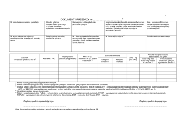 Załączniki do rozporządzenia Ministra Rolnictwa i Rozwoju Wsi z dnia………2013 r. (poz. …..) Załącznik nr 1 WZÓR DOKUMENT SPRZEDAŻY nr:………………………………1) Nr formularza dokumentu sprzedaży Oznaka rybacka i nazwa statku rybackiego, z którego dokonano wyładunku produktów rybnych Nazwa portu i data wyładunku produktów rybnych Imię i nazwisko kapitana lub armatora albo nazwa armatora statku rybackiego oraz nazwa podmiotu, który przejął produkty rybne przed dokonaniem sprzedaży (jeżeli miało miejsce przejęcie produktów rybnych) Imię i nazwisko albo nazwa nabywcy produktów rybnych oraz numer jego identyfikacji podatkowej (NIP) Nr wpisu nabywcy w rejestrze przedsiębiorców skupujących produkty rybne Data i miejsce sprzedaży produktów rybnych Nr i data wystawienia faktury albo rachunku lub data zawarcia umowy sprzedaży, jeżeli została zawarta w formie pisemnej Nr deklaracji przejęcia 2) Nr dokumentu przewozowego Gatunek i kod postaci produktu alfa-3 3) 1) 2) 3) 4) 5) Kod alfa-3 FAO Rejon połowu (obszar geograficzny) Masa w kg albo masa w kg i liczba w sztukach 4) Standardy rynkowe kategoria świeżości kategoria wielkości Cena 1 kg (bez VAT) Produkty niewprowadzane bezpośrednio na rynek Masa w kg albo Przeznaczenie masa w kg i liczba produktów rybnych 4) w sztukach wycofanych z rynku 5) Numer nadany przez nabywcę produktów rybnych. Numer deklaracji przejęcia należy podać w przypadku przejęcia produktów rybnych przed dokonaniem ich sprzedaży. Według tabeli I załącznika I do rozporządzenia wykonawczego Komisji (UE) Nr 404/2011 z dnia 8 kwietnia 2011 r. ustanawiającego szczegółowe przepisy wykonawcze do rozporządzenia Rady (WE) nr 1224/2009 ustanawiającego wspólnotowy system kontroli w celu zapewnienia przestrzegania przepisów wspólnej polityki rybołówstwa (Dz.Urz. L 112 z 30.4.2011, str. 1). W sztukach podaje się ryby łososiowate. Należy wpisać odpowiednio: FMEAL - wykorzystanie po przetworzeniu na mączkę (karma dla zwierząt), OTHER - wykorzystanie w stanie świeżym lub zakonserwowanym (karma dla zwierząt). NOALIM - wykorzystanie do celów innych niż jako karma dla zwierząt, DIST - swobodna dystrybucja, BAIT – przynęta. Czytelny podpis sprzedającego ………………………………………………….. Czytelny podpis kupującego ………………………………………………….. Opis: dokument sprzedaży produktów rybnych jest wykonany na papierze samokopiującym i ma format A4. 2
