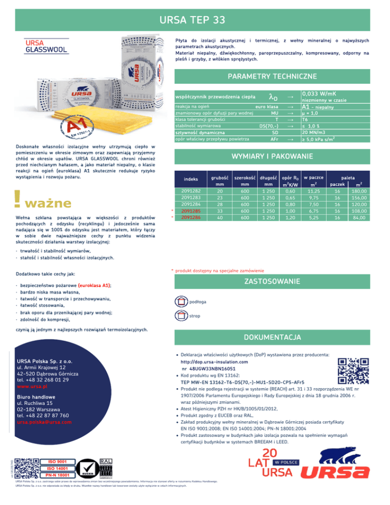 URSA TEP 33 Płyta do izolacji akustycznej i termicznej, z wełny mineralnej o najwyższych parametrach akustycznych. Materiał niepalny, dźwiękochłonny, paroprzepuszczalny, kompresowany, odporny na pleśń i grzyby, z włókien sprężystych. PARAMETRY TECHNICZNE D współczynnik przewodzenia ciepła reakcja na ogień znamionowy opór dyfuzji pary wodnej klasa tolerancji grubości stabilność wymiarowa sztywność dynamiczna opór właściwy przepływu powietrza Doskonałe własności izolacyjne wełny utrzymują ciepło w pomieszczeniu w okresie zimowym oraz zapewniają przyjemny chłód w okresie upałów. URSA GLASSWOOL chroni również przed niechcianym hałasem, a jako materiał niepalny, o klasie reakcji na ogień (euroklasa) A1 skutecznie redukuje ryzyko wystąpienia i rozwoju pożaru. ! ważne Wełna szklana powstająca w większości z produktów pochodzących z odzysku (recyklingu) i jedocześnie sama nadająca się w 100% do odzysku jest materiałem, który łączy w sobie dwie najważniejsze cechy z punktu widzenia skuteczności działania warstwy izolacyjnej: euro klasa MU T DS(70,-) SD AFr → → → → → → 0,033 W/mK niezmienny w czasie A1 - niepalny μ ≈ 1,0 T6 ≤ 1,0 % 20 MN/m3 ≥ 5,0 kPa s/m2 WYMIARY I PAKOWANIE indeks * * grubość mm szerokość długość mm mm opór RD w paczce m 11,25 9,75 7,50 6,75 5,25 2091282 20 600 1 250 m2K/W 0,60 2091283 2091284 2091285 2091286 23 28 33 40 600 600 600 600 1 250 1 250 1 250 1 250 0,65 0,80 1,00 1,20 2 paleta 2 paczek m 16 180,00 16 16 16 16 156,00 120,00 108,00 84,00 · trwałość i stabilność wymiarów, · stałość i stabilność własności izolacyjnych. Dodatkowo takie cechy jak: * produkt dostępny na specjalne zamówienie ZASTOSOWANIE · bezpieczeństwo pożarowe (euroklasa A1); · bardzo niska masa własna, · łatwość w transporcie i przechowywaniu, · łatwość stosowania, podłoga · brak oporu dla przenikającej pary wodnej; strop · zdolność do kompresji, czynią ją jednym z najlepszych rozwiązań termoizolacyjnych. DOKUMENTACJA • Deklaracja właściwości użytkowych (DoP) wystawiona przez producenta: URSA Polska Sp. z o.o. ul. Armii Krajowej 12 42-520 Dąbrowa Górnicza tel. +48 32 268 01 29 www.ursa.pl ver.1812017MD Biuro handlowe ul. Ruchliwa 15 02-182 Warszawa tel. +48 22 87 87 760 [email protected] http://dop.ursa-insulation.com nr 48UGW33NBN16051 • Kod produktu wg EN 13162: TEP MW-EN 13162-T6-DS(70,-)-MU1-SD20-CP5-AFr5 • Produkt nie podlega rejestracji w systemie (REACH) art. 31 i 33 rozporządzenia WE nr 1907/2006 Parlamentu Europejskiego i Rady Europejskiej z dnia 18 grudnia 2006 r. wraz późniejszymi zmianami. • Atest Higieniczny PZH nr HK/B/1005/01/2012, • Produkt zgodny z EUCEB oraz RAL, • Zakład produkcyjny wełny mineralnej w Dąbrowie Górniczej posiada certyfikaty EN ISO 9001:2008; EN ISO 14001:2004; PN-N 18001:2004 • Produkt zastosowany w budynkach jako izolacja pozwala na spełnienie wymagań certyfikacji budynków w systemach BREEAM i LEED. ISO 9001 ISO 14001 PN-N 18001 URSA Polska Sp. z o.o. zastrzega sobie prawo do wprowadzenia zmian bez wcześniejszego powiadomienia. Informacja nie stanowi oferty w rozumieniu Kodeksu Handlowego. URSA Polska Sp. z o.o. nie odpowiada za błędy w druku. Wszelkie nazwy handlowe lub towarowe zostały użyte wyłącznie w celach informacyjnych. URSA TEP 33 Płyta do izolacji akustycznej i termicznej, z wełny mineralnej o najwyższych parametrach akustycznych. Materiał niepalny, dźwiękochłonny, paroprzepuszczalny, kompresowany, odporny na pleśń i grzyby, z włókien sprężystych. MATERIAŁY DODATKOWE • folie izolacyjne na i pod warstwę płyt URSA TEP • taśma URSA TRS do izolacji obwodowej podłogi pływającej • siatka zbrojeniowa ZALECENIA MONTAŻOWE • Krok 1 Przed przystąpieniem do montażu powierzchnia stropu powinna być dokładnie oczyszczona i jeżeli potrzeba, wyrównana przez zastosowanie suchej podsypki lub wylanie wyrównującej warstwy betonu. • Krok 2 Celem zabezpieczenia izolacji przed wilgocią technologiczną ze stropów nowo wzniesionych, należy przed ułożeniem płyt, położyć izolację z folii izolacyjnej o grubości 0,2 mm. Brzegi izolacji muszą wystawać ponad poziom podłogi. Pasy folii tworzą zakładkę o szerokości 3040 cm, a ich brzegi powinny być zaklejone taśmą dwustronnie klejącą. • Krok 3 Dla uniknięcia mostków termicznych i akustycznych należy wzdłuż ścian ułożyć taśmę izolacyjną URSA TRS zapobiegającą przenoszeniu drgań. • Krok 4 Następnie układane są płyty URSA TEP w taki sposób, aby ich krawędzie ściśle do siebie przylegały. Układamy je w jednej warstwie. • Krok 5 Płyty izolacyjne należy zabezpieczyć przed wilgocią z wylewki betonowej przez pokrycie ich (z zakładami) folią izolacyjną. Minimalna grubość wylewki wynosi 40 mm należy ją zazbroić stalową siatką. • UWAGI: Instalacja ogrzewania podłogowego powinna być układana bezpośrednio na płytach izolacyjnych URSA TEP. Możliwe jest stosowanie samopoziomujących wylewek anhydrytowych lub cementowych. Nie wolno stosować z izolacji z dwóch lub więcej warstw płyt URSA leżących na sobie. ver.1812017MD PRODUKTY KOPLEMENTARNE index grubość mm 2093438 22 115 15 000 2093446 22 65 15 000 ISO 9001 ISO 14001 PN-N 18001 URSA Polska Sp. z o.o. zastrzega sobie prawo do wprowadzenia zmian bez wcześniejszego powiadomienia. Informacja nie stanowi oferty w rozumieniu Kodeksu Handlowego. URSA Polska Sp. z o.o. nie odpowiada za błędy w druku. Wszelkie nazwy handlowe lub towarowe zostały użyte wyłącznie w celach informacyjnych. szerokość długość mm mm opis URSA TRS taśma do izolacji obwodowej