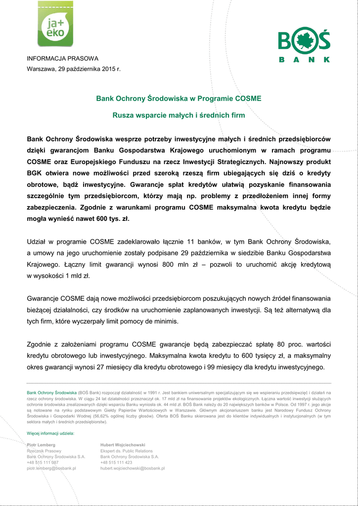 INFORMACJA PRASOWA Warszawa, 29 października 2015 r. Bank Ochrony Środowiska w Programie COSME Rusza wsparcie małych i średnich firm Bank Ochrony Środowiska wesprze potrzeby inwestycyjne małych i średnich przedsiębiorców dzięki gwarancjom Banku Gospodarstwa Krajowego uruchomionym w ramach programu COSME oraz Europejskiego Funduszu na rzecz Inwestycji Strategicznych. Najnowszy produkt BGK otwiera nowe możliwości przed szeroką rzeszą firm ubiegających się dziś o kredyty obrotowe, bądź inwestycyjne. Gwarancje spłat kredytów ułatwią pozyskanie finansowania szczególnie tym przedsiębiorcom, którzy mają np. problemy z przedłożeniem innej formy zabezpieczenia. Zgodnie z warunkami programu COSME maksymalna kwota kredytu będzie mogła wynieść nawet 600 tys. zł. Udział w programie COSME zadeklarowało łącznie 11 banków, w tym Bank Ochrony Środowiska, a umowy na jego uruchomienie zostały podpisane 29 października w siedzibie Banku Gospodarstwa Krajowego. Łączny limit gwarancji wynosi 800 mln zł – pozwoli to uruchomić akcję kredytową w wysokości 1 mld zł. Gwarancje COSME dają nowe możliwości przedsiębiorcom poszukujących nowych źródeł finansowania bieżącej działalności, czy środków na uruchomienie zaplanowanych inwestycji. Są też alternatywą dla tych firm, które wyczerpały limit pomocy de minimis. Zgodnie z założeniami programu COSME gwarancje będą zabezpieczać spłatę 80 proc. wartości kredytu obrotowego lub inwestycyjnego. Maksymalna kwota kredytu to 600 tysięcy zł, a maksymalny okres gwarancji wynosi 27 miesięcy dla kredytu obrotowego i 99 miesięcy dla kredytu inwestycyjnego. Bank Ochrony Środowiska (BOŚ Bank) rozpoczął działalność w 1991 r. Jest bankiem uniwersalnym specjalizującym się we wspieraniu przedsięwzięć i działań na rzecz ochrony środowiska. W ciągu 24 lat działalności przeznaczył ok. 17 mld zł na finansowanie projektów ekologicznych. Łączna wartość inwestycji służących ochronie środowiska zrealizowanych dzięki wsparciu Banku wyniosła ok. 44 mld zł. BOŚ Bank należy do 20 największych banków w Polsce. Od 1997 r. jego akcje są notowane na rynku podstawowym Giełdy Papierów Wartościowych w Warszawie. Głównym akcjonariuszem banku jest Narodowy Fundusz Ochrony Środowiska i Gospodarki Wodnej (56,62% ogólnej liczby głosów). Oferta BOŚ Banku skierowana jest do klientów indywidualnych i instytucjonalnych (w tym sektora małych i średnich przedsiębiorstw). Więcej informacji udziela: Piotr Lemberg Rzecznik Prasowy Bank Ochrony Środowiska S.A. +48 515 111 087 [email protected] Hubert Wojciechowski Ekspert ds. Public Relations Bank Ochrony Środowiska S.A. +48 515 111 423 [email protected] Zachętą dla przedsiębiorców jest brak konieczności zastawiania własnego majątku, niska prowizja za udzielenie gwarancji oraz uproszczone procedury – wniosek o udzielenie gwarancji banki przyjmą w momencie składania wniosku kredytowego. O programie na rzecz konkurencyjności przedsiębiorstw oraz małych i średnich przedsiębiorstw (COSME) COSME to program Unii Europejskiej na rzecz konkurencyjności oraz małych i średnich przedsiębiorstw przewidziany na lata 2014–2020. Z całkowitym budżetem na poziomie 2,3 mld euro COSME pobudza akcję kredytową i inwestycje kapitałowe dla małych i średnich przedsiębiorstw w Europie. COSME wspiera gwarancje oraz regwarancje na rzecz instytucji finansowych w celu udzielenia im pomocy w zwiększeniu akcji kredytowej oraz finansowania leasingu na rzecz małych i średnich przedsiębiorstw. Program ten obejmuje również sekurytyzację portfeli finansowania dłużnego małych i średnich przedsiębiorstw. COSME inwestuje również w fundusze kapitałowe podwyższonego ryzyka na rzecz małych i średnich przedsiębiorstw, głównie na etapie ekspansji i wzrostu. www.access2finance.eu Bank Ochrony Środowiska (BOŚ Bank) rozpoczął działalność w 1991 r. Jest bankiem uniwersalnym specjalizującym się we wspieraniu przedsięwzięć i działań na rzecz ochrony środowiska. W ciągu 24 lat działalności przeznaczył ok. 17 mld zł na finansowanie projektów ekologicznych. Łączna wartość inwestycji służących ochronie środowiska zrealizowanych dzięki wsparciu Banku wyniosła ok. 44 mld zł. BOŚ Bank należy do 20 największych banków w Polsce. Od 1997 r. jego akcje są notowane na rynku podstawowym Giełdy Papierów Wartościowych w Warszawie. Głównym akcjonariuszem banku jest Narodowy Fundusz Ochrony Środowiska i Gospodarki Wodnej (56,62% ogólnej liczby głosów). Oferta BOŚ Banku skierowana jest do klientów indywidualnych i instytucjonalnych (w tym sektora małych i średnich przedsiębiorstw). Więcej informacji udziela: Piotr Lemberg Rzecznik Prasowy Bank Ochrony Środowiska S.A. +48 515 111 087 [email protected] Hubert Wojciechowski Ekspert ds. Public Relations Bank Ochrony Środowiska S.A. +48 515 111 423 [email protected]