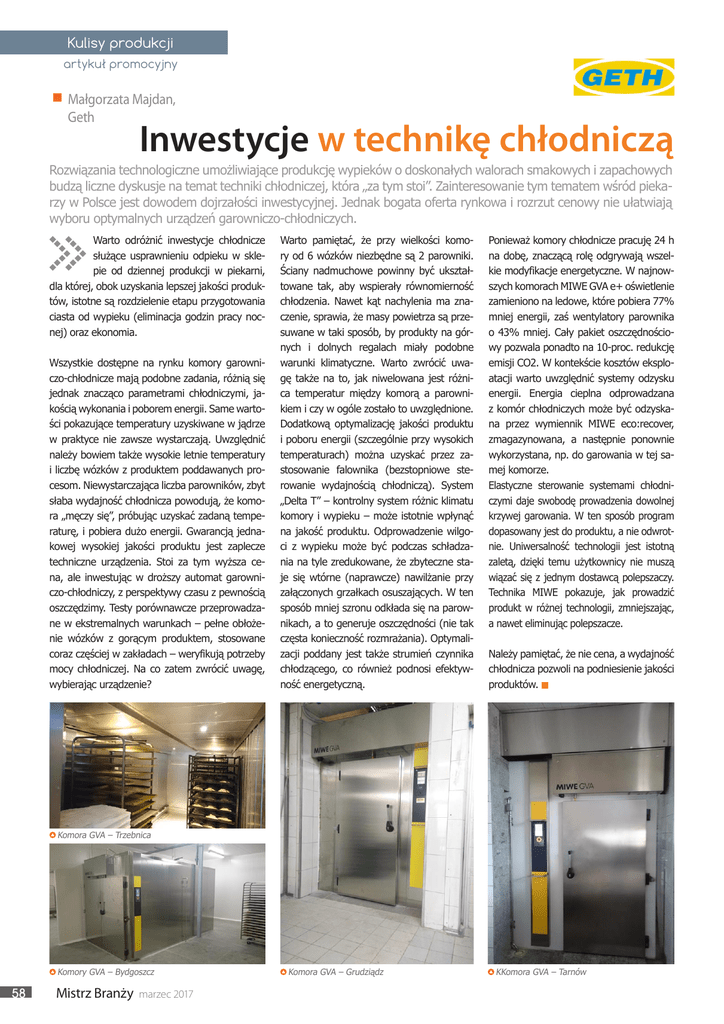Kulisy produkcji artykuł promocyjny Małgorzata Majdan, Geth Inwestycje w technikę chłodniczą Rozwiązania technologiczne umożliwiające produkcję wypieków o doskonałych walorach smakowych i zapachowych budzą liczne dyskusje na temat techniki chłodniczej, która „za tym stoi”. Zainteresowanie tym tematem wśród piekarzy w Polsce jest dowodem dojrzałości inwestycyjnej. Jednak bogata oferta rynkowa i rozrzut cenowy nie ułatwiają wyboru optymalnych urządzeń garowniczo-chłodniczych. Warto odróżnić inwestycje chłodnicze służące usprawnieniu odpieku w sklepie od dziennej produkcji w piekarni, dla której, obok uzyskania lepszej jakości produktów, istotne są rozdzielenie etapu przygotowania ciasta od wypieku (eliminacja godzin pracy nocnej) oraz ekonomia. Wszystkie dostępne na rynku komory garowniczo-chłodnicze mają podobne zadania, różnią się jednak znacząco parametrami chłodniczymi, jakością wykonania i poborem energii. Same wartości pokazujące temperatury uzyskiwane w jądrze w praktyce nie zawsze wystarczają. Uwzględnić należy bowiem także wysokie letnie temperatury i liczbę wózków z produktem poddawanych procesom. Niewystarczająca liczba parowników, zbyt słaba wydajność chłodnicza powodują, że komora „męczy się”, próbując uzyskać zadaną temperaturę, i pobiera dużo energii. Gwarancją jednakowej wysokiej jakości produktu jest zaplecze techniczne urządzenia. Stoi za tym wyższa cena, ale inwestując w droższy automat garowniczo-chłodniczy, z perspektywy czasu z pewnością oszczędzimy. Testy porównawcze przeprowadzane w ekstremalnych warunkach – pełne obłożenie wózków z gorącym produktem, stosowane coraz częściej w zakładach – weryfikują potrzeby mocy chłodniczej. Na co zatem zwrócić uwagę, wybierając urządzenie? Warto pamiętać, że przy wielkości komory od 6 wózków niezbędne są 2 parowniki. Ściany nadmuchowe powinny być ukształtowane tak, aby wspierały równomierność chłodzenia. Nawet kąt nachylenia ma znaczenie, sprawia, że masy powietrza są przesuwane w taki sposób, by produkty na górnych i dolnych regalach miały podobne warunki klimatyczne. Warto zwrócić uwagę także na to, jak niwelowana jest różnica temperatur między komorą a parownikiem i czy w ogóle zostało to uwzględnione. Dodatkową optymalizację jakości produktu i poboru energii (szczególnie przy wysokich temperaturach) można uzyskać przez zastosowanie falownika (bezstopniowe sterowanie wydajnością chłodniczą). System „Delta T” – kontrolny system różnic klimatu komory i wypieku – może istotnie wpłynąć na jakość produktu. Odprowadzenie wilgoci z wypieku może być podczas schładzania na tyle zredukowane, że zbyteczne staje się wtórne (naprawcze) nawilżanie przy załączonych grzałkach osuszających. W ten sposób mniej szronu odkłada się na parownikach, a to generuje oszczędności (nie tak częsta konieczność rozmrażania). Optymalizacji poddany jest także strumień czynnika chłodzącego, co również podnosi efektywność energetyczną. Ponieważ komory chłodnicze pracuję 24 h na dobę, znaczącą rolę odgrywają wszelkie modyfikacje energetyczne. W najnowszych komorach MIWE GVA e+ oświetlenie zamieniono na ledowe, które pobiera 77% mniej energii, zaś wentylatory parownika o 43% mniej. Cały pakiet oszczędnościowy pozwala ponadto na 10-proc. redukcję emisji CO2. W kontekście kosztów eksploatacji warto uwzględnić systemy odzysku energii. Energia cieplna odprowadzana z komór chłodniczych może być odzyskana przez wymiennik MIWE eco:recover, zmagazynowana, a następnie ponownie wykorzystana, np. do garowania w tej samej komorze. Elastyczne sterowanie systemami chłodniczymi daje swobodę prowadzenia dowolnej krzywej garowania. W ten sposób program dopasowany jest do produktu, a nie odwrotnie. Uniwersalność technologii jest istotną zaletą, dzięki temu użytkownicy nie muszą wiązać się z jednym dostawcą polepszaczy. Technika MIWE pokazuje, jak prowadzić produkt w różnej technologii, zmniejszając, a nawet eliminując polepszacze. Należy pamiętać, że nie cena, a wydajność chłodnicza pozwoli na podniesienie jakości produktów. Komora GVA – Trzebnica Komory GVA – Bydgoszcz 58 Mistrz Branży marzec 2017 Komora GVA – Grudziądz KKomora GVA – Tarnów