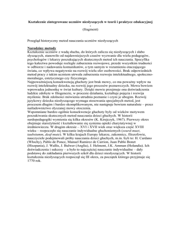 Kształcenie zintegrowane uczniów niesłyszących w teorii i praktyce edukacyjnej (fragment) Przegląd historyczny metod nauczania uczniów niesłyszących Narodziny metody Kształcenie uczniów z wadą słuchu, do których zalicza się niesłyszących i słabo słyszących, stanowiło od najdawniejszych czasów wyzwanie dla wielu pedagogów, psychologów i lekarzy poszukujących skutecznych metod ich nauczania. Specyfika tego kalectwa powoduje rozległe zaburzenia rozwojowe, przede wszystkim trudności w odbiorze i nadawaniu komunikatów, a tym samym w rozumieniu otaczającego świata, co wpływa negatywnie na rozwój wielu sfer osobowości. Brak odpowiednich metod pracy z takim uczniem utrwala zaburzenia rozwoju intelektualnego, społecznomoralnego, estetycznego czy fizycznego. Najpoważniejszą konsekwencją głuchoty jest brak mowy, co ma poważny wpływ na rozwój intelektualny dziecka, na rozwój jego procesów poznawczych. Mowa bowiem wprowadza jednostkę w świat kultury. Dzięki mowie przejmuje ona doświadczenia ludzkie zdobyte w filogenezie, w procesie działania, kształtuje pojęcia i rozwija myślenie. Brak zdolności mówienia utrudnia poznanie i czyni je ubogim. Rozwój językowy dziecka niesłyszącego wymaga stosowania specjalnych metod, jest procesem długim i bardzo skomplikowanym, nie następuje bowiem naturalnie – przez naśladownictwo słyszanej mowy otoczenia. Wspomniane bardzo ogólnie konsekwencje głuchoty były od wieków motywem poszukiwania skutecznych metod nauczania dzieci głuchych. W historii surdopedagogiki wymienia się kilka okresów (K. Kirejczyk, 1967). Pierwszy okres obejmuje starożytność i kształtowanie się systemu opieki charytatywnej w średniowieczu. W drugim okresie – XVI i XVII wiek oraz większa część XVIII wieku – rozpoczęło się nauczanie indywidualne głuchoniemych (sourd-muet, taubstumm, deaf-mute). W kilku krajach Europy lekarze, zakonnicy, filozofowie, nauczyciele podejmowali próby nauczania dzieci głuchych, m.in. byli to: H. Cardano (Włochy), Pablo de Ponce, Manuel Ramirez de Carrion, Juan Pablo Bonet (Hiszpania), J. Wallis, J. Bulwer (Anglia), J. Helmont, J.K. Amman (Holandia). Ich doświadczenia i sukcesy – a było to najczęściej nauczanie indywidualne – dały podstawę do zakładania pierwszych szkół dla dzieci niesłyszących. W historii kształcenia niesłyszących rozpoczął się III okres, za początek którego przyjmuje się 1770 rok.