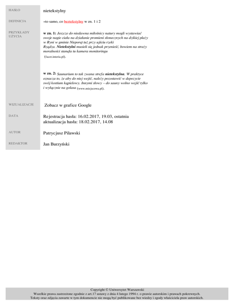 HASŁO nietekstylny DEFINICJA «to samo, co beztekstylny w zn. 1 i 2» PRZYKŁADY UŻYCIA w zn. 1: Jeszcze do niedawna miłośnicy natury mogli wystawiać swoje nagie ciała na działanie promieni słonecznych na dzikiej plaży w Ryni w gminie Nieporęt tuż przy ujściu rzeki Rządza. Nietekstylni musieli się jednak przenieść, bowiem na straży moralności stanęła tu kamera monitoringu (facet.interia.pl). w zn. 2: Saunarium to tak zwana strefa nietekstylna. W praktyce oznacza to, że aby do niej wejść, należy pozostawić w depozycie swój kostium kąpielowy. Innymi słowy – do sauny wolno wejść tylko i wyłącznie na golasa (www.miejscowa.pl). WIZUALIZACJE Zobacz w grafice Google DATA Rejestracja hasła: 16.02.2017, 19.03, ostatnia aktualizacja hasła: 18.02.2017, 14.08 AUTOR Patrycjusz Pilawski REDAKTOR Jan Burzyński Copyright © Uniwersytet Warszawski Wszelkie prawa zastrzeżone zgodnie z art.17 ustawy z dnia 4 lutego 1994 r. o prawie autorskim i prawach pokrewnych. Teksty oraz zdjęcia zawarte w tym dokumencie nie mogą być publikowane bez wiedzy i zgody właściciela praw autorskich. Powered by TCPDF (www.tcpdf.org)
