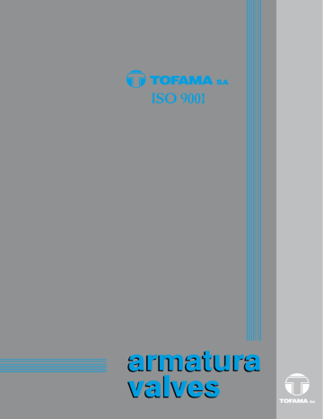 KURKI KULOWE DN 15÷250 OPIS TECHNICZNY Wykonanie konstrukcyjne: Zakres stosowania: Kurki kulowe wykonane są jako armatura pełnoprzelotowa lub o przelocie zredukowanym, gdzie kule są pływające lub podparte, o jednolitej, dwu lub trzyczęściowej konstrukcji korpusów. Oferujemy kurki, które mają przyłącza: – płytkowe - bezkołnierzowe KKAMP – kołnierzowe KKAM, KDM – kołnierzowe z kulą podpartą KDMC – kołnierzowe z płaszczem grzewczym KKAMO – do wspawania KKAMS – gwintowe KKAMG – przeznaczeniu specjalnym KKAM32n, KKAM-100 K/A, Jako armatura odcinająca mogą być przełączane za pomocą: – dźwigni – ręcznie, – przekładni – ręcznie, – napęd elektryczny np.: KKEM , KDE , KKEMO – napęd pneumatyczny np.: KKPM, KDP , KKPMO Kurki kulowe mogą być wyposażone w: – zabezpieczenie przed prądami statycznymi – wyłączniki krańcowe sygnalizujące położenie kurka, – otwór spustowy, – kolumny. Kurki mogą być montowane w rurociągach pionowych lub poziomych w dowolnym położeniu, przy czym powinny pracować tylko w pozycji całkowicie otwartej lub całkowicie zamkniętej. Ciśnienie nominalne: – PN16, PN25, PN40 Temperatura pracy: – od -20 ° C do +160°C – od -20 ° C do +180°C – od -20 ° C do +200°C Maksymalne ciśnienie robocze PS uzależnione jest od temperatury roboczej TS i należy ustalić z wykresów temperatura – ciśnienie zawartych w poszczególnych kartach katalogowych. Wykonania kurków dla innych temperatur wymagają odrębnych uzgodnień. Przeznaczenie Kurki kulowe mogą być stosowane zarówno w instalacjach wewnętrznych jak i zewnętrznych do cieczy agresywnych chemicznie, wody zimnej, gorącej, demineralizowanej, destylowanej, pary wodnej, produktów ropopochodnych, produktów spożywczych oraz innych gazów i cieczy. Wykonanie materiałowe: 1 – chemoodporne (KO) – korpusy odlewane grupa materiałów 14E0 (1.4408), a dla stali grupa 15E0 (1.4571); 2 – zwykłe (węglowe) – korpusy odlewane grupa materiałów 3E0 (1.0619, 1.0425), a dla kuli grupa materiałów 11E0 i trzpienia (1.4028); 3 – chemoodporne (KO Uranus) - korpusy odlewane gat. GX5CrNiMoCuTi25-21-4 i stali 1. 4539 4 – chemoodporne (KO) - korpusy odlewane grupa materiałów 11E0 (1.4308), a dla stali grupa 12E0 (1.4541); Kurki kulowe przeznaczone dla mediów szczególnie agresywnych, powinny być każdorazowo indywidualnie dobierane i opracowywane w zależności od przedstawionych warunków eksploatacyjnych, w szczególności dotyczy to czynnika roboczego, temperatury stosowania oraz ciśnienia. ZAWORY: PRZEPONOWE DN 15÷150 Wykonanie konstrukcyjne i materiałowe: Budowa zaworu ZPB-K jest oparta na dwuczęściowej konstrukcji składającej się z żeliwnego korpusu i nasady. Wewnątrz korpusu znajduje się gumowa wkładka zwana „przeponą”, która jest elementem uszczelniającym zaworu. Zacisk przepony jest uzyskiwany poprzez przesuw dwóch belek pracujących w korpusie: dolnej w górę a górnej w dół. Natomiast ruch belek wywołany jest poprzez obracanie kółkiem. Zamykanie zaworu odbywa się poprzez obracanie kółkiem w prawo. Zawór przeponowy typu ZPA składa się z korpusu i przepony, umieszczonej wewnątrz korpusu, które współpracują ze sobą. Zamykanie zaworu jest realizowane poprzez dociskanie grzybkiem przepony do siedliska korpusu Obustronnie zakończone żeliwnymi kołnierzami zgodnymi z PN-EN 1092-2 Jako armatura odcinająco–regulacyjna przepływ może być sterowana: – kółkiem– ręcznie, – napędem elektrycznym np.: ZPE, ZPB-E – napędem pneumatycznym np.: ZPR, ZPB-P 2 Zakres stosowania: Zawory przeponowe mogą być montowane w rurociągach pionowych lub poziomych w dowolnym położeniu, przy czym powinny pracować na przepływie laminarnym, co znacznie wydłuża czas pracy zaworów, szczególnie, gdy medium zawiera stałe cząsteczki ścierające. Ciśnienie nominalne: PN6, PN10, PN16 Temperatura pracy: ZPA: -5°C ÷ + 65°C ZPB-K: -5°C ÷ +75°C; -5°C ÷ + 110°C Wykonania zaworów przeponowych dla innych temperatur wymagają odrębnych uzgodnień. Przeznaczenie Zawory przeponowe przeznaczone są do pracy jako organ zamykający w instalacjach z takimi mediami, jak: – woda zimna, – woda gorąca, – kwasy, ługi – oleje mineralne – media mocno ścierające,media mocno zanieczyszczone, szlamy Inne media po uzgodnieniu z producentem Edycja I/2011 Polska, 87-100 Toruń, ul. M. Skłodowskiej-Curie 65 tel.: +48 56 619 52 01, fax: +48 56 619 54 31 e-mail: [email protected] www.tofama.eu BALL VALVES DN 15 ÷ 250 TECHNICAL DESCRIPTION Construction execution: Ball valves are made as full flow or reduced flow type with floating or supported balls. Bodies are made as one, two or three parts construction. We offer ball valves with the following connections: – plate-flangeless, type KKAMP – flanged, type KKAM, KDM – flanged with supported ball, type KDMC – flanged with heating jacket, type KKAMO – to be welded, type KKAMS – threaded, type KKAMG – special version, type KKAM32n, KKAM-100K/A The ball valves as cut-off fittings can be operated by: – lever – hand operated, – worm gear – hand operated – electric drive, e.g. KKEM, KDE, KKEMO – pneumatic drive, e.g. KKPM, KDP, KKPMO Range of application Ball valves can be used in any position in vertical or horizontal pipelines. They should work only in position: fully normally opened or fully closed. Nominal pressure: – PN16, PN25, PN40 Working temperature: – from -20°C to +160 °C – from -20°C to +180 °C – from -20°C to +200 °C Max. working pressure PS depends on working temperature TS and should be fixed on the chart „temperature – – pressure”, which is are included in catalogue sheets. The execution of the ball valves for other temperatures needs a separate adjustment. Application The ball valves can be used both in internal and external installations, for chemically aggressive liquids, hot and cold water, de