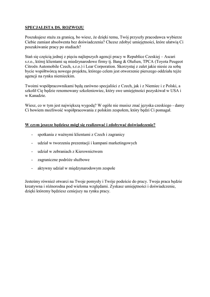 SPECJALISTA DS. ROZWOJU Poszukujesz stażu za granicą, bo wiesz, że dzięki temu, Twój przyszły pracodawca wybierze Ciebie zamiast absolwenta bez doświadczenia? Chcesz zdobyć umiejętności, które ułatwią Ci poszukiwanie pracy po studiach? Stań się częścią jednej z pięciu najlepszych agencji pracy w Republice Czeskiej – Ascari s.r.o., której klientami są miedzynarodowe firmy tj. Bang & Olufsen, TPCA (Toyota Peugeot Citroën Automobile Czech, s.r.o.) i Lear Corporation. Skorzystaj z zalet jakie niesie za sobą bycie współtwórcą nowego projektu, którego celem jest otworzenie pierszego oddziału tejże agencji na rynku niemieckim. Twoimi współpracownikami będą zarówno specjaliści z Czech, jak i z Niemiec i z Polski, a szkolił Cię będzie renomowany szkoleniowiec, który swe umiejętności pozyskiwał w USA i w Kanadzie. Wiesz, co w tym jest największą wygodą? W ogóle nie musisz znać języska czeskiego - damy Ci bowiem możliwość współpracowania z polskim zespołem, który będzi Ci pomagał. W czym jeszcze będziesz mógł się realizować i zdobywać doświadczenie? - spotkania z ważnymi klientami z Czech i zagranicy - udział w tworzeniu prezentacji i kampani marketingowych - udział w zebraniach z Kierownictwem - zagraniczne podróże służbowe - aktywny udział w międzynarodowym zespole Jesteśmy również otwarci na Twoje pomysły i Twóje podeście do pracy. Twoja praca będzie kreatywna i różnorodna pod wieloma względami. Zyskasz umiejętności i doświadczenie, dzięki któremy będziesz ceniejszy na rynku pracy.