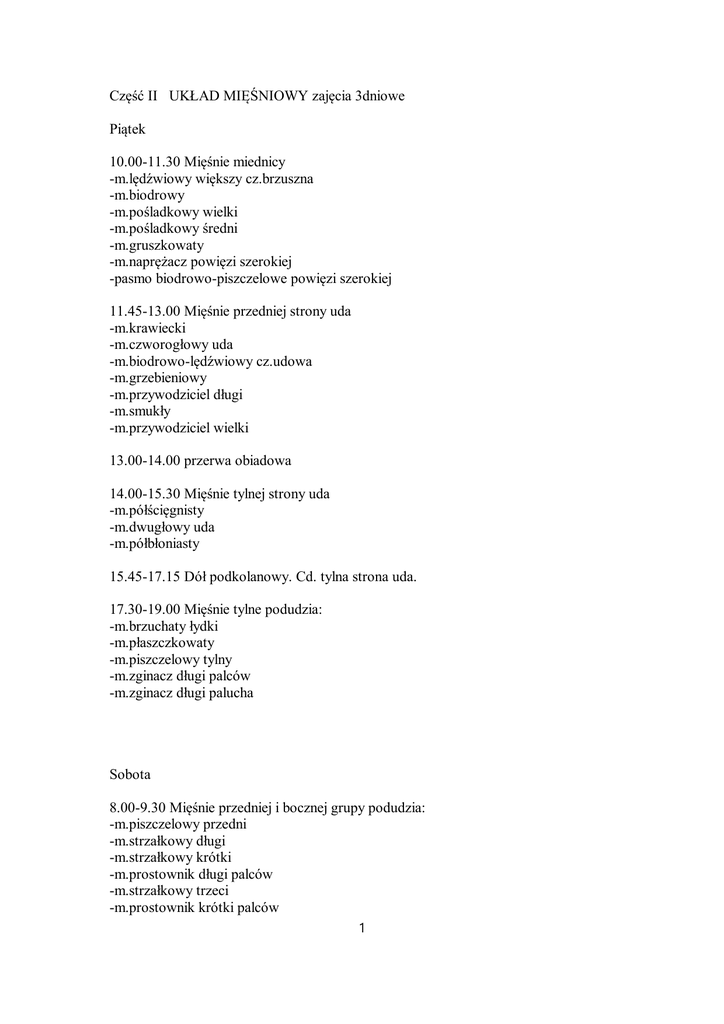 Część II UKŁAD MIĘŚNIOWY zajęcia 3dniowe Piątek 10.00-11.30 Mięśnie miednicy -m.lędźwiowy większy cz.brzuszna -m.biodrowy -m.pośladkowy wielki -m.pośladkowy średni -m.gruszkowaty -m.naprężacz powięzi szerokiej -pasmo biodrowo-piszczelowe powięzi szerokiej 11.45-13.00 Mięśnie przedniej strony uda -m.krawiecki -m.czworogłowy uda -m.biodrowo-lędźwiowy cz.udowa -m.grzebieniowy -m.przywodziciel długi -m.smukły -m.przywodziciel wielki 13.00-14.00 przerwa obiadowa 14.00-15.30 Mięśnie tylnej strony uda -m.półścięgnisty -m.dwugłowy uda -m.półbłoniasty 15.45-17.15 Dół podkolanowy. Cd. tylna strona uda. 17.30-19.00 Mięśnie tylne podudzia: -m.brzuchaty łydki -m.płaszczkowaty -m.piszczelowy tylny -m.zginacz długi palców -m.zginacz długi palucha Sobota 8.00-9.30 Mięśnie przedniej i bocznej grupy podudzia: -m.piszczelowy przedni -m.strzałkowy długi -m.strzałkowy krótki -m.prostownik długi palców -m.strzałkowy trzeci -m.prostownik krótki palców 1 -m.prostownik długi palucha 9.45-11.15 Podeszwa stopy: -m.odwodziciel palucha -m.zginacz krótki palucha -m.odwodziciel palca małego -m.zginacz krótki palca małego 11.30-13.00 Mięśnie grzbietu: m.prostownik grzbietu -m.czworoboczny lędźwi -m.najszerszy grzbietu -m.czworoboczny -m.równoległoboczny większy i mniejszy -m.dźwigacz łopatki 13.00-14.00 przerwa obiadowa 14.00-15.30 Mięśnie brzucha: -m.prosty brzucha -m.skośny zewnętrzny brzucha Ewentualne powtórki materiału przerobionego. 15.45-17.15 Mięśnie obręczy barkowej: -m.naramienny -m.nadgrzebieniowy -m.podgrzebieniowy -m.obły mniejszy -m.obły większy -m.podłopatkowy 17.30-19.00 Mięśnie klatki piersiowej: -m.piersiowy większy -m.piersiowy mniejszy -m.podobojczykowy -m.zębaty przedni Niedziela 8.00-9.30 Mięśnie kończyny górnej: -m.dwugłowy ramienia -m.kruczoramienny -m.ramienny -m.trójgłowy ramienia -m.łokciowy -m.ramienno-promieniowy 2 9.45-11.15 Mm. Kończyny górnej cd. -m.prostownik promieniowy długi nadgarstka-granice -m.prostownik palców -m.prostownik promieniowy krótki nadgarstka -m.prostownik łokciowy nadgarstka -m.odwodziciel długi kciuka -m.prostownik krótki kciuka -m.prostownik długi kciuka 11.30-13.00 Mięśnie szyi: -m.szeroki szyi -m.mostkowo-obojczykowo-sutkowy MOS -mm.pochyłe -m.łopatkowo-gnykowy 13.00-14.00 przerwa obiadowa 14.00-15.30 Mm. żucia: m.żwacz, m.skroniowy, m.skrzydłowy przyśrodkowy i boczny, m.dwubrzuścowy, m.żuchwowo-gnykowy, m.bródkowo-gnykowy 15.45-17.15 Powtórka elementów trudnych. Podsumowanie. 3