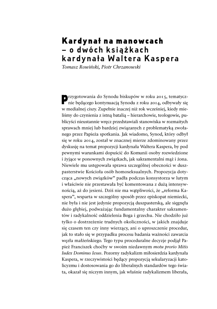 Ka r d y n a ł n a m a n o w ca c h – o dwóch książkach k a r d y n a ł a W a l t e ra Ka s p e ra Tomasz Rowiński, Piotr Chrzanowski P rzygotowania do Synodu biskupów w roku 2015, tematycznie będącego kontynuacją Synodu z roku 2014, odbywały się w medialnej ciszy. Zupełnie inaczej niż rok wcześniej, kiedy mieliśmy do czynienia z istną batalią – hierarchowie, teologowie, publicyści nieustannie wręcz przedstawiali stanowiska w rozmaitych sprawach mniej lub bardziej związanych z problematyką zwołanego przez Papieża spotkania. Jak wiadomo, Synod, który odbył się w roku 2014, został w znacznej mierze zdominowany przez dyskusję na temat propozycji kardynała Waltera Kaspera, by pod pewnymi warunkami dopuścić do Komunii osoby rozwiedzione i żyjące w ponownych związkach, jak sakramentalni mąż i żona. Niewiele mu ustępowała sprawa szczególnej obecności w duszpasterstwie Kościoła osób homoseksualnych. Propozycja dotycząca „nowych związków” padła podczas konsystorza w lutym i właściwie nie przestawała być komentowana z dużą intensywnością, aż do jesieni. Dziś nie ma wątpliwości, że „reforma Kaspera”, wsparta w szczególny sposób przez episkopat niemiecki, nie była i nie jest jedynie propozycją duszpasterską, ale sięgnęła dużo głębiej, podważając fundamentalny charakter sakramentów i radykalność oddzielenia Boga i grzechu. Nie chodziło już tylko o dostrzeżenie trudnych okoliczności, w jakich znajduje się czasem ten czy inny wierzący, ani o uproszczenie procedur, jak to stało się w przypadku procesu badania ważności zawarcia węzła małżeńskiego. Tego typu proceduralne decyzje podjął Papież Franciszek choćby w swoim niedawnym motu prorio Mitis Iudex Dominus Iesus. Pozorny radykalizm miłosierdzia kardynała Kaspera, w rzeczywistości będący propozycją sekularyzacji katolicyzmu i dostosowania go do liberalnych standardów tego świata, okazał się niczym innym, jak właśnie radykalizmem liberała, 15 To m a s z R o w i ń s k i , Pi o t r C h r z a n o w s k i Ka r d y n a ł n a m a n o w ca c h … który zawsze jest przeciwny „granicom” stawianym w świecie przez inne siły niż jego własna ideologia. Wprowadzenie w życie propozycji kardynała Kaspera byłoby zniesieniem takiej granicy wewnątrz samego Kościoła. Oznaczałoby to, że w praktyce można w Kościele rozwiązywać sprawy w kwestiach najważniejszych wedle zasad liberalnych, a katolickość nie posiada żadnej własnej racjonalności opartej na rzeczywistości nierozpoznawanej przez nowych barbarzyńców, by posłużyć się diagnozą sytuacji znaną z Dziedzictwa cnoty Alasdaira MacInyre’a. Można powiedzieć, że quasi-teologia liberalna określałaby w praktyce zasady przystępowania katolików do przyjmowania Ciała Pańskiego. Quasi-teologia, czyli zasady liberalne i ateistyczne strojące się w szaty refleksji religijnej. Dobrze wyczuwały to liczne media sformatowane właśnie liberalnie – świeckie, ale także niektóre formalnie katolickie, podgrzewając oczekiwania zmian, które, wbrew zapewnieniom samego kardynała Kaspera, miałyby charakter właśnie radykalny. Nie sposób ocenić tegorocznej ciszy przedsynodalnej z perspektywy efektów, jakie zostaną osiągnięte podczas tego zgromadzenia. Może ona oznaczać i ukryte przygotowania „reformatorów” do zasadniczego ataku na katolickie nauczanie, jak i to, że przesilenie w kryzysie, który ujawnił się na szczytach kościelnej hierarchii, mamy tymczasowo za sobą. Spokój, który obserwujemy, pozwala jednak zająć się lekturą nie tylko codziennie pojawiających się nowych komentarzy, ale także książek, które stanowią zasadniczy wykład argumentacji stron sporu doktrynalnego, jaki niewątpliwie upublicznił się w Kościele. Mamy zatem tom Pozostać w prawdzie Chrystusa, nazywany „książką pięciu kardynałów”, której omówienie pojawiło się w poprzednim numerze „Christianitas”, ale mamy też dwie pozycje kardynała Kaspera – pierwsza z nich to próba przekrojowego ujęcia tematu miłosierdzia w wierze i doświadczeniu współczesnego Kościoła1, a druga, omawiana przez nas najpierw, jest de facto odpowiedzią niemieckiego hierarchy na krytykę swojego stanowiska zawartą w tzw. „książce pięciu kardynałów” i bardziej bieżących omówieniach. 1 Kard. Walter Kasper, Miłosierdzie. Klucz do chrześcijańskiego życia, Wydawnictwo św. Wojciech, przeł. R. Zajączkowski, s. 270. 16 Christianitas 60-61/2015 * * * 2 Kard. Walter Kasper, Papież Franciszek. Rewolucja czułości i miłości, Biblioteka „Więzi”, przeł. K. Markiewicz, s. 144. Wydana nie tak dawno przez Bibliotekę „Więzi” książka kardynała Waltera Kaspera pt. Papież Franciszek. Rewolucja czułości i miłości2 obciążona jest swego rodzaju grzechem pierworodnym. Jest to doraźna publicystyka, zamierzona przez autora jako poparcie jego lansowanych od pewnego czasu, bardzo kontrowersyjnych propozycji zmian już nie tylko w dyscyplinie, ale także w nauczaniu Kościoła. W związku z tym z książki nierzadko więcej dowiadujemy się o autorze niż o tytułowym bohaterze. Zacznijmy od tego, co nowego wnosi kardynał Kasper do naszej wiedzy o Papieżu Bergogliu. Bardzo pouczający jest pod tym względem trzeci rozdział książki zatytułowany Uwarunkowania historyczne i teologiczne. Znamienne jest w nim takie oto podsumowanie: „Wpływ oświeceniowej jak i romantyczno-idealistycznej myśli europejskiej świadczy o tym, że przy całej swej samodzielności i oryginalności teologia argentyńska, podobnie jak argentyńska kultura, jest silnie zakorzeniona w dziedzictwie Starego Kontynentu. Współcześni argentyńscy teologowie są doskonale obeznani z teologią francuską (Henri de Lubac, Yves Congar i inni) oraz XX-wieczną filozofią (Paul Ricœur, Emmanuel Levinas, Jean-Luc Marion i inni). Wielu spośród nich studiowało w Bonn, Innsbrucku,