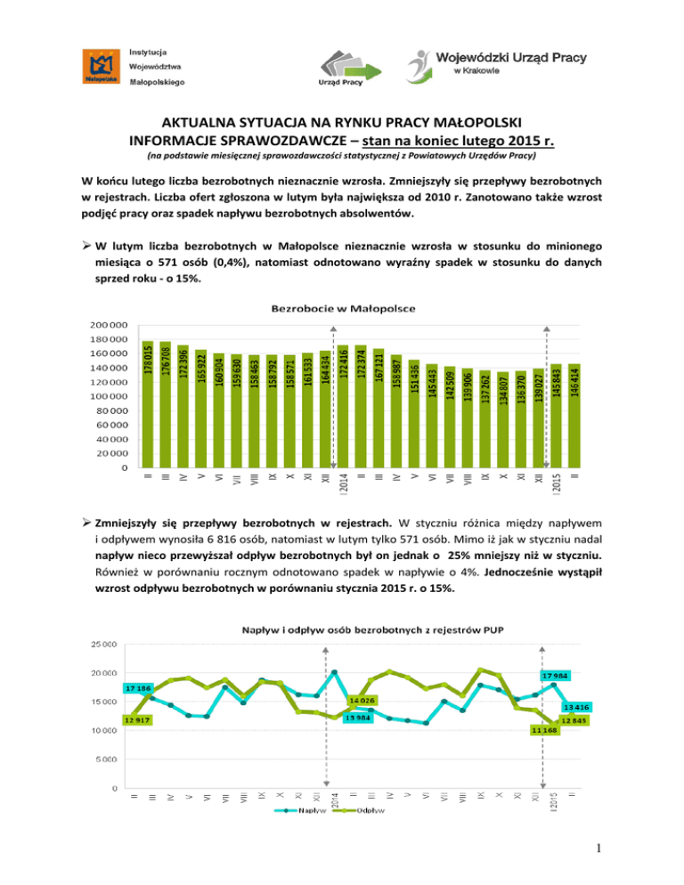 AKTUALNA SYTUACJA NA RYNKU PRACY MAŁOPOLSKI INFORMACJE SPRAWOZDAWCZE – stan na koniec lutego 2015 r. (na podstawie miesięcznej sprawozdawczości statystycznej z Powiatowych Urzędów Pracy) W końcu lutego liczba bezrobotnych nieznacznie wzrosła. Zmniejszyły się przepływy bezrobotnych w rejestrach. Liczba ofert zgłoszona w lutym była największa od 2010 r. Zanotowano także wzrost podjęć pracy oraz spadek napływu bezrobotnych absolwentów. W lutym liczba bezrobotnych w Małopolsce nieznacznie wzrosła w stosunku do minionego miesiąca o 571 osób (0,4%), natomiast odnotowano wyraźny spadek w stosunku do danych sprzed roku - o 15%. Zmniejszyły się przepływy bezrobotnych w rejestrach. W styczniu różnica między napływem i odpływem wynosiła 6 816 osób, natomiast w lutym tylko 571 osób. Mimo iż jak w styczniu nadal napływ nieco przewyższał odpływ bezrobotnych był on jednak o 25% mniejszy niż w styczniu. Również w porównaniu rocznym odnotowano spadek w napływie o 4%. Jednocześnie wystąpił wzrost odpływu bezrobotnych w porównaniu stycznia 2015 r. o 15%. 1 W lutym wyraźnie spadł napływ bezrobotnych pozostających w zatrudnieniu bezpośrednio przed rejestracją, a których umowy wygasły lub zwolnienie nastapiło z przyczyn nie leżących po stronie pracodawcy (30%). Do rejestrów PUP napłynęło prawie 13,5 tys. osób. Spośród nich: 75% (10 tys.) to osoby pozostające w zatrudnieniu bezpośrednio przed rejestracją, a których umowy wygasły lub zwolnienie nastapiło z przyczyn nie leżących po stronie pracodawcy; 9% (1,2 tys.) to pracownicy zwolnionieni z przyczyn pracodawcy i 17% (prawie 2,2 tys.) stanowiły osoby dotychczas nie pracujące. W lutym zdecydowanie wzrosła liczba ofert pracy w porównaniu miesięcznym, jak i rocznym. Do małopolskich urzędów pracy wpłynęło 7 141 ofert, czyli o 59% więcej niż w styczniu br. oraz o 12% w porównaniu do analogicznego okresu roku poprzedniego. Była to największa miesięczna liczba ofert od 2010 r. 2 O 10% wzrosła liczba podejmujących pracę w porównaniu miesięcznym. Pracę podjęło 6 438 osób. W porównaniu rocznym wzrost wyniósł 3%. W lutym zarejestrowało się mniej absolwentów niż miesiąc i rok wcześniej. Był to najmniejszy miesięczny napływ od kilku lat. Napłynęło ich 1 421 osób, tj. o 15% mniej w stosunku do minionego miesiąca oraz o 11% w porównaniu rocznym. *Od 1.01.2015 r. kategoria „Absolwenci szkół wyższych do 27 roku życia” nie jest już rozliczana w statystyce MPiPS. 3 W lutym pracę podjęło 734 bezrobotnych absolwentów, co w porównaniu miesięcznym oznacza wzrost o 11%. W ujęciu rocznym poziom podjęć pracy był na zbliżonym poziomie. *Od 1.01.2015 r. kategoria „Absolwenci szkół wyższych do 27 roku życia” nie jest już rozliczana w statystyce MPiPS. W lutym plany zwolnień zgłosiło 2 pracodawców i dotyczyły one 68 osób. 4 W lutym br. spadł napływ bezrobotnych w wyniku realizacji zwolnień z przyczyn zakładu pracy, w odniesieniu do minionego miesiąca, jak i w porównaniu rocznym. Do rejestrów PUP napłynęło 1 155 osób, co oznacza spadek w porównaniu miesięcznym, jak i rocznym odpowiednio o 7% i 4%. W ujęciu miesięcznym w lutym br. odnotowano spadek rejestracji osób bezrobotnych powracających po pracy za granicą o 26%. Natomiast w porównaniu rocznym w lutym br. do rejestrów trafiło o 12% więcej osób. 5 INFORMACJE SPRAWOZDAWCZE – stan na koniec lutego 2015 r. (na podstawie danych GUS) W Małopolsce na koniec lutego 2015 r. stopa bezrobocia wynosiła 10,3%, co daje nam 4 miejsce. W porównaniu do minionego miesiąca stopa bezrobocia w Małopolsce, jak i Polsce utrzymała się na tym samym poziomie. INNE INFORMACJE Nowości w Bibliotece Małopolskiego Obserwatorium Rynku Pracy (Opisy publikacji przygotowało Małopolskie Obserwatorium Rynku Pracy i Edukacji) Mobilność społeczna i przestrzenna w kontekście wyborów edukacyjnych Raport przedstawia wyniki badania, którego celem była analiza karier edukacyjnych i zawodowych młodych Polaków w kontekście mobilności przestrzennej, społecznej oraz jakości kształcenia. Przedstawiono w nim czynniki determinujące kariery edukacyjne i mobilność przestrzenną, takie jak cechy indywidualne osoby oraz jej rodziny; cechy środowiska społecznego, w którym osoba funkcjonuje, cechy miejsc zamieszkania oraz placówek edukacyjnych, w których dana osoba się kształci. W drugiej części opisano scenariusze ścieżek edukacyjno-zawodowych. Wykonawca: M. Herbst, A. Sobotka Zleceniodawca : Instytut Badań Edukacyjnych http://obserwatorium.malopolska.pl/pl/biblioteka/szukaj-publikacji.html,2:src:2:10:datadesc:inne,2:vw:2125 6 Starzejące się społeczeństwo: nowe zadania dla polityk publicznych. Publikacja Małopolskich Studiów Regionalnych na temat wyzwań rozwojowych w starzejącym się społeczeństwie w takich obszarach jak m.in.: srebrna gospodarka, aktywne starzenie się, telemedycyna, edukacja gerontologiczna i edukacja osób starszych a także planowanie przestrzenne i mieszkalnictwo. Wykonawca: Departament Polityki Regionalnej, Urząd Marszałkowski Województwa Małopolskiego Zleceniodawca : Urząd Marszałkowski Województwa Małopolskiego http://obserwatorium.malopolska.pl/pl/biblioteka/szukaj-publikacji.html,2:src,2:vw:2136 Sporządziła Agnieszka Grzonka Zespól Strategii Rynku Pracy Kraków, 25.03.2015 r. 7