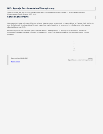 BIP - Agencja Bezpieczeństwa Wewnętrznego Źródło: http://bip.abw.gov.pl/bip/nadzor-i-kontrola/kontrola-panstwowa/senat-i-senatorowie/21,Senat-i-Senatorowie.html Wygenerowano: Piątek, 3 marca 2017, 16:10 Senat i Senatorowie W sprawach dotyczących Agencji Bezpieczeństwa Wewnętrznego senatorowie mogą uzyskiwać od Prezesa Rady Ministrów oraz Szefa Agencji Bezpieczeństwa Wewnętrznego informacje i wyjaśnienia w sprawach wynikających z wykonywania obowiązków senatorskich. Prezes Rady Ministrów oraz Szef Agencji Bezpieczeństwa Wewnętrznego są obowiązani przedstawiać informacje i wyjaśnienia na żądanie stałych i nadzwyczajnych komisji senackich, w sprawach będących przedmiotem ich zakresu działania. Data publikacji 04.01.2007 Rejestr zmian Autor : Opublikowane przez Konrad Jankowski