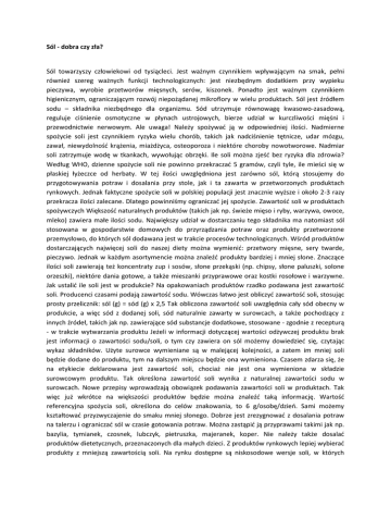 Sól - dobra czy zła? Sól towarzyszy człowiekowi od tysiącleci. Jest ważnym czynnikiem wpływającym na smak, pełni również szereg ważnych funkcji technologicznych: jest niezbędnym dodatkiem przy wypieku pieczywa, wyrobie przetworów mięsnych, serów, kiszonek. Ponadto jest ważnym czynnikiem higienicznym, ograniczającym rozwój niepożądanej mikroflory w wielu produktach. Sól jest źródłem sodu – składnika niezbędnego dla organizmu. Sód utrzymuje równowagę kwasowo-zasadową, reguluje ciśnienie osmotyczne w płynach ustrojowych, bierze udział w kurczliwości mięśni i przewodnictwie nerwowym. Ale uwaga! Należy spożywad ją w odpowiedniej ilości. Nadmierne spożycie soli jest czynnikiem ryzyka wielu chorób, takich jak nadciśnienie tętnicze, udar mózgu, zawał, niewydolnośd krążenia, miażdżyca, osteoporoza i niektóre choroby nowotworowe. Nadmiar soli zatrzymuje wodę w tkankach, wywołując obrzęki. Ile soli można zjeśd bez ryzyka dla zdrowia? Według WHO, dzienne spożycie soli nie powinno przekraczad 5 gramów, czyli tyle, ile mieści się w płaskiej łyżeczce od herbaty. W tej ilości uwzględniona jest zarówno sól, którą stosujemy do przygotowywania potraw i dosalania przy stole, jak i ta zawarta w przetworzonych produktach rynkowych. Jednak faktyczne spożycie soli w polskiej populacji jest znacznie wyższe i około 2-3 razy przekracza ilości zalecane. Dlatego powinniśmy ograniczad jej spożycie. Zawartośd soli w produktach spożywczych Większośd naturalnych produktów (takich jak np. świeże mięso i ryby, warzywa, owoce, mleko) zawiera małe ilości sodu. Największy udział w dostarczaniu tego składnika ma natomiast sól stosowana w gospodarstwie domowych do przyrządzania potraw oraz produkty przetworzone przemysłowo, do których sól dodawana jest w trakcie procesów technologicznych. Wśród produktów dostarczających najwięcej soli do naszej diety można wymienid: przetwory mięsne, sery twarde, pieczywo. Jednak w każdym asortymencie można znaleźd produkty bardziej i mniej słone. Znaczące ilości soli zawierają też koncentraty zup i sosów, słone przekąski (np. chipsy, słone paluszki, solone orzeszki), niektóre dania gotowe, a także mieszanki przyprawowe oraz kostki rosołowe i warzywne. Jak ustalid ile soli jest w produkcie? Na opakowaniach produktów rzadko podawana jest zawartośd soli. Producenci czasami podają zawartośd sodu. Wówczas łatwo jest obliczyd zawartośd soli, stosując prosty przelicznik: sól (g) = sód (g) x 2,5 Tak obliczona zawartośd soli uwzględnia cały sód obecny w produkcie, a więc sód z dodanej soli, sód naturalnie zawarty w surowcach, a także pochodzący z innych źródeł, takich jak np. zawierające sód substancje dodatkowe, stosowane - zgodnie z recepturą - w trakcie wytwarzania produktu Jeżeli w informacji dotyczącej wartości odżywczej produktu brak jest informacji o zawartości sodu/soli, o tym czy zawiera on sól możemy dowiedzied się, czytając wykaz składników. Użyte surowce wymieniane są w malejącej kolejności, a zatem im mniej soli będzie dodane do produktu, tym na dalszym miejscu będzie ona wymieniona. Czasem zdarza się, że na etykiecie deklarowana jest zawartośd soli, chociaż nie jest ona wymieniona w składzie surowcowym produktu. Tak określona zawartośd soli wynika z naturalnej zawartości sodu w surowcach. Nowe przepisy wprowadzają obowiązek podawania zawartości soli w produktach. Tak więc już wkrótce na większości produktów będzie można znaleźd taką informację. Wartośd referencyjna spożycia soli, określona do celów znakowania, to 6 g/osobę/dzieo. Sami możemy kształtowad przyzwyczajenie do smaku mniej słonego. Dobrze jest zrezygnowad z dosalania potraw na talerzu i ograniczad sól w czasie gotowania potraw. Można zastąpid ją przyprawami takimi jak np. bazylia, tymianek, czosnek, lubczyk, pietruszka, majeranek, koper. Nie należy także dosalad produktów dietetycznych, przeznaczonych dla małych dzieci. Z produktów rynkowych lepiej wybierad produkty z mniejszą zawartością soli. Na rynku dostępne są niskosodowe wersje soli, w których chlorek sodu jest częściowo zastąpiony chlorkiem potasu, a także produkty o mniejszej zawartości soli. Umieszczona na etykiecie informacja „produkt o niskiej zawartości soli” oznacza, że zawiera on nie więcej niż 0,3 g soli w 100 g. Po kilku tygodniach nasz próg odczuwania smaku słonego obniży się i zaczną nam smakowad produkty mniej słone, z korzyścią dla zdrowia. dr inż. Anna Wojtasik Kierownik Pracowni Składników Mineralnych Instytut Żywności i Żywienia