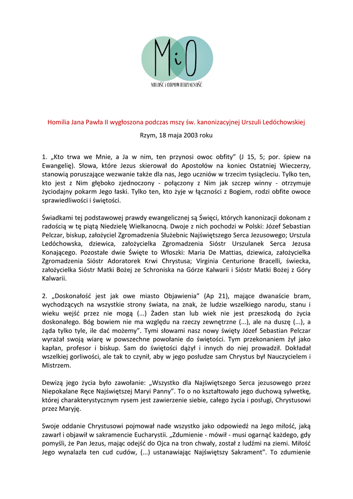 Homilia Jana Pawła II wygłoszona podczas mszy św. kanonizacyjnej Urszuli Ledóchowskiej Rzym, 18 maja 2003 roku 1. „Kto trwa we Mnie, a Ja w nim, ten przynosi owoc obfity” (J 15, 5; por. śpiew na Ewangelię). Słowa, które Jezus skierował do Apostołów na koniec Ostatniej Wieczerzy, stanowią poruszające wezwanie także dla nas, Jego uczniów w trzecim tysiącleciu. Tylko ten, kto jest z Nim głęboko zjednoczony - połączony z Nim jak szczep winny - otrzymuje życiodajny pokarm Jego łaski. Tylko ten, kto żyje w łączności z Bogiem, rodzi obfite owoce sprawiedliwości i świętości. Świadkami tej podstawowej prawdy ewangelicznej są Święci, których kanonizacji dokonam z radością w tę piątą Niedzielę Wielkanocną. Dwoje z nich pochodzi w Polski: Józef Sebastian Pelczar, biskup, założyciel Zgromadzenia Służebnic Najświętszego Serca Jezusowego; Urszula Ledóchowska, dziewica, założycielka Zgromadzenia Sióstr Urszulanek Serca Jezusa Konającego. Pozostałe dwie Święte to Włoszki: Maria De Mattias, dziewica, założycielka Zgromadzenia Sióstr Adoratorek Krwi Chrystusa; Virginia Centurione Bracelli, świecka, założycielka Sióstr Matki Bożej ze Schroniska na Górze Kalwarii i Sióstr Matki Bożej z Góry Kalwarii. 2. „Doskonałość jest jak owe miasto Objawienia” (Ap 21), mające dwanaście bram, wychodzących na wszystkie strony świata, na znak, że ludzie wszelkiego narodu, stanu i wieku wejść przez nie mogą (...) Żaden stan lub wiek nie jest przeszkodą do życia doskonałego. Bóg bowiem nie ma względu na rzeczy zewnętrzne (...), ale na duszę (...), a żąda tylko tyle, ile dać możemy”. Tymi słowami nasz nowy święty Józef Sebastian Pelczar wyrażał swoją wiarę w powszechne powołanie do świętości. Tym przekonaniem żył jako kapłan, profesor i biskup. Sam do świętości dążył i innych do niej prowadził. Dokładał wszelkiej gorliwości, ale tak to czynił, aby w jego posłudze sam Chrystus był Nauczycielem i Mistrzem. Dewizą jego życia było zawołanie: „Wszystko dla Najświętszego Serca jezusowego przez Niepokalane Ręce Najświętszej Maryi Panny”. To o no kształtowało jego duchową sylwetkę, której charakterystycznym rysem jest zawierzenie siebie, całego życia i posługi, Chrystusowi przez Maryję. Swoje oddanie Chrystusowi pojmował nade wszystko jako odpowiedź na Jego miłość, jaką zawarł i objawił w sakramencie Eucharystii. „Zdumienie - mówił - musi ogarnąć każdego, gdy pomyśli, że Pan Jezus, mając odejść do Ojca na tron chwały, został z ludźmi na ziemi. Miłość Jego wynalazła ten cud cudów, (...) ustanawiając Najświętszy Sakrament". To zdumienie wiary nieustannie budził w sobie i w innych. Ono prowadziło go też ku Maryi. Jako biegły teolog nie mógł nie widzieć w Maryi Tej, która „w tajemnicy Wcielenia antycypowała także wiarę eucharystyczną Kościoła”; Tej, która nosząc w łonie Słowo, które stało się ciałem, w pewnym sensie była „tabernakulum” - pierwszym „tabernakulum” w historii (por. Ecclesia de Eucharistia, 55). Zwracał się więc do Niej z dziecięcym oddaniem i z tą miłością, którą wyniósł z domu rodzinnego, i innych do tej miłości zachęcał. Do założonego przez siebie Zgromadzenia Służebnic Najświętszego Serca Jezusowego pisał: „Pośród pragnień Serca Jezusowego jednym z najgorętszych jest to, by Najświętsza jego Rodzicielka była czczona od wszystkich i miłowana, raz dlatego, że Ją Pan sam niewypowiedzianie miłuje, a po wtóre, że Ją uczynił Matką wszystkich ludzi, żeby Ona swa słodkością pociągała do siebie nawet tych, którzy uciekają od świętego Krzyża i wiodła ich do Serca Boskiego”. Wynosząc do chwały ołtarzy Józefa Sebastiana, modlę się za jego wstawiennictwem, aby blask jego świętości był dla sióstr sercanek, Kościoła w Przemyślu i dla wszystkich wierzących w Polsce i na świecie zachętą do takiego umiłowania Chrystusa i Jego Matki. 3. Święta Urszula Ledóchowska przez całe swe życie wiernie i z miłością wpatrywała się w oblicze Chrystusa, swego Oblubieńca. W sposób szczególny jednoczyła się z Chrystusem konającym na Krzyżu. To zjednoczenie napełniało ją niezwykłą gorliwością w dziele głoszenia słowem i czynem Dobrej Nowiny o miłości Boga. Niosła ją przede wszystkim dzieciom i młodzieży, ale też osobom znajdującym się w potrzebie, ubogim, opuszczonym, samotnym. Do nich wszystkich mówiła językiem miłości popartej czynem. Z przesłaniem Bożej miłości przemierzyła Rosję, kraje skandynawskie, Francję i Włochy. Była w swoich czasach apostołką nowej ewangelizacji, dając swym życiem i działaniem dowód, że miłość ewangeliczna jest zawsze aktualna, twórcza i skuteczna. I ona czerpała natchnienie i siły do wielkiego dzieła apostolstwa z umiłowania Eucharystii. Pisała: „Mam miłować bliźnich jak Jezus mnie umiłował. Bierzcie i jedzcie me siły, bo one są do waszej dyspozycji (...). Bierzcie i jedzcie moje zdolności, moją umiejętność (...), me serce niech swą miłością rozgrzewa i rozjaśnia życie wasze (...). Bierzcie i jedzcie mój czas - niech on będzie do waszej dyspozycji. Jam wasza, jak Jezus jest mój”. Czy w tych słowach nie brzmi echo oddania, z jakim Chrystus w Wieczerniku ofiarował samego siebie Uczniom wszystkich czasów? Zakładając Zgromadzenie Sióstr Urszulanek Serca Jezusa Konającego przekazała mu tego ducha. „Przenajświętszy Sakrament - pisała - to słońce życia naszego, to nasz skarb, nasze szczęście, nasze wszystko na ziemi. (...) Kochajcie Jezusa w tabernakulum! Tam niech serce wasze czuwa, choć ciało przy pracy, przy zajęciu. Tam Jezus, a Jezusa trzeba nam kochać tak gorąco, tak serdecznie. Jeśli nie umiemy kochać, to przynajmniej pragnijmy kochać - kochać coraz więcej!”. W świetle tej eucharystycznej miłości święta Urszula w każde