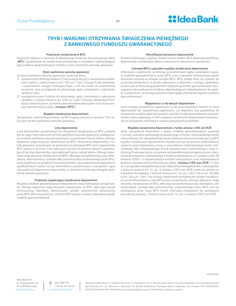 Duma Przedsiębiorcy 1/1 TRYB I WARUNKI OTRZYMANIA ŚWIADCZENIA PIENIĘŻNEGO Z BANKOWEGO FUNDUSZU GWARANCYJNEGO Powstanie świadczenia w BFG Deponent nabywa w stosunku do Bankowego Funduszu Gwarancyjnego (dalej „BFG”) uprawnienie do świadczenia pieniężnego w wysokości odpowiadającej jego środkom gwarantowanym w banku w dniu spełnienia warunku gwarancji. Dzień spełnienia warunku gwarancji Za dzień spełnienia warunku gwarancji uważa się dzień: 1) wydania przez Komisję Nadzoru Finansowego decyzji o zawieszeniu działalności banku, o której mowa w art. 158 ust. 1 lub 2 ustawy Prawo bankowe, i ustanowienie zarządu komisarycznego, o ile nie został on ustanowiony wcześniej, oraz wystąpienie do właściwego sądu z wnioskiem o ogłoszenie upadłości albo 2) wystąpienie przez Fundusz do właściwego sądu z wnioskiem o ogłoszenie upadłości, o którym mowa w art. 230 ust. 2 pkt 1 Ustawy o Bankowym Funduszu Gwarancyjnym, systemie gwarantowania depozytów oraz przymusowej restrukturyzacji (dalej „Ustawa o BFG”). Wypłata świadczenia deponentowi Świadczenie należne deponentowi od BFG wypłacane jest w terminie 7 dni roboczych od dnia spełnienia warunku gwarancji. Lista deponentów Lista deponentów uprawnionych do otrzymania świadczenia od BFG ustalana jest w ciągu 3 dni roboczych od dnia spełnienia warunku gwarancji, według stanu na dzień spełnienia warunku gwarancji, na podstawie danych banku, którego deponenci mają otrzymać świadczenie od BFG. Roszczenia deponentów z tytułu gwarancji niewskazane na pierwotnie przekazanej BFG liście deponentów BFG spłaca w terminie 7 dni roboczych od dnia otrzymania danych uzupełniających tę listę deponentów, sporządzonych przez zarząd banku, którego deponenci mają otrzymać świadczenie od BFG, albo jego zarząd komisaryczny, likwidatora, administratora, syndyka albo pełnomocnika ustanowionego przez BFG, w szczególności po ustaleniu listy wierzytelności sporządzonej w postępowaniu upadłościowym banku lub po stwierdzeniu prawomocnym orzeczeniem sądu wierzytelności deponenta wobec banku, w stosunku do którego nastąpiło spełnienie warunku gwarancji. Podmioty wypłacające świadczenia deponentom Wypłaty środków gwarantowanych deponentom może dokonywać zarząd banku, którego deponenci mają otrzymać świadczenie od BFG, albo jego zarząd komisaryczny, likwidator, administrator, syndyk, pełnomocnik ustanowiony przez BFG albo inny podmiot, z którym BFG zawarł umowę o dokonanie wypłat środków gwarantowanych. Weryfikacja tożsamości deponentów Podmiot dokonujący wypłaty świadczenia w imieniu BFG dokonuje weryfikacji deponentów na podstawie danych zawartych w dokumencie tożsamości. Uchwała BFG o sposobie wypłaty świadczenia deponentom Informacje o podmiocie, za którego pośrednictwem będą realizowane wypłaty środków gwarantowanych przez BFG, oraz o sposobie dokonywania wypłat określone zostaną w uchwale zarządu BFG. BFG podaje treść tej uchwały do publicznej wiadomości w drodze ogłoszenia w dzienniku o zasięgu ogólnokrajowym oraz przekazuje ją podmiotom objętym systemem gwarantowania zobowiązanym do przekazania środków odpowiadających zobowiązaniom do zapłaty i podmiotowi, za którego pośrednictwem będą realizowane wypłaty środków gwarantowanych. Wątpliwości co do danych deponentów Jeżeli istnieją uzasadnione wątpliwości co do poszczególnych danych na liście deponentów lub uzasadnione wątpliwości, czy deponent jest uprawniony do otrzymania środków gwarantowanych, lub jeżeli środki gwarantowane są przedmiotem sporu sądowego, to BFG wypłaca świadczenie deponentowi niezwłocznie po otrzymaniu informacji o ustaniu powyższych przesłanek. Wypłata świadczenia deponentom z tytułu umowy o IKE lub IKZE Jeżeli uprawnienia deponenta z tytułu środków gwarantowanych wynikają z umowy rachunku bankowego prowadzonego w formie indywidualnego konta emerytalnego lub indywidualnego konta zabezpieczenia emerytalnego, to BFG wypłaca świadczenie deponentowi niezwłocznie po otrzymaniu potwierdzenia zawarcia przez deponenta umowy o prowadzenie indywidualnego konta emerytalnego albo indywidualnego konta zabezpieczenia emerytalnego z inną instytucją finansową lub po otrzymaniu potwierdzenia przystąpienia przez deponenta do programu emerytalnego w trybie przewidzianym w Ustawie z dnia 20 kwietnia 2004 r. o indywidualnych kontach emerytalnych oraz indywidualnych kontach zabezpieczenia emerytalnego (dalej „Ustawa o IKE oraz IKZE”), z tym że w przypadku niedopełnienia przez deponenta któregokolwiek z obowiązków, o których mowa w art. 14 ust. 3 Ustawy o IKE oraz IKZE, jeżeli nie spełnia on warunków do wypłaty, o których mowa w art. 34 ust. 1 pkt 1 lub w art. 46 albo w art. 34a ust. 1 pkt 1 tej ustawy, świadczenie pieniężne jest płatne niezwłocznie po poinformowaniu o tym BFG przez zarząd banku, którego deponenci mają otrzymać świadczenie od BFG, albo jego zarząd komisaryczny, likwidatora, administratora, syndyka albo pełnomocnika ustanowionego przez BFG oraz po przekazaniu przez niego BFG innych informacji niezbędnych do zachowania warunku tej wypłaty, o którym mowa w art. 14 ust. 4 ustawy o IKE oraz IKZE. 1610071307 Idea Bank S.A. ul. Przyokopowa 33 01-208 Warszawa www.ideabank.pl 801 999 111 +48 22 101 10 10 [email protected] T: Idea Bank Spółka Akcyjna z siedzibą w Warszawie, ul. Przyokopowa 33, 01-208 Warszawa, wpisana do rejestru przedsiębiorców prowadzonego przez Sąd Rejonowy dla m.st. Warszawy w Warszawie, XII Wydział Gospodarczy Krajowego Rejestru Sądowego, pod numerem KRS 0000026052, REGON 011063638, NIP 5260307560, której kapitał zakładowy wynosi 156 803 962 zł (opłacony w całości).