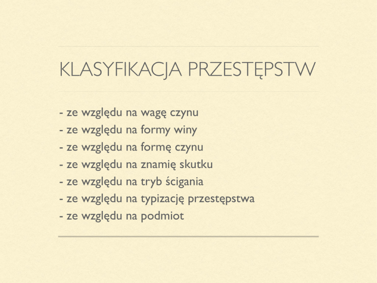 KLASYFIKACJA PRZESTĘPSTW - ze względu na wagę czynu - ze względu na formy winy - ze względu na formę czynu - ze względu na znamię skutku - ze względu na tryb ścigania - ze względu na typizację przestępstwa - ze względu na podmiot WAGA CZYNU - PODZIAŁ NA ZBRODNIE I WYSTĘPKI Art. 7. [Kwalifikacja przestępstw. Zbrodnia i występek] § 1. Przestępstwo jest zbrodnią albo występkiem. § 2. Zbrodnią jest czyn zabroniony zagrożony karą pozbawienia wolności na czas nie krótszy od lat 3 albo karą surowszą. § 3. Występkiem jest czyn zabroniony zagrożony grzywną powyżej 30 stawek dziennych albo powyżej 5 000 złotych, karą ograniczenia wolności przekraczającą miesiąc albo karą pozbawienia wolności przekraczającą miesiąc. Ustalenie, czy dany dany czyn zabroniony jest zbrodnią lub występkiem ma znaczenie w następujących przepisach Kodeksu karnego: art. 8 kk (podział dotyczący form winy) art. 10 § 4 kk, art. 60 § 6 kk (nadzwyczajne złagodzenie kary), art. 64 § 3 kk (podwyższenie górnej granicy odpowiedzialności karnej), art. 101 § 1 kk (terminy przedawnienia karalności), 105 § 1 kk, art. 255 § 1 i 2 kk (odmienna typizacja publicznego nawoływania do popełnienia przestępstwa) FORMY WINY: UMYŚLNOŚĆ NIEUMYŚLNOŚĆ art. 8 kk: Zbrodnię można popełnić tylko umyślnie; występek można popełnić także nieumyślnie, jeżeli ustawa tak stanowi przykłady występków nieumyślnych: art. 155 kk, art. 177 kk, art. 292 kk Forma winy (strona podmiotowa czynów zabronionych) może polegać na: umyślności (art. 9 § 1 kk), umyślności - nieumyślności (art. 9 § 3 kk), nieumyślności (art. 9 § 2 kk) nieumyślności - nieumyślności (art. 9 § 3 kk) Ustalenie, czy sprawca dopuścił się czynu zabronionego umyślnego, czy nieumyślnego ma znaczenie na podstawie następujących przepisów Kodeksu karnego: art. 10 § 2 kk - katalog zawierający tylko czyny umyślne art. 12 kk - nie ma zastosowania do przestępstw nieumyślnych art. 47 § 1 kk - orzeczenie nawiązki tylko za przestępstwo umyślne art. 60 § 2 pkt. 3 kk - możliwość nadzwyczajnego złagodzenia kary za przestępstwo nieumyślne art. 64 § 1 i 2 kk - uregulowanie recydywy dotyczy tylko przestępstw umyślnych art. 75 § 1 kk - obligatoryjna zarządzenie wykonania kary za czyn umyślny FORMA CZYNU - DZIAŁANIE, ZANIECHANIE Przykłady przestępstw tylko z działania: art. 197 kk (zgwałcenie), art. 206 kk (bigamia), art. 223 kk (czynna napaść na funkcjonariusza) Przykłady przestępstw tylko z zaniechania: art. 162 kk (nieudzielenie pomocy), art. 240 kk (niezawiadomienie o przestępstwie) Przykłady przestępstw z działania i zaniechania: art. 148 kk (zabójstwo), art. 233 kk (fałszywe zeznania), art. 160 kk (narażenie człowieka na niebezpieczeństwo) Ze względu na formę czynu wyróżnić dodatkowo należy: przestępstwa jednoodmianowe (np. kradzież tj. art. 278 kk) — wieloodmianowe (np. niezaspokojenie wierzyciela tj. art. 300 kk) przestępstwa jednoczynowe (np. zabójstwo tj. art. 148 kk) - wieloczynowe (np. znęcanie się tj. art. 207 kk) przestępstwa jednorazowe a przestępstwa trwałe (np. art. 189 kk - pozbawienie wolności, art. 263 § 2 kk nielegalne posiadanie broni) ZNAMIĘ SKUTKU - PRZESTĘPSTWA FORMALNE I MATERIALNE Przestępstwo materialne - typ czynu zabronionego, dla realizacji którego znamion w formie dokonania konieczna jest zmiana w świecie zewnętrznym, oderwana czasowo i miejscowo od samego zachowania się sprawcy Przestępstwo formalne - typ czynu zabronionego, dla realizacji którego znamion wystąpienie skutku rozumianego jako zmiana w świecie zewnętrznym jest prawnie irrelewantne Przykłady przestępstw materialnych: zabójstwo (art. 148 kk), spowodowanie ciężkiego uszczerbku na zdrowiu (art. 156 kk), zniszczenie cudzej rzeczy (art. 288 kk), pozbawienie wolności (art. 189 kk) Przykłady przestępstw formalnych: nakłanianie do nierządu (art. 204 kk), fałszywe zeznania (art. 233 kk) Do przestępstw materialnych zalicza się generalnie również przestępstwa polegające na sprowadzeniu niebezpieczeństwa opisanego w danym typie czynu zabronionego (np. art. 160 kk) - skutek rozumiany jako narażenie na niebezpieczeństwo PODZIAŁ PRZESTĘPSTW Z UWAGI NA TRYB ŚCIGANIA Przestępstwa publicznoskargowe Przestępstwa wnioskowe Przestępstwa prywatnoskargowe (zniesławienie art. 212 kk, znieważenie - art. 216 kk, naruszenie nietykalności cielesnej - art. 217 kk) PRZESTĘPSTWA BEZWZGLĘDNIE WNIOSKOWE (PRZYKŁADY) - zgwałcenie - art. 197 kk narażenie na zakażenie wirusem HIV - art. 161 kk groźba karalna - art. 190 kk stalking - 190a kk PRZESTĘPSTWA WZGLĘDNIE WNIOSKOWE (PRZYKŁADY) - kradzież na szkodę osoby najbliższej - art. 278 § 4 kk oszustwo na szkodę osoby najbliższej - art. 286 § 4 kk PODZIAŁ Z UWAGI NA TYPY PRZESTĘPSTW typ podstawowy typ kwalifikowany typ uprzywilejowany PODMIOT CZYNU - PRZESTĘPSTWA INDYWIDUALNE I POWSZECHNE Przestępstwa powszechne: „Kto (…)” - czyli każdy komu można przypisać winę Przestępstwa indywidualne - właściwe (cecha podmiotu decyduje o bycie danego czynu zabronionego), niewłaściwe (cecha podmiotu decyduje o jego typie kwalifikowanym lub uprzywilejowanym) STRUKTURA PRZESTĘPSTWA Ustawowe znamiona czynu zabronionego - „cechy zdarzenia, które muszą być udowodnione w postępowaniu karnym, aby można było stwierdzić, że ktoś dopuścił się przestępstwa. Cechy te dotyczyć mogą zachowania się zewnętrznego sprawcy, skutku i okoliczności tego zachowania się, osoby sprawcy oraz jego stosunku psychicznego do zdarzenia” (I. Andrejew, Polskie prawo karne,Warszawa 1978 r., s. 107) Ustawowe znamiona przestępstwa spełniają funkcję gwarancyjną przed dowolnością w ściganiu i karaniu Podmiot przestępstwa - znamiona określające warunki, którym powinien odpowiadać człowiek, aby mógł ponosić odpowiedzialność karną na warunkach określonych w kk Strona podmiotowa