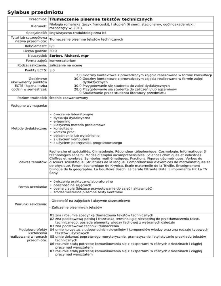 Sylabus przedmiotu Przedmiot: Tłumaczenie pisemne tekstów technicznych Filologia romańska (język francuski), I stopień [6 sem], stacjonarny, ogólnoakademicki, Kierunek: rozpoczęty w: 2013 Specjalność: lingwistyczno-traduktologiczna b5 Tytuł lub szczegółowa Tłumaczenie pisemne tekstów technicznych nazwa przedmiotu: Rok/Semestr: II/3 Liczba godzin: 30,0 Nauczyciel: Sorbet, Richard, mgr Forma zajęć: konwersatorium Rodzaj zaliczenia: zaliczenie na ocenę Punkty ECTS: 3,0 2,0 Godziny kontaktowe z prowadzącym zajęcia realizowane w formie konsultacji 30,0 Godziny kontaktowe z prowadzącym zajęcia realizowane w formie zajęć dydaktycznych 30,0 Przygotowanie się studenta do zajęć dydaktycznych 28,0 Przygotowanie się studenta do zaliczeń i/lub egzaminów 0 Studiowanie przez studenta literatury przedmiotu Godzinowe ekwiwalenty punktów ECTS (łączna liczba godzin w semestrze): Poziom trudności: średnio zaawansowany Wstępne wymagania: • • • • Metody dydaktyczne: • • • • • ćwiczenia laboratoryjne dyskusja dydaktyczna e-learning klasyczna metoda problemowa konsultacje korekta prac objaśnienie lub wyjaśnienie z użyciem komputera z użyciem podręcznika programowanego Recherche et spécialités. Climatologie. Répondeur téléphonique. Cosmologie. Informatique: 3 technologies sans fil. Modes d’emploi incompréhensibles. Sciences chimiques et industries. Chiffres et nombres. Symboles mathématiques. Fractions. Figures géométriques. Verbes du Zakres tematów: discours scientifique. Structures de la langue. Compréhension d’exercices de mathématiques et de physique. Forum économique de Krynica. École maternelle de la Triville. Enseignement bilingue de la géographie. La bouilloire Bosch. La carafe filtrante Brita. L’imprimante HP. La TV Sony. • • Forma oceniania: • • Warunki zaliczenia: Modułowe efekty kształcenia realizowane w ramach przedmiotu: ćwiczenia praktyczne/laboratoryjne obecność na zajęciach ocena ciągła (bieżące przygotowanie do zajęć i aktywność) śródsemestralne pisemne testy kontrolne - Obecność na zajęciach i aktywne uczestnictwo - Zaliczenie pisemnych tekstów 01 zna i rozumie specyfikę tłumaczenia tekstów technicznych 02 zna podstawową polską i francuską terminologię niezbędną do przetłumaczenia tekstu technicznego, posiada elementy wiedzy fachowej z wybranych dziedzin 03 zna podstawowe techniki tłumaczenia 04 umie korzystać z odpowiednich słowników i kompendiów wiedzy oraz zna rodzaje typowych tekstów użytkowych 05 umie dokonać poprawnego merytorycznie, gramatycznie i stylistycznie przekładu tekstów technicznych 06 rozumie stałą potrzebę komunikowania się z ekspertami w różnych dziedzinach i ciągłej pracy nad warsztatem 07 rozumie stałą potrzebę komunikowania się z ekspertami w różnych dziedzinach i ciągłej pracy nad warsztatem Textes français: Activités du Centre de Langue Française de la Chambre de Commerce et d’Industrie de Paris. Sciences-techniques.com. Passeport pour les Sciences en français de l’INSA de Lyon: http://passeport.insa-lyon.fr/ Literatura: Polskie teksty: Forum ekonomiczny w Krynica (2012). Ecolematernelle Trójmiasto. Nauczanie geografii. Czajnik Bosch. Dzbanek filtujący do wody Brita.Drukarka HP. TV Sony. Dictionnaires en ligne FR -PL : http://fr.glosbe.com/ , http://fr.pons.eu/traduction , http:// translate.google.fr/?hl=frtab=wT#pl/fr/ Dodatkowe informacje: -