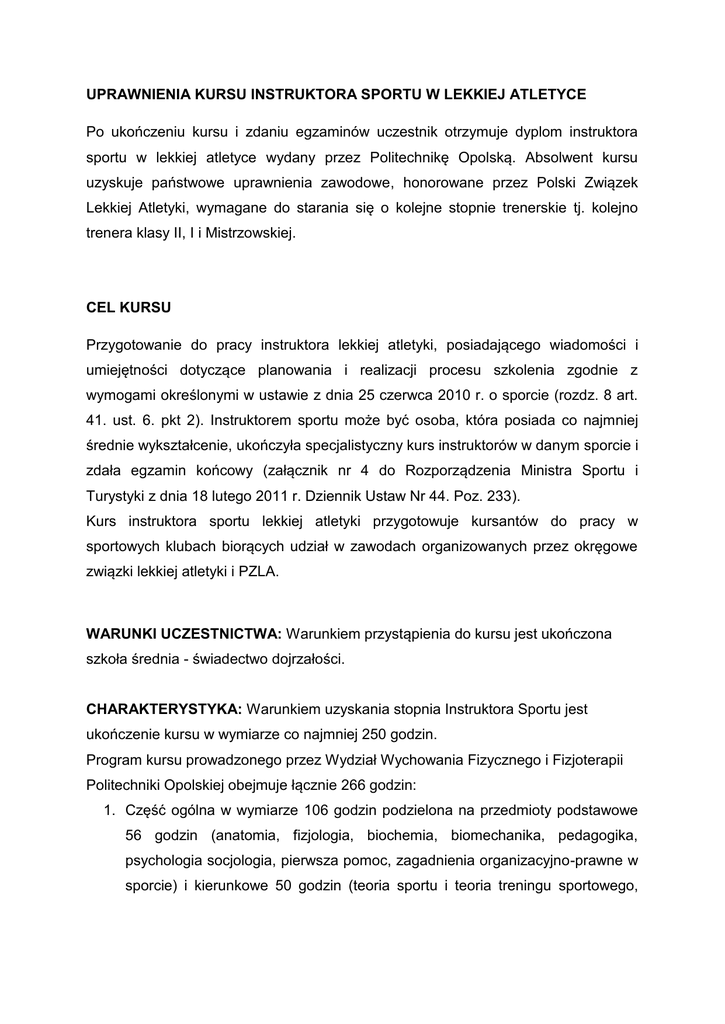 UPRAWNIENIA KURSU INSTRUKTORA SPORTU W LEKKIEJ