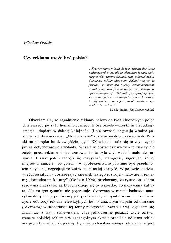 Wiesław Godzic Czy reklama może być polska? „ Krytycy często mówią, że telewizja nie dostarcza widzom produktów, ale że telewidzowie sami stają się prawdziwymi produktami; tymi, które telewizja dostarcza reklamodawcom. Jakkolwiek jest to prawda, to symbioza między reklamodawcami a widownią idzie jeszcze dalej, niż pokazuje to opisywana sytuacja. Telewidz, przeżywający sponsorowane życie - a w różnych zakresach dotyczy to większości z nas - jest powoli «od-twarzany» w obrazie reklamy". Leslie Savan, The Sponsored Life Obawiam się, że zagadnienie reklamy należy do tych kluczowych pojęć dzisiejszego pejzażu humanistycznego, które przede wszystkim wzbudzają emocje - dopiero w dalszej kolejności (i nie zawsze) angażują władze poznawcze i dyskursywne. „Nowoczesna" reklama na dobre zawitała do Polski na początku lat dziewięćdziesiątych XX wieku i stało się to zbyt szybko jak na dotychczasowe standardy. Weszła w obszar dziewiczy - to znaczy nie zajęty przez reklamę dotychczasową, bo ta była zbyt wątła i mało ekspansywna. I zaraz potem zaczęła się rozpychać, szarogęsić, sugerując, że jej miejsce w nauce i - co gorsza - w społeczeństwie powinno być przedmiotem radykalnej negocjacji ze wskazaniem na jej korzyść. W połowie lat dziewięćdziesiątych - dostrzegając kierunek takiego rozwoju - nazwałem reklamę „kontekstem kultury" (Godzić 1996), przekonany, że rysuje ona (i jest rysowana przez) tło, na którym dzieje się to wszystko, co nazywamy kulturą. Ale na tym rysunku nie poprzestaje. Cytowana w motcie badaczka amerykańskiej sceny publicznej jest przekonana, że symboliczne i uczuciowe życie odbiorcy reklam telewizyjnych jest w znacznym stopniu od-twarzane (re-created) w scenariuszu tej formy retorycznej (Savan 1994). Zgadzam się zasadniczo z takim stanowiskiem, chcę jednocześnie pokazać życie od-twarzane w polskiej reklamie w szczególnym okresie przejścia od stanu reklamy prymitywnej do dojrzałej. Pytanie o charakter owego od-twarzania jest Czy reklama może być polska? 65 jednocześnie pytaniem o to, czy polska reklama korzysta z rodzimych zasobów kultury, czy je wzbogaca, czy też rabunkowo nimi gospodaruje. Problem reklamy dotyczy także konieczności połączenia dwóch dyskursów. Pierwszy jest pozornie podstawowym dyskursem reklamy - to znaczy obejmuje to wszystko, co tworzy jej świat przedstawiony (to, co pokazane i dane do słyszenia). Drugi dyskurs jest dla niej kontekstem - jest to dyskurs kultury otaczającej reklamę. Warto postawić pytanie, który z nich jest podstawowy, który zaś poboczny i w jaki sposób wpływają na siebie a to problem bynajmniej nie banalny. Polska czy Polski - z reklamą w tle Polska droga do reklam przez lata osiemdziesiąte była znaczona marzeniami o konsumpcjonizmie i niemożliwością zanurzenia się w nim. Szarość i czerń stanu wojennego nie pozwalały błyszczeć reklamie - co zaś najważniejsze: jej błyski nie mogły być odniesione do produktów, gdyż nie było ich na półkach sklepowych. Tak więc na zdrowy rozum - reklamy nie było, bo nie było produktów do reklamowania i taka teza wydaje się porażająco oczywista. A jednak było także nieco inaczej: przykład poniższy pokazuje fascynację tą formą retoryczną w sytuacji, gdy nie istnieją fizyczne źródła tej fascynacji, czyli produkty. Mam na myśli szczególną sytuację Krakowa i okolic we wczesnych latach osiemdziesiątych. Mianowicie ze względu na krakowskie pochodzenie Papieża - jak głosiła plotka - można było na tym terenie oglądać program włoskiej telewzji RAI 1 retransmitowany w czasie rzeczywistym. Trudno mówić o nadzwyczajnie gorącym odbiorze programu: zarówno brak znajomości języka włoskiego, jak i wybitnie rozrywkowy charakter tego publicznego w końcu kanału nie sprzyjały głębszej identyfikacji z programem. Jednakże jedna cecha wydaje się szczególna: polski (krakowski) telewidz znajdował tam reklamy, w które wpatrywał się w hipnotycznym transie. Lejące się jogurty, spienione napoje, błyszczące czekolady i lśniące czystością toalety wszystko to odklejało się od znanej mu codzienności, stawało się elementem świata baśniowego, pragnącego zakwestionować prawa ciężkości, a przede wszystkim brak pieniędzy, jakichkolwiek, nie tylko waluty lub bonów peweksowskich. Wydaje się więc, że jest możliwa także taka funkcja reklamy, która odłącza ją od produktu, natomiast wiąże odbiorcę - ponad produktem - z ideologią świata (nie)przedstawionego. Podobny w wymowie znany mi osobiście przykład dotyczy stosunku Polaków do reklamy blisko dziesięć lat później. W Stanach Zjednoczonych na początku lat dziewięćdziesiątych znalazło się wielu emigrantów z krajów 66 Wiesław Godzic dawnego bloku wschodniego. Znaczna część z nich zapisała się na intensywne kursy języka angielskiego, prowadzone przez rdzennych Amerykanów, którzy wcześniej nie mieli zbyt wielu kontaktów z przedstawicielami innych kultur. Otóż amerykańscy nauczyciele opowiadali o kompletnie innym postrzeganiu roli reklam przez nich i przez ich uczniów. Wyobraźmy sobie sytuację, w której nauczyciel przygotowuje lekcję rozszerzającą, w jego przekonaniu, zasób słów negatywnych, wyrazów znurzenia i zniechęcenia. W zgodzie z własnym przekonaniem i kulturą jako temat wybiera telewizyjne spoty, domniemując, że podczas rozmowy z Polakami, Słowakami i Węgrami zaproponuje im użycie słów z tego właśnie pola semantycznego. Jakież było zdumienie, gdy okazało się, że emigranci uwielbiają reklamy i zgodnie z własnymi uczuciami chcieli używać pojęć akceptujących. Dydaktyczny pomysł legł w gruzach - ale dało to sporo do myślenia na temat roli reklam w nowych społeczeństwach świata konsumpcjonistycznego. Według socjologicznej oceny: „Jeśli reklama byłaby ikoną społeczeństwa kapitalistycznego, to nikt w historii nie widz