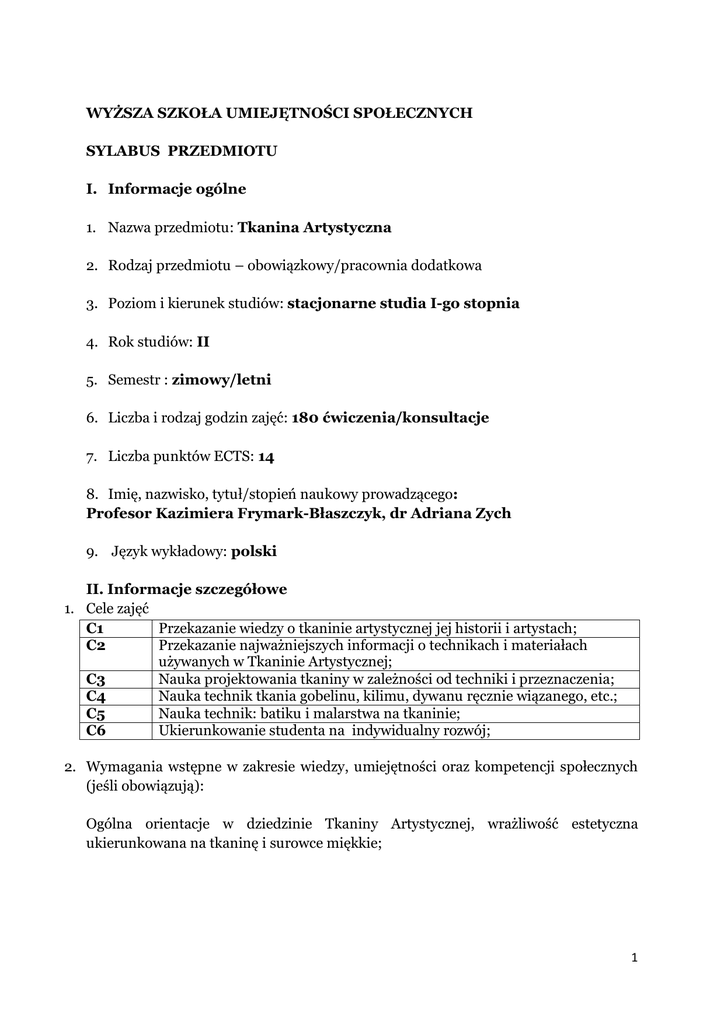 WYŻSZA SZKOŁA UMIEJĘTNOŚCI SPOŁECZNYCH SYLABUS PRZEDMIOTU I. Informacje ogólne 1. Nazwa przedmiotu: Tkanina Artystyczna 2. Rodzaj przedmiotu – obowiązkowy/pracownia dodatkowa 3. Poziom i kierunek studiów: stacjonarne studia I-go stopnia 4. Rok studiów: II 5. Semestr : zimowy/letni 6. Liczba i rodzaj godzin zajęć: 180 ćwiczenia/konsultacje 7. Liczba punktów ECTS: 14 8. Imię, nazwisko, tytuł/stopień naukowy prowadzącego: Profesor Kazimiera Frymark-Błaszczyk, dr Adriana Zych 9. Język wykładowy: polski II. Informacje szczegółowe 1. Cele zajęć C1 Przekazanie wiedzy o tkaninie artystycznej jej historii i artystach; C2 Przekazanie najważniejszych informacji o technikach i materiałach używanych w Tkaninie Artystycznej; C3 Nauka projektowania tkaniny w zależności od techniki i przeznaczenia; C4 Nauka technik tkania gobelinu, kilimu, dywanu ręcznie wiązanego, etc.; C5 Nauka technik: batiku i malarstwa na tkaninie; C6 Ukierunkowanie studenta na indywidualny rozwój; 2. Wymagania wstępne w zakresie wiedzy, umiejętności oraz kompetencji społecznych (jeśli obowiązują): Ogólna orientacje w dziedzinie Tkaniny Artystycznej, wrażliwość estetyczna ukierunkowana na tkaninę i surowce miękkie; 1 3. Efekty kształcenia w zakresie wiedzy, umiejętności oraz kompetencji społecznych Efekty kształcenia w odniesieniu do wiedzy Symbol Opis efektów kształcenia efektu kształcenia EK1 Zna historię Tkaniny Artystycznej na świecie oraz procesy kształtujące Polską Szkołę Tkaniny; EK2 EK3 Student rozróżnia i umie opisać podstawowe techniki tkactwa ludowego i artystycznego; Posiada wiedzę o materiałach używanych do realizacji tkanin historycznych i współczesnych; EK4 Zna procesy przygotowania i barwienia włókien naturalnych używanych do realizacji tkanin; EK5 Zna i opisuje twórczość artystów reprezentujących tę dziedzinę sztuki; Efekty kształcenia w odniesieniu do umiejętności Symbol Opis efektów kształcenia efektu kształcenia Przygotowuje projekty plastyczne dla wybranej techniki tkackiej; EK6 EK7 EK8 EK9 EK10 Samodzielnie wybiera i barwi surowce oraz materiały do realizacji projektu; Własnoręcznie realizuje projekty plastyczne w wybranej technice tkackiej; Posługuje się terminologią plastyczną, opisuje dzieła tkackie pod względem kompozycji, techniki i materiału; Przygotowuje prezentację projektu wraz z jego realizacją; Efekty kształcenia w odniesieniu do kompetencji społecznych Symbol efektu kształcenia EK11 Opis efektów kształcenia Dzięki swoim prezentacjom, wiedzy, umiejętnościom i zaangażowaniu poszerza społeczne zainteresowanie kulturą i tradycją. 2 4. Treści programowe Symbol treści programowych TP1 TP2 TP3 TP4 TP5 TP6 TP7 TP8 TP9 TP10 TP11 TP12 TP13 TP14 TP15 Opis treści programowych Historia Tkaniny Artystycznej na świecie, w szczególności sukcesy Polskiej Szkoły Tkaniny na arenie międzynarodowej; Technika gobelinowa: historia, przykłady, artyści, kompozycje i materiały; Nauka snucia osnowy, projektowanie tkanin; Indywidualne projektowanie gobelinu z uwzględnieniem podstawowych form geometrycznych; Wybór i opracowanie projektów, dostosowanie ich skali, przygotowanie i barwienie wełny do tkania; Przygotowanie warsztatu tkackiego, nauka splotów tkackich; Realizacja wybranych projektów w technice gobelinowej; Realizacja wybranych projektów w technice gobelinowej – kontynuacja, przygotowanie projektów i realizacji do ekspozycji; Miniatura tkacka: przykłady, artyści, wystawy, możliwości materiałowe i techniczne; Realizacja miniatury o kompozycji statycznej w dowolnej technice i materiale, charakteryzującej się świeżym nowatorskim podejściem do tematu; Realizacja miniatury o kompozycji dynamicznej w dowolnej technice i materiale, charakteryzującej się nowatorskim podejściem do tematu, przygotowanie miniatur do ekspozycji; Batik i malarstwo na tkaninie: pochodzenie i historia techniki, wpływ na sztukę europejską – prezentacje studentów; Przygotowanie materiałów, barwników i warsztatu do realizacji batiku, ćwiczenia obrazujące technikę i jej możliwości; Przygotowanie indywidualnych projektów, wybór projektów do realizacji, rozpoczęcie realizacji własnego projektu w technice batiku; Realizacja wybranych projektów; kontynuacja realizacji, utrwalanie batików, przygotowanie prezentacji projektów; Odniesienie do efektów kształcenia dla przedmiotu (symbol efektów) EK1, EK5 EK1, EK2, EK3, EK5, EK8, EK9 EK6 EK4, EK6, EK7, EK8, EK2, EK7, EK8, EK7, EK8 EK7, EK8, EK10 EK1, EK2, EK3, EK5, EK9 EK3, EK4, EK6, EK7, EK8 EK3, EK4, EK6, EK7, EK8, EK10, EK11 EK1, EK2, EK3, EK4, EK5, EK9, EK11 EK2, EK3, EK4, EK6, EK7, EK8; EK6, EK7, EK8,EK10, EK4, EK7 EK8, EK8, , EK4, EK7, EK8, EK10, EK 11 3 5. Literatura podstawowa: - Dyrenforth Noel „Batik – modern concepts and techniques” Batsford 2003 - Huml Irena “Współczesna tkanina polska” Arkady W-wa 1989 - Wrońska-Friend Maria „Sztuka woskiem pisana” Gondwana, W-wa 2008 - Storey Joyce „Days and Fabrics” Thames and Hudson Ltd. Londyn 1992 artykuły: - Jurga Halina “Polska Tkanina Artystyczna 1945 – 60” CMW, Łódź 1977 - Kondratiukowa Krystyna „Unikatowa tkanina polska 1961 – 72” CMW, Łódź 1977 dodatkowa: - Ward Michael „Art. And Design in Textiles” Van Nostrand Reinhold Com. - Huml Irena “Polska Sztuka Stosowana XX wieku” Wyd. Art. i Flmowe, Warszawa - Huml Irena „Sztuka przedmiotu – przedmiot sztuki” Instytut Sztuki PAN W-wa 2003 - Królikowska Elżbieta, Woźniak Alicja „Tkackie obrazy” Muzeum Archeolog. i Etnograf. w Łodzi 1995 - Markiewicz Małgorzata „Łódź i tkanina, rola Łodzi w sukcesie polskiej sztuki włókna” – artykuł w „Sztuka w Łodzi” Stowarzyszenie Historyków Sztuki, Łódź 2001 6. Informacja o przewidywanej możliwości wykorzystania e-learningu Nie przewiduje się. 7. Odniesienie efektów kształcenia przedmiotu do efektów kształcenia ustalonych 