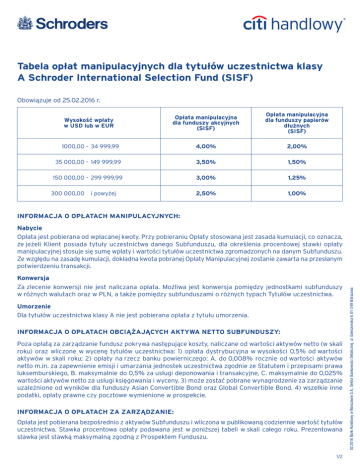 Tabela opłat manipulacyjnych dla tytułów uczestnictwa klasy A Schroder International Selection Fund (SISF) Obowiązuje od 25.02.2016 r. Wysokość wpłaty w USD lub w EUR Opłata manipulacyjna dla funduszy akcyjnych (SISF) Opłata manipulacyjna dla funduszy papierów dłużnych (SISF) 1000,00 – 34 999,99 4,00% 2,00% 35 000,00 – 149 999,99 3,50% 1,50% 150 000,00 – 299 999,99 3,00% 1,25% 300 000,00 – i powyżej 2,50% 1,00% INFORMACJA O OPŁATACH MANIPULACYJNYCH: Konwersja Za zlecenie konwersji nie jest naliczana opłata. Możliwa jest konwersja pomiędzy jednostkami subfunduszy w różnych walutach oraz w PLN, a także pomiędzy subfunduszami o różnych typach Tytułów uczestnictwa. Umorzenie Dla tytułów uczestnictwa klasy A nie jest pobierana opłata z tytułu umorzenia. INFORMACJA O OPŁATACH OBCIĄŻAJĄCYCH AKTYWA NETTO SUBFUNDUSZY: Poza opłatą za zarządzanie fundusz pokrywa następujące koszty, naliczane od wartości aktywów netto (w skali roku) oraz wliczone w wycenę tytułów uczestnictwa: 1) opłata dystrybucyjna w wysokości 0,5% od wartości aktywów w skali roku; 2) opłaty na rzecz banku powierniczego: A. do 0,008% rocznie od wartości aktywów netto m.in. za zapewnienie emisji i umarzania jednostek uczestnictwa zgodnie ze Statutem i przepisami prawa luksemburskiego, B. maksymalnie do 0,5% za usługi deponowania i transakcyjne, C. maksymalnie do 0,025% wartości aktywów netto za usługi księgowania i wyceny. 3) może zostać pobrane wynagrodzenie za zarządzanie uzależnione od wyników dla funduszy Asian Convertible Bond oraz Global Convertible Bond. 4) wszelkie inne podatki, opłaty prawne czy pocztowe wymienione w prospekcie. INFORMACJA O OPŁATACH ZA ZARZĄDZANIE: Opłata jest pobierana bezpośrednio z aktywów Subfunduszu i wliczona w publikowaną codziennie wartość tytułów uczestnictwa. Stawka procentowa opłaty podawana jest w poniższej tabeli w skali całego roku. Prezentowana stawka jest stawką maksymalną zgodną z Prospektem Funduszu. 1/2 02.2016 Bank Handlowy w Warszawie S.A., Sektor Bankowości Detalicznej, ul. Goleszowska 6, 01-249 Warszawa Nabycie Opłata jest pobierana od wpłacanej kwoty. Przy pobieraniu Opłaty stosowana jest zasada kumulacji, co oznacza, że jeżeli Klient posiada tytuły uczestnictwa danego Subfunduszu, dla określenia procentowej stawki opłaty manipulacyjnej stosuje się sumę wpłaty i wartości tytułów uczestnictwa zgromadzonych na danym Subfunduszu. Ze względu na zasadę kumulacji, dokładna kwota pobranej Opłaty Manipulacyjnej zostanie zawarta na przesłanym potwierdzeniu transakcji. Klasa aktywów Fundusze akcyjne Fundusze papierów dłużnych Nazwa funduszu Tytuły uczestnictwa EUR – typ USD Stawka EUR – USDPLNprowizji za Hedged Hedged Hedged zarządzanie Schroder ISF Asian Equity Yield Acc 1,50% Schroder ISF Greater China Acc 1,50% Schroder ISF Global Dividend Maximiser Acc Schroder ISF Euro Equity Acc Schroder ISF Emerging Markets Acc Schroder ISF Euro Corporate Bond Acc 1,50% 1,50% 1,50% 0,75% Acc – akumulacyjne, Dis – dywidendowe Tytuły uczestnictwa typ Dis – tytuły uczestnictwa wypłacające dywidendę wyliczoną według kwoty zgromadzonej w funduszu na dzień naliczenia dywidendy. Szczegóły dostępne są w oddziałach Banku. Tytuły uczestnictwa typ Acc – tytuły uczestnictwa, które nie wypłacają dywidendy. Dodatkowe szczegóły na temat wynagrodzenia uzyskiwanego przez Bank z tytułu świadczenia na rzecz Towarzystwa czynności przyjmowania i przekazywania zleceń nabywania i odkupywania oraz przekazywania innych oświadczeń woli dotyczących jednostek uczestnictwa są dostępne u Opiekuna Klienta w Oddziale. Opłaty określone w Tabeli Opłat są stosowane przy zbywaniu Jednostek Uczestnictwa zapisywanych na rejestrach otwartych za pośrednictwem Banku Handlowego w Warszawie S.A. Produkty inwestycyjne są dostępne wyłącznie dla posiadaczy Konta Osobistego Citibank. Inwestycje w Fundusze nie są zobowiązaniem oraz nie są gwarantowane przez Bank Handlowy w Warszawie S.A. ani żaden z podmiotów powiązanych lub zależnych. Tytuły uczestnictwa Funduszy nie są depozytem bankowym. Inwestycje w Fundusze są obarczone ryzykiem inwestycyjnym, włącznie z możliwością utraty kapitału. Dotychczasowe wyniki funduszy nie stanowią gwarancji ich przyszłych zysków. Inwestycje w jednostki oraz tytuły uczestnictwa nie są gwarantowane przez Skarb Państwa, Bankowy Fundusz Gwarancyjny lub jakiekolwiek inne instytucje rządowe. Szczegółowe informacje o Funduszu są dostępne w prospekcie Informacyjnym Funduszu dostępnym w oddziale Banku. Przed podjęciem decyzji o zainwestowaniu w Fundusz należy zapoznać się z Prospektem Informacyjnym Funduszu, zawierającym w szczególności informacje o czynnikach wpływających na rentowność inwestycji, w tym czynnikach ryzyka. Zasady realizacji zleceń określone są w Prospekcie Funduszu. Prospekty Informacyjne Funduszy dostępne są w oddziałach Banku oraz na stronie www.online.citibank.pl Imię i nazwisko Klienta ……………………………….........….....………………………………… PESEL ………………………………...…......………………………………… GRB ……………………………...…......…………………………………… Data …………………………………….....……………………………… Podpis Klienta …………………………………………………………………………………………………….....………………………… (SV) …………………………………………………………………… 2/2 02.2016 Bank Handlowy w Warszawie S.A., Sektor Bankowości Detalicznej, ul. Goleszowska 6, 01-249 Warszawa Dodatkowe szczegóły na temat zasad pobierania opłat są dostępne u Opiekuna Klienta w Oddziale. Bank otrzymuje od Towarzystw Funduszy Inwestycyjnych oraz Funduszy Zagranicznych wynagrodzenie w wysokoś