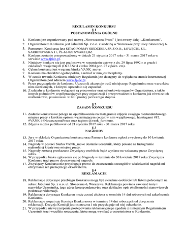 REGULAMIN KONKURSU §1 POSTANOWIENIA OGÓLNE 1. Konkurs jest organizowany pod nazwą „Nowoczesna Praca” i jest zwany dalej: „Konkursem”. 2. Organizatorem Konkursu jest Jabulani Sp. z o.o. z siedzibą w Warszawie przy ulicy Słonecznej 6. 3. Partnerem Konkursu jest SITAG FORMY SIEDZENIA SP. Z O.O., ŁOWĘCIN, UL. SARBINOWSKA 11, PL-62-020 SWARZĘDZ 4. Konkurs zostanie przeprowadzony w dniach 21 stycznia 2017 roku - 31 marca 2017 roku w serwisie www.fpiec.pl. 5. Niniejszy konkurs nie jest grą losową w rozumieniu ustawy z dn. 29 lipca 1992 r. o grach i zakładach wzajemnych (Dz.U.Nr 4 z roku 2004 poz. 27 z późn. zm). 6. Celem konkursu jest wygrana biurka VANK_move. 7. Konkurs ma charakter ogólnopolski, a udział w nim jest bezpłatny. 8. W czasie trwania Konkursu niniejszy Regulamin jest dostępny do wglądu na stronie internetowej Organizatora pod adresem www.fpiec.pl. 9. Przez przystąpienie do konkursu Uczestnik akceptuje treść niniejszego Regulaminu oraz warunków nim określonych, z którymi uprzednio się zapoznał. 10. Z udziału w konkursie wyłączeni są pracownicy oraz członkowie organów Organizatora, a także innych podmiotów współpracujących przy organizacji i przeprowadzeniu konkursu jak również ich małżonkowie, powinowaci w linii prostej pierwszego stopnia. §2 ZASADY KONKURSU 11. Zadanie konkursowe polega na opublikowaniu na Instagramie zdjęcia swojego niestandardowego miejsca pracy z krótkim opisem wyjaśniającym co jest w nim wyjątkowego, hasztagami #F5, #VANK i #NowoczesnaPraca oraz tagiem @vank_furniture. 12. Zdjęcia można publikować od 21 stycznia 2017 roku - 31 marca 2017 roku §3 NAGRODY 13. Jury w składzie Organizatora konkursu oraz Partnera konkursu ogłosi zwycięzcę do 10 kwietnia 2017 roku. 14. Nagrodę w postaci biurka VANK_move dostanie uczestnik, który pokaże na Instagramie najbardziej kreatywne miejsce pracy. 15. Nagrody zostaną przekazane Zwycięzcy osobiście bądź wysłane na wskazany przez Zwycięzcę adres. 16. W przypadku braku zgłoszenia się po Nagrodę w terminie do 30 kwietnia 2017 roku Zwycięzca Konkursu traci prawo do przyznanej nagrody. 17. Zwycięzcy Konkursu nie przysługuje prawo do zastrzeżenia szczegółów właściwości nagród ani otrzymania ich pieniężnego ekwiwalentu. §4 REKLAMACJE 18. Reklamacje dotyczące przebiegu Konkursu mogą być składane osobiście lub listem poleconym na adres: Jabulani Sp. z o.o. ul. Słoneczna 6, Warszawa. Reklamacja powinna zawierać imię i nazwisko Uczestnika, jego adres korespondencyjny oraz dokładny opis okoliczności stanowiących podstawę reklamacji. 19. Reklamacja dotycząca Konkursu może zostać złożona w terminie 14 dni roboczych od zakończenia Konkursu. 20. Reklamacje rozpatruje Komisja Konkursowa w terminie 14 dni roboczych od doręczenia reklamacji. Decyzja Komisji jest ostateczna i nie przysługuje od niej odwołanie. 21. W przypadku niewyczerpania postępowania reklamacyjnego zgodnie z niniejszym Regulaminem Uczestnik traci wszelkie roszczenia, które mogą wynikać z uczestnictwa w Konkursie. 22. Organizator Konkursu nie odpowiada za wady fizyczne nagrody. Wszelkie roszczenia z rękojmi oraz udzielonych gwarancji należy zgłaszać do producenta. §6 POSTANOWIENIA KOŃCOWE 23. Regulamin Konkursu dostępny jest na stronie www.fpiec.pl 24. Organizator jest uprawniony do zmiany postanowień niniejszego Regulaminu. Dotyczy to w szczególności zmian terminów poszczególnych czynności konkursowych oraz zmian specyfikacji nagrody. Zmieniony Regulamin obowiązuje od czasu opublikowania go na stronie www.fpiec.pl 25. W przypadku wątpliwości co do zasad Konkursu Organizator zastrzega sobie prawo do interpretacji zasad i warunków przedstawionych w niniejszym Regulaminie. 26. Wszystkie treści zawarte w materiałach promocyjno-reklamowych mają jedynie charakter informacyjny. Niniejszy Regulamin jest jedynym dokumentem określającym szczegółowe zasady Konkursu. 27. Organizator zastrzega sobie prawo do przerwania Konkursu w dowolnym momencie jego trwania, bez podawania przyczyny. Informacja o przedterminowym zakończeniu Konkursu zostanie rozesłana mailowo do wszystkich uczestników lub umieszczona na stronie www.fpiec.pl 28. Wzięcie udziału w Konkursie jest równoznaczne z wyrażeniem zgody na przetworzenie danych osobowych uczestnika zgodnie z przepisami ustawy z dnia 29 sierpnia 1997r. o ochronie danych osobowych o ile dane takie będą ujawnione w toku konkursu i związku z jego przebiegiem. Zgodnie z arty. 24 ust. 1 z dnia 29 sierpnia 1997r. o ochronie danych osobowych ( Dz.U.Nr 133, poz. 883) Organizator.