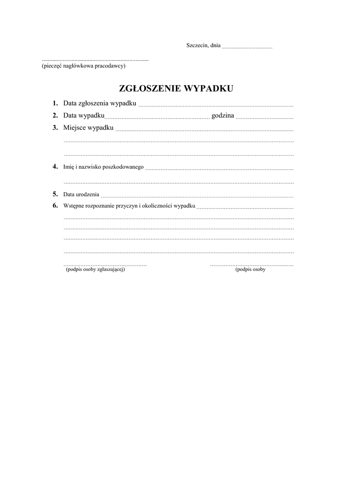 Szczecin, dnia ........................................................................ (pieczęć nagłówkowa pracodawcy) ZGŁOSZENIE WYPADKU 1. Data zgłoszenia wypadku 2. Data wypadku godzina 3. Miejsce wypadku 4. Imię i nazwisko poszkodowanego 5. Data urodzenia 6. Wstępne rozpoznanie przyczyn i okoliczności wypadku (podpis osoby zgłaszającej) (podpis osoby