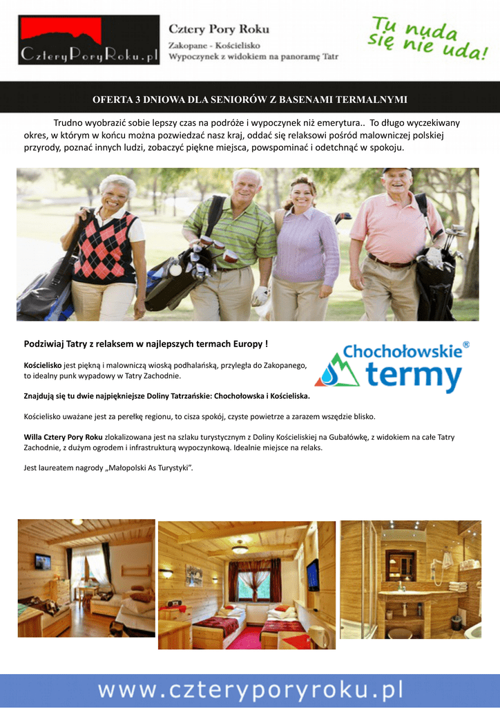 OFERTA 3 DNIOWA DLA SENIORÓW Z BASENAMI TERMALNYMI Trudno wyobrazić sobie lepszy czas na podróże i wypoczynek niż emerytura.. To długo wyczekiwany okres, w którym w końcu można pozwiedzać nasz kraj, oddać się relaksowi pośród malowniczej polskiej przyrody, poznać innych ludzi, zobaczyć piękne miejsca, powspominać i odetchnąć w spokoju. Podziwiaj Tatry z relaksem w najlepszych termach Europy ! Kościelisko jest piękną i malowniczą wioską podhalańską, przyległa do Zakopanego, to idealny punk wypadowy w Tatry Zachodnie. Znajdują się tu dwie najpiękniejsze Doliny Tatrzańskie: Chochołowska i Kościeliska. Kościelisko uważane jest za perełkę regionu, to cisza spokój, czyste powietrze a zarazem wszędzie blisko. Willa Cztery Pory Roku zlokalizowana jest na szlaku turystycznym z Doliny Kościeliskiej na Gubałówkę, z widokiem na całe Tatry Zachodnie, z dużym ogrodem i infrastrukturą wypoczynkową. Idealnie miejsce na relaks. Jest laureatem nagrody „Małopolski As Turystyki”. Przykładowy plan pobytu: Dzień 1: - Jadąc do Nas, grupa może odwiedzić Kraków: • • • • • • Rynek Starego Miasta Kościół Mariacki i ołtarz Wita Stwosza, wysłuchanie hejnału z wieży mariackiej Sukiennice Zamek Królewski na Wawelu: Katedra, Dzwon Zygmunta, groby królewskie w kryptach, dziedziniec zamkowy, Smocza Jama. Wieliczka Oświęcim - Przyjazd na obiad - Grupa udaje się na Gubałówkę – zielonym spacerowym szlakiem z widokiem na całą panoramę Tatr - czas przejścia około 1,5h. na Gubałówce czas wolny. - Powrót do ośrodka, tym samym szlakiem lub autobusem ( istnieje możliwość zjazdu kolejką do centrum Krupówek -za dopłatą, powrót do obiektu. - Biesiada grillowa ze zbójnikiem (bałamuta góralska) na wesoło. Sala Grillowa jest całkowicie zadaszona, co umożliwia zorganizowanie przyjęcia o każdej porze roku i co najważniejsze w każdych warunkach pogodowych. W Pakiecie grillowym, 2-3 h: • drzewo bez limitu • oprawa: naczynia, sztućce, kubki • kiełbasa • kaszanka • ziemniaki w skorupce • kęs boczku • karczek marynowany w ziołach • chleb wiejski • ketchup, musztarda • ogórki kiszone • smarowidło-smalec domowy • herbata Atrakcje bałamuty góralskiej, ok 1.30 h • picie z narty • alkomat po góralsku • nauka zbója • oscypek po cepersku • góralskie dyby Muzyka góralska z tła Dzień 2: -Śniadanie w formie bufetu szwedzkiego ( płatki 4 rodzaje, wędliny 3 rodzaje, 3 rodzaje serów, sałatka, pasta, mleko, pieczywo 3 rodzaje, jajko w majonezie, miód, dżem, jogurty, jarzynki konserwowe, coś na ciepło: jajecznica lub kiełbasa z wody lub parówka lub jajko sadzone na boczku lub frankfruterki, kawa, herbata, cytryna, kakao) -Całodzienny wyjazd na termy Chochołowskie Chochołowskie Termy są największym kompleksem termalnym w tej części Europy. Przestrzeń, którą dysponują, pozwala na wypoczynek w komfortowych warunkach, niezależnie od liczby osób w obiekcie. Mnogość atrakcji, duże baseny zewnętrzne, przylegające do nich połacie plaż trawiastych oraz szum pobliskiej rzeki Dunajec to nie lada perspektywa. W okresie sezonowym bilet 3h w cenie, bilet całodzienny dopłata 25 zł /osoba. Strefa Lecznicza • Beczki termalne - wanny z surową, siarkową wodą termalną o temperaturze 36 stopni Celsjusza; • basen termalny z wodą solankową jodowaną o temperaturze 32 stopni Celsjusza KĄPIELE SIARCZKOWE Kąpiele siarczkowe, ze względu na zawartość wody o lekko kwaśnym odczynie (pH 6,7) powodują zmiękczenie naskórka oraz jego przebudowę. Jest to tak zwane działanie keratoplastyczne, które wspomaga m.in. leczenie takich chorób skóry, jak łuszczyca, wypryski łojotokowe czy nadmierne rogowacenie skóry, bądź atopowe zapalenie skóry. Kąpiele siarczkowe wpływają też regenerująco na chrząstkę stawową, co sprzyja leczeniu chorób reumatycznych, choroby zwyrodnieniowej stawów, reumatoidalnego zapalenia stawów, zesztywniającego zapalenia stawów kręgosłupa, dyskopatii oraz zespołów pourazowych narządów ruchu. Kuracje wodą siarczkową mają też pozytywny wpływ na układ krwionośny. Mają m.in. działanie przeciwmiażdżycowe. Chronią też przed powikłaniami naczyniowymi w cukrzycy. WSKAZANIA • • • • • • • • • • • • • chorobie zwyrodnieniowej stawów i kręgosłupa dyskopatii rwie kulszowej reumatoidalnym zapaleniem stawów stanach pourazowych i przeciążeniach narządu ruchu przewlekłych chorobach skóry zaburzeniach krążenia obwodowego cukrzycy dnie moczanowej miażdżycy neuralgiach chorobach ginekologicznych łuszczycy Jeden litr wody w beczkach termalnych zawiera 600 mg siarczanów oraz ponad 300 mg wapnia i sodu i magnezu. KĄPIELE SOLANKOWE Lecznicza kąpiel solankowa to wyjątkowo przyjemna terapia. Woda wzbogacona minerałami ma dobroczynne właściwości dla skóry, kości i organów wewnętrznych. Polecana jest nawet dzieciom, zwłaszcza tym często łapiącym infekcje dróg oddechowych. Solanka uspokaja, poprawia nastrój, wycisza. JAK DZIAŁA SOLANKA Zabieg zmniejsza pobudliwość nerwów czuciowych i ruchowych, normalizuje ciśnienie tętnicze, polepsza regulację krążenia krwi i pobudza ukrwienie skóry, a także reguluje metabolizm skóry i poprawia jej odporność. WSKAZANIA • • • • • • • • • • • • • • przewlekłe zapalenia stawów reumatoidalne zapalenie stawów nerwobóle i niektóre postacie porażeń obwodowych stwardnienie rozsiane stany pourazowe i pooperacyjne narządu ruchu nerwice bezsenność obrzęk łuszczyca zaburzenia wegetatywne przewlekłe zapalenie przydatków stany rekonwalescencji po chorobach ginekologicznych dolegliwości klimakteryczne infekcje górnych dróg oddechowych -powrót na obiadokolację -wycieczka objazdowa po Zakopanem - (Wielka Krokiew, kapliczka w Jaszczurówce, zwiedzanie architektury Podhalańskiej –ulica Kościeliska, cmentarza na P