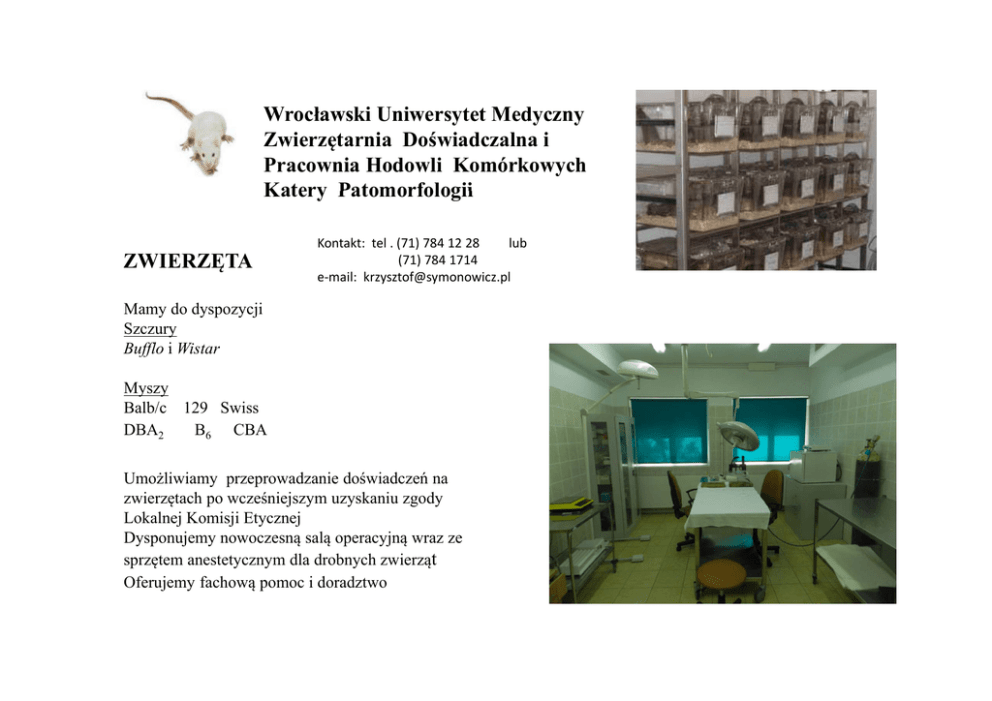 Wrocławski Uniwersytet Medyczny Zwierzętarnia Doświadczalna i Pracownia Hodowli Komórkowych Katery Patomorfologii ZWIERZĘTA Ę Kontakt: tel . (71) 784 12 28 lub (71) 784 1714 e‐mail: [email protected] Mamy do dyspozycji Szczury Bufflo i Wistar Myszy Balb/c 129 Swiss DBA2 B6 CBA Umożliwiamy przeprowadzanie doświadczeń na zwierzętach po wcześniejszym uzyskaniu zgody Lokalnej Komisji Etycznej Dysponujemy nowoczesną salą operacyjną wraz ze sprzętem anestetycznym dla drobnych zwierząt Oferujemy j y fachowąą pomoc p i doradztwo LINIE KOMÓRKOWE Posiadamy linie komórkowe MCF-77 MCF HT 29 HT-29 caco -2 SW480 SW 620 DLD -1 Fibroblasty mysie L929 Wykonujemy testy cytotoksyczności MTT XTT SRB W pracowni hodowli komórkowej pracujemy w warunkach sterylnych, przy użyciu nowoczesnego g sprzętu. p ę Prowadzimy y krótkotrwałe i długotrwałe g hodowle komórkowe w celu przeprowadzania zaplanowanych wcześniej eksperymentów Podstawowy sprzęt: komora laminarna inkubator CO2 licznik komórek mikroskop ik k odwrócony d ó wirówka