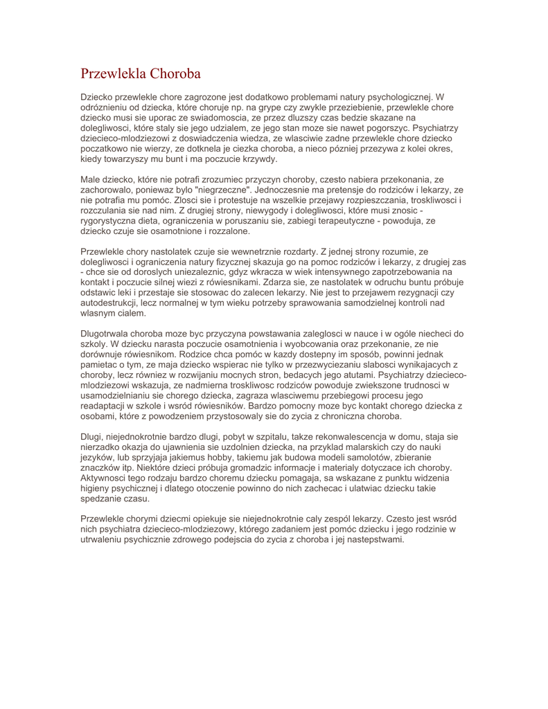 Przewlekla Choroba Dziecko przewlekle chore zagrozone jest dodatkowo problemami natury psychologicznej. W odróznieniu od dziecka, które choruje np. na grype czy zwykle przeziebienie, przewlekle chore dziecko musi sie uporac ze swiadomoscia, ze przez dluzszy czas bedzie skazane na dolegliwosci, które staly sie jego udzialem, ze jego stan moze sie nawet pogorszyc. Psychiatrzy dziecieco-mlodziezowi z doswiadczenia wiedza, ze wlasciwie zadne przewlekle chore dziecko poczatkowo nie wierzy, ze dotknela je ciezka choroba, a nieco pózniej przezywa z kolei okres, kiedy towarzyszy mu bunt i ma poczucie krzywdy. Male dziecko, które nie potrafi zrozumiec przyczyn choroby, czesto nabiera przekonania, ze zachorowalo, poniewaz bylo "niegrzeczne". Jednoczesnie ma pretensje do rodziców i lekarzy, ze nie potrafia mu pomóc. Zlosci sie i protestuje na wszelkie przejawy rozpieszczania, troskliwosci i rozczulania sie nad nim. Z drugiej strony, niewygody i dolegliwosci, które musi znosic rygorystyczna dieta, ograniczenia w poruszaniu sie, zabiegi terapeutyczne - powoduja, ze dziecko czuje sie osamotnione i rozzalone. Przewlekle chory nastolatek czuje sie wewnetrznie rozdarty. Z jednej strony rozumie, ze dolegliwosci i ograniczenia natury fizycznej skazuja go na pomoc rodziców i lekarzy, z drugiej zas - chce sie od doroslych uniezaleznic, gdyz wkracza w wiek intensywnego zapotrzebowania na kontakt i poczucie silnej wiezi z rówiesnikami. Zdarza sie, ze nastolatek w odruchu buntu próbuje odstawic leki i przestaje sie stosowac do zalecen lekarzy. Nie jest to przejawem rezygnacji czy autodestrukcji, lecz normalnej w tym wieku potrzeby sprawowania samodzielnej kontroli nad wlasnym cialem. Dlugotrwala choroba moze byc przyczyna powstawania zaleglosci w nauce i w ogóle niecheci do szkoly. W dziecku narasta poczucie osamotnienia i wyobcowania oraz przekonanie, ze nie dorównuje rówiesnikom. Rodzice chca pomóc w kazdy dostepny im sposób, powinni jednak pamietac o tym, ze maja dziecko wspierac nie tylko w przezwyciezaniu slabosci wynikajacych z choroby, lecz równiez w rozwijaniu mocnych stron, bedacych jego atutami. Psychiatrzy dzieciecomlodziezowi wskazuja, ze nadmierna troskliwosc rodziców powoduje zwiekszone trudnosci w usamodzielnianiu sie chorego dziecka, zagraza wlasciwemu przebiegowi procesu jego readaptacji w szkole i wsród rówiesników. Bardzo pomocny moze byc kontakt chorego dziecka z osobami, które z powodzeniem przystosowaly sie do zycia z chroniczna choroba. Dlugi, niejednokrotnie bardzo dlugi, pobyt w szpitalu, takze rekonwalescencja w domu, staja sie nierzadko okazja do ujawnienia sie uzdolnien dziecka, na przyklad malarskich czy do nauki jezyków, lub sprzyjaja jakiemus hobby, takiemu jak budowa modeli samolotów, zbieranie znaczków itp. Niektóre dzieci próbuja gromadzic informacje i materialy dotyczace ich choroby. Aktywnosci tego rodzaju bardzo choremu dziecku pomagaja, sa wskazane z punktu widzenia higieny psychicznej i dlatego otoczenie powinno do nich zachecac i ulatwiac dziecku takie spedzanie czasu. Przewlekle chorymi dziecmi opiekuje sie niejednokrotnie caly zespól lekarzy. Czesto jest wsród nich psychiatra dziecieco-mlodziezowy, którego zadaniem jest pomóc dziecku i jego rodzinie w utrwaleniu psychicznie zdrowego podejscia do zycia z choroba i jej nastepstwami.