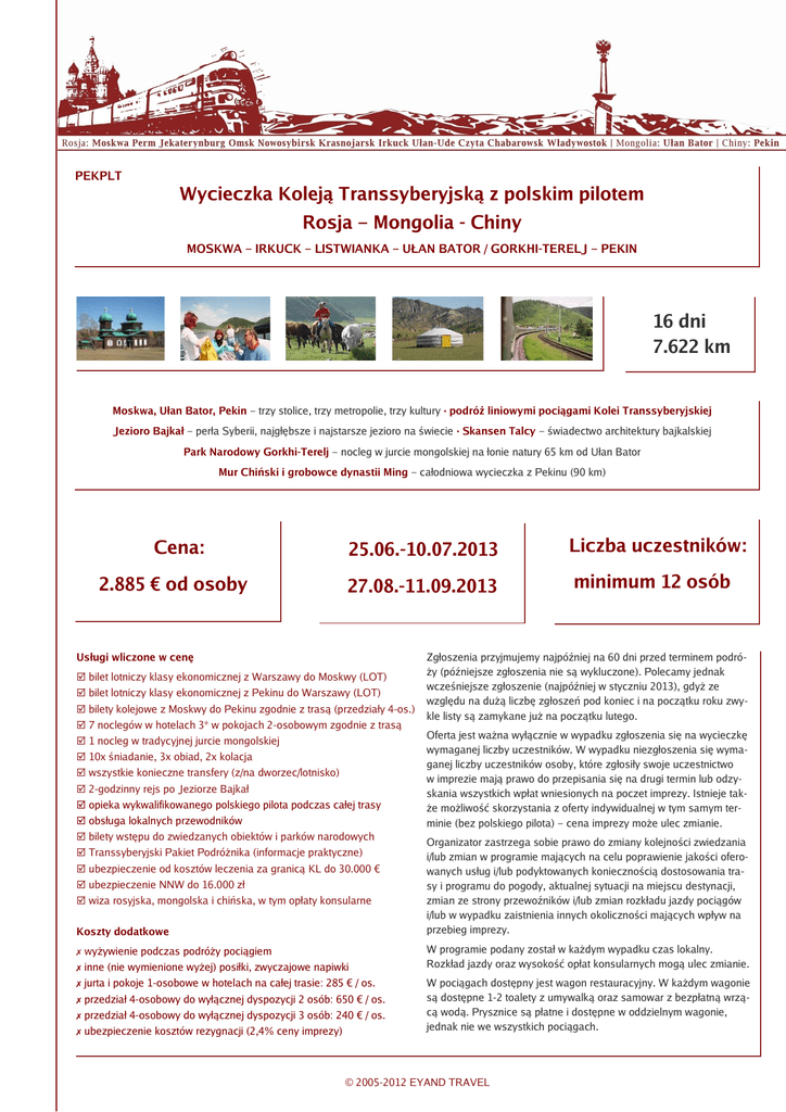 PEKPLT Wycieczka Koleją Transsyberyjską z polskim pilotem Rosja – Mongolia - Chiny MOSKWA – IRKUCK – LISTWIANKA – UŁAN BATOR / GORKHI-TERELJ – PEKIN 16 dni 7.622 km Moskwa, Ułan Bator, Pekin – trzy stolice, trzy metropolie, trzy kultury · podróż liniowymi pociągami Kolei Transsyberyjskiej Jezioro Bajkał – perła Syberii, najgłębsze i najstarsze jezioro na świecie · Skansen Talcy – świadectwo architektury bajkalskiej Park Narodowy Gorkhi-Terelj – nocleg w jurcie mongolskiej na łonie natury 65 km od Ułan Bator Mur Chiński i grobowce dynastii Ming – całodniowa wycieczka z Pekinu (90 km) Cena: 2.885 € od osoby 25.06.-10.07.2013 Liczba uczestników: 27.08.-11.09.2013 minimum 12 osób Usługi wliczone w cenę ☑ bilet lotniczy klasy ekonomicznej z Warszawy do Moskwy (LOT) ☑ bilet lotniczy klasy ekonomicznej z Pekinu do Warszawy (LOT) ☑ bilety kolejowe z Moskwy do Pekinu zgodnie z trasą (przedziały 4-os.) ☑ 7 noclegów w hotelach 3* w pokojach 2-osobowym zgodnie z trasą ☑ 1 nocleg w tradycyjnej jurcie mongolskiej ☑ 10x śniadanie, 3x obiad, 2x kolacja ☑ wszystkie konieczne transfery (z/na dworzec/lotnisko) ☑ 2-godzinny rejs po Jeziorze Bajkał ☑ opieka wykwalifikowanego polskiego pilota podczas całej trasy ☑ obsługa lokalnych przewodników ☑ bilety wstępu do zwiedzanych obiektów i parków narodowych ☑ Transsyberyjski Pakiet Podróżnika (informacje praktyczne) ☑ ubezpieczenie od kosztów leczenia za granicą KL do 30.000 € ☑ ubezpieczenie NNW do 16.000 zł ☑ wiza rosyjska, mongolska i chińska, w tym opłaty konsularne Koszty dodatkowe ✗ wyżywienie podczas podróży pociągiem ✗ inne (nie wymienione wyżej) posiłki, zwyczajowe napiwki ✗ jurta i pokoje 1-osobowe w hotelach na całej trasie: 285 € / os. ✗ przedział 4-osobowy do wyłącznej dyspozycji 2 osób: 650 € / os. ✗ przedział 4-osobowy do wyłącznej dyspozycji 3 osób: 240 € / os. ✗ ubezpieczenie kosztów rezygnacji (2,4% ceny imprezy) Zgłoszenia przyjmujemy najpóźniej na 60 dni przed terminem podróży (późniejsze zgłoszenia nie są wykluczone). Polecamy jednak wcześniejsze zgłoszenie (najpóźniej w styczniu 2013), gdyż ze względu na dużą liczbę zgłoszeń pod koniec i na początku roku zwykle listy są zamykane już na początku lutego. Oferta jest ważna wyłącznie w wypadku zgłoszenia się na wycieczkę wymaganej liczby uczestników. W wypadku niezgłoszenia się wymaganej liczby uczestników osoby, które zgłosiły swoje uczestnictwo w imprezie mają prawo do przepisania się na drugi termin lub odzyskania wszystkich wpłat wniesionych na poczet imprezy. Istnieje także możliwość skorzystania z oferty indywidualnej w tym samym terminie (bez polskiego pilota) – cena imprezy może ulec zmianie. Organizator zastrzega sobie prawo do zmiany kolejności zwiedzania i/lub zmian w programie mających na celu poprawienie jakości oferowanych usług i/lub podyktowanych koniecznością dostosowania trasy i programu do pogody, aktualnej sytuacji na miejscu destynacji, zmian ze strony przewoźników i/lub zmian rozkładu jazdy pociągów i/lub w wypadku zaistnienia innych okoliczności mających wpływ na przebieg imprezy. W programie podany został w każdym wypadku czas lokalny. Rozkład jazdy oraz wysokość opłat konsularnych mogą ulec zmianie. W pociągach dostępny jest wagon restauracyjny. W każdym wagonie są dostępne 1-2 toalety z umywalką oraz samowar z bezpłatną wrzącą wodą. Prysznice są płatne i dostępne w oddzielnym wagonie, jednak nie we wszystkich pociągach. © 2005-2012 EYAND TRAVEL Zapraszamy Państwa na ponad 2-tygodniową wycieczkę liniowymi pociągami Kolei Transsyberyjskiej. Oznacza to 7.622 km ciekawej trasy prowadzącej przez Syberię, wysokogórskie krajobrazy Uralu, liczne syberyjskie metropolie i wioski, następnie przez piękną i ciekawą rosyjską Republikę Buriacji i niemalże niezaludnione mongolskie stepy. Podczas całej trasy towarzyszy Państwu wykwalifikowany polski pilot. W pociągu będzie okazja do zawarcia nowych ciekawych znajomości, zapoznania się z inną kulturą i zrobienia pięknych zdjęć. Na peronach stacji pośrednich będą Państwo mieli okazję spróbowania świeżych regionalnych przysmaków. Podczas podróży przewidziane są postoje w wybranych ciekawych miejscowościach na trasie: Irkucku i Ułan Bator oraz pobyt na łonie natury – nad Jeziorem Bajkał w miejscowości Listwianka i w mongolskim Parku Narodowym Terelj połączony z noclegiem w tradycyjnej jurcie mongolskiej. W Listwiance będzie możliwość skosztowania bajkalskiego specjału – wędzonej ryby omul i skorzystania z tradycyjnej sauny rosyjskiej – banji. W programie przewidziany jest ponadto 2-godzinny rejs po Jeziorze Bajkał oraz całodniowa wycieczka, podczas której zobaczą Państwo jeden z najlepiej zachowanych odcinków słynnego Muru Chińskiego. Przebieg trasy Moskwa 1 dzień: Zbiórka na lotnisku w Warszawie o 13.00, lot do Moskwy. Transfer z lotniska do hotelu. Zakwaterowanie i nocleg. 2 dzień: Dziś zwiedzą Państwo Kreml, Plac Czerwony i okolice. W programie przewidziany jest także spacer po słynnej historycznej ulicy Arbat znanej z piosenek Bułata Okudżawy, przy której zamieszkiwał także Aleksander Puszkin. Czeka Państwa także wycieczka moskiewskim metrem, podczas której zobaczą Państwo wybrane najciekawsze stacje i przekonają się dlaczego określane są one mianem podziemnych pałaców. Po południu czas wolny. Nocleg w 3* hotelu w Moskwie. karczma. Ponadto można zwiedzić stare buriackie osiedle - kilka urządzonych wewnątrz jurt, w tym jurtę szamana. Po dotarciu do Irkucka zwiedzą Państwo miasto. Pozostanie także czas na zakupy przed dalszą podróżą. Późnym wieczorem odjazd pociągiem do Ułan Bator. Transsib: 9 dzień: Podróż pociągiem przez rosyjską Republikę Buriacji, a następnie mongolskie stepy i pustkowia. Ułan Bator, Park Narodowy