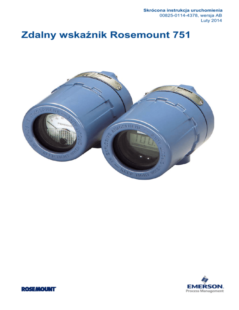 Skrócona instrukcja uruchomienia 00825-0114-4378, wersja AB Luty 2014 Zdalny wskaźnik Rosemount 751 Skrócona instrukcja uruchomienia Luty 2014 UWAGA Niniejsza instrukcja zawiera podstawowe informacje o instalacji zdalnego wskaźnika Rosemount® 751. Nie zawiera szczegółowych procedur konfiguracji, diagnostyki, obsługi, konserwacji, napraw oraz instalacji przeciwwybuchowych, ognioszczelnych lub iskrobezpiecznych (I.S.). Szczegółowe informacje można znaleźć w instrukcji obsługi wskaźnika Rosemount 751 (numer dokumentu 00809-0100-4378). Niniejsza instrukcja jest dostępna także w formie elektronicznej na stronie www.rosemount.com. OSTRZEŻENIE Wybuch może spowodować śmierć lub poważne obrażenia ciała: Instalacja wskaźnika w obszarze zagrożonym wybuchem musi być wykonana zgodnie z właściwymi normami, standardami i praktykami lokalnymi, narodowymi i międzynarodowymi. Ograniczenia związane z instalacją bezpieczną opisane są w rozdziale dotyczącym atestów w instrukcji obsługi wskaźnika Rosemount 751. ■ W instalacjach przeciwwybuchowych/ognioszczelnych nie wolno zdejmować pokrywy wskaźnika przy włączonym zasilaniu. Porażenie prądem elektrycznym może spowodować śmierć lub poważne obrażenia ciała. Należy unikać kontaktu z przewodami i zaciskami. Przewody mogą znajdować się pod wysokim napięciem, grożącym porażeniem elektrycznym. ■ Spis treści Instalacja . . . . . . . . . . . . . . . . strona 3 Atesty urządzenia . . . . . . . . strona 11 Konfiguracja . . . . . . . . . . . . . . strona 9 2 Skrócona instrukcja uruchomienia Luty 2014 Instalacja Złożenie Zdalny wskaźnik Rosemount 751 składa się z elementów pokazanych na ilustracji 1. W obudowie może znajdować się wskaźnik z wyświetlaczem analogowym lub cyfrowym ciekłokrystalicznym LCD. Oba wskaźniki są niezależne od innych części oraz są w pełni zamienne. Oba wskaźniki wkłada się w zaciski śrubowe obudowy, tak jak pokazano na ilustracji 1. Zespół wskaźnika składa się z elementów pokazanych na ilustracji 2. Ilustracja 1. Zespół wskaźnika Rosemount 751 w widoku perspektywicznym FF B B A A D C C G G E E H II K K M JJ LL N N A. Zaciski śrubowe B. Pierścień uszczelniający obudowy C. Zaciski okablowania polowego D. Dioda zabezpieczająca pętlę E. Gwintowany wspornik montażowy F. Opcjonalna obejma montażowa G. Śruba mocująca z podkładką H. Śruba typu U do montażu na wsporniku 2-calowym I. Obudowa J. Opcjonalna tuleja redukcyjna przepustu kablowego 3/4 na 1/2-cala (jeśli jest konieczna) K. Wskaźnik L. Tuleja M. Piankowy element dystansowy N. Pokrywa obudowy 3 Luty 2014 Skrócona instrukcja uruchomienia Ilustracja 2. Wskaźnik w widoku perspektywicznym B B A A C C DD K K E E FF G G H H II JJ A. Paski dociskowe B. Śruba mocująca w obudowie C. Podkładka do paska dociskowego D. Śruby mocujące do płyty montażowej E. Zaciski śrubowe (2) F. Płyta montażowa G. Płyta dystansowa H. Wyświetlacz LCD I. Tuleja J. Piankowy element dystansowy K. Przyciski konfiguracyjne 4 Luty 2014 Skrócona instrukcja uruchomienia Schematy połączeń Poniższe schematy połączeń umożliwiają podłączenie szeregowe lub równoległe zdalnego wskaźnika Rosemount 751 do przetworników Rosemount. W środowiskach z zakłóceniami elektrycznymi, w celu uzyskania najlepszych wyników, należy stosować kable ekranowane. Jeśli przetwornik 4-20 mA nie ma zacisków testowych, zaleca się podłączenie szeregowe zdalnego wskaźnika 751. Wskaźnik 751 jest zaprojektowany w taki sposób, że zarówno wskaźnik analogowy jak i cyfrowy LCD mogą być wyjęte z obudowy bez naruszania integralności pętli 4-20 mA. W przypadku podłączenia szeregowego, wyjęcie całego zespołu wskaźnika 751 spowoduje rozłączenie pętli sygnałowej. 5 Luty 2014 Skrócona instrukcja uruchomienia Ilustracja 3. Schemat podłączenia szeregowego wskaźnika Rosemount 751 Schematy podłączenia szeregowego przetwornika temperatury Rosemount 3144P i przetworników ciśnienia Rosemount 2051, 3051C i 3051S Zasilacz Zasilacz Rezystor obciążenia +– – + Rezystor obciążenia +– Opcjonalne uziemienie 3144P Opcjonalne uziemienie 2051 + – T T 751 751 + – + – Sygnał wejściowy 4–20 mA dc Sygnał wejściowy 4–20 mA dc przetwornika Rosemount 3144P przetwornika Rosemount 2051 Zasilacz +– 3051C + – Zasilacz Rezystor obciążenia + – T 751 751 + Sygnał wejściowy 4–20 mA dc przetwornika Rosemount 3051C 6 Opcjonalne uziemienie 3051S T – Rezystor obciążenia +– Opcjonalne uziemienie – + Sygnał wejściowy 4–20 mA dc przetwornika Rosemount 3051S Luty 2014 Skrócona instrukcja uruchomienia Jeśli przetwornik 4-20 mA zawiera zaciski testowe, zaleca się podłączenie równoległe wskaźnika 751. Przy podłączeniu równoległym konieczne jest wykorzystania zacisków testowych. Podłączenie wskaźnika 751 do zacisków dodatniego i ujemnego przetwornika 4-20 mA może wpłynąć na działanie pętli sygnałowej. Podłączenie równoległe umożliwia wyjęcie wskaźnika 751 bez wpływania na integralność pętli 4-20 mA. Dodatkowe wskaźniki 751 mogą być montowane bez zakłócania działania pętli sygnałowej. 7 Luty 2014 Skrócona instrukcja uruchomienia Ilustracja 4. Schemat podłączenia równoległego wskaźnika Rosemount 751 Schematy podłączenia równoległego przetwornika temperatury Rosemount 3144P i przetworników ciśnienia Rosemount 2051, 3051C i 3051S Zasilacz +– Zasilacz +– Opcjonalne uziemienie Rezystor obciążenia 3144P – + Opcjonalne uziemienie Rezystor obciążenia 2051 + – T T 751 751 + – + – Sygnał wejściowy 4–20 mA dc Sygnał wejściowy 4–20 mA dc przetwornika Rosemount 3144P przetwornika Rosemount 2051 Zasilacz Zasilacz Opcjonalne +– uziemienie 3051C Rezystor obciążenia + – Opcjonalne +– uziemienie 3051S Rezystor obciążenia + – T 751 751 – + Sygnał wejściowy 4–20 mA dc przetwornika Rosemount 3051C 8 T – + Sygnał wejści