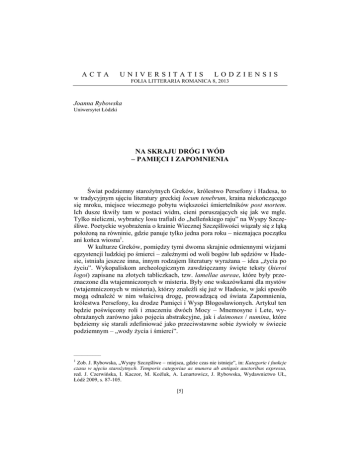 ACTA UNIVERSITATIS LODZIENSIS FOLIA LITTERARIA ROMANICA 8, 2013 Joanna Rybowska Uniwersytet Łódzki NA SKRAJU DRÓG I WÓD – PAMIĘCI I ZAPOMNIENIA Świat podziemny starożytnych Greków, królestwo Persefony i Hadesa, to w tradycyjnym ujęciu literatury greckiej locum tenebrum, kraina niekończącego się mroku, miejsce wiecznego pobytu większości śmiertelników post mortem. Ich dusze tkwiły tam w postaci widm, cieni poruszających się jak we mgle. Tylko nieliczni, wybrańcy losu trafiali do „helleńskiego raju” na Wyspy Szczęśliwe. Poetyckie wyobrażenia o krainie Wiecznej Szczęśliwości wiązały się z łąką położoną na równinie, gdzie panuje tylko jedna pora roku – nieznająca początku ani końca wiosna1. W kulturze Greków, pomiędzy tymi dwoma skrajnie odmiennymi wizjami egzystencji ludzkiej po śmierci – zależnymi od woli bogów lub sędziów w Hadesie, istniała jeszcze inna, innym rodzajem literatury wyrażana – idea „życia po życiu”. Wykopaliskom archeologicznym zawdzięczamy święte teksty (hieroi logoi) zapisane na złotych tabliczkach, tzw. lamellae aureae, które były przeznaczone dla wtajemniczonych w misteria. Były one wskazówkami dla mystów (wtajemniczonych w misteria), którzy znaleźli się już w Hadesie, w jaki sposób mogą odnaleźć w nim właściwą drogę, prowadzącą od świata Zapomnienia, królestwa Persefony, ku drodze Pamięci i Wysp Błogosławionych. Artykuł ten będzie poświęcony roli i znaczeniu dwóch Mocy – Mnemosyne i Lete, wyobrażanych zarówno jako pojęcia abstrakcyjne, jak i daimones / numina, które będziemy się starali zdefiniować jako przeciwstawne sobie żywioły w świecie podziemnym – „wody życia i śmierci”. –––––––––– 1 Zob. J. Rybowska, „Wyspy Szczęśliwe – miejsca, gdzie czas nie istnieje”, in: Kategorie i funkcje czasu w ujęciu starożytnych. Temporis categoriae ac munera ab antiquis auctoribus expressa, red. J. Czerwińska, I. Kaczor, M. Koźluk, A. Lenartowicz, J. Rybowska, Wydawnictwo UŁ, Łódź 2009, s. 87-105. [5] 6 Joanna Rybowska 1. W poszukiwaniu pierwotnego znaczenia Mnemosyne i Lethe2 Mnemosyne (MnhmosÚnh) – to dla starożytnych personifikacja Pamięci. Funkcjonowała w tej kulturze nie tylko jako pojęcie abstrakcyjne, ale także jako bóstwo odznaczające się różnie pojmowanymi mocami związanymi z Pamięcią i zdolnościami do zapamiętywania. W podobny sposób – jako abstrakcję i bóstwo – pojmowano także jej rodzoną siostrę Temidę (Sprawiedliwość). Obie były córkami Uranosa i Gai3, należały do drugiej grupy Tytanów i Tytanidek zrodzonych z tej pary. Obie stały się także oblubienicami Zeusa. Do Mnemosyne Olimpijczyk przybył na gody do Pierii u stóp Helikonu. Noc poślubna trwała dziewięć nocy, a jej skutkiem były narodziny dziewięciu córek zwanych Muzami4, „dziewcząt dziewiczych, „wysmukłych”, „wszystko wiedzących”5. W twórczości poetów – począwszy od epoki archaicznej aż po późną Starożytność – Mnemosyne będzie przywoływana i opisywana przede wszystkim jako nieśmiertelna matka uzdolnionych Muz: MnhmosÚnhn m n prîta qeîn ™gšrairen ¢oidÍ mhtšra Mous£wn. Z bogów wpierw Mnemosynę swą pieśnią wychwalał, Muz rodzicielkę6. Bardzo rzadko poeci mówią więcej o niej samej czy też o jej boskich kompetencjach. Przedstawiano ją spowitą w złoty peplos7, o pięknych włosach8 i dużych oczach9. Epitety te stanowią topos określający kanon urody wszystkich mieszkanek Olimpu. Zachowany fragment, pochodzący od Alkmana10, w którym wzmiankuje się o Mnemosyne – „o dużych oczach” – wydaje się jednak wska–––––––––– 2 Zob. też M. P. Nilsson, „Die Quellen der Lethe und der Mnemosyne“, in: Opuscula Selecta 1-3, C. W. K. Gleerup, Lund 1960, t. 3, s. 85-92. 3 Hes. Th. 135; Apoll. 1.8; D. S. 5.66.1. 4 Zob. Hes. Th. 55 i nast.; 915 i nast.; Pi. 52 f, (Pae. 6), 54-57; Pi. 52 g (Pae. 7); Pi. Od. Ist. 6.7475; Terp. fr. 6; Alcm. fr. 8; B. fr. 63; Apoll. Bibl. 1.13.54 i nast.; Pl. Tht. 191 c; Hym. orphic. 76, 1-2; Ant. Lib.; Meth 9; Nonn. D. 31.168; Ovid. Met. 6.114; 5. 267-8. Kanoniczna wersja mitu mówi o dziewięciu córkach Mnemosyne i Zeusa. O odstępstwach od tej liczby zob. Paus. Desc. 9.29.1, który podaje, że mieszkańcy Sykionu utrzymywali, iż Muzy występowały w liczbie trzech; oraz Cic. De Nat. Deor. 3.21.53. O razem ustawionych posągach Mnemosyne i Muz w Tegei wspomina Pauzaniasz, Desc. 8.47.3. 5 Pi. 52 f, (Pae. 6) 54-57. Zob. T. Mojsik, Antropologia metapoetyki. Muzy w kulturze greckiej od Homera do końca V w. p.n.e., Wydawnictwo Neriton, Warszawa 2011. 6 Hym. hom. ad Merc. 429-30, tłum. Wł. Apell, Algo, Toruń 2001, s. 152-153. 7 Pi. Od. Ist. 6, 74-75: baqÚzwnoi kÒrai crusopšplou MnamosÚnaj [...]. 8 Hes. Th. 915. 9 Alcm. fr. 133 in: Cambell, D. A., Greek Lyric II: Anacreon, Anacreontea, Choral Lyric from Olympus to Alcman, Cambridge, Mass. – London 1988. Fragment pochodzi z Etymologicum Gudianum. 10 Ibid. Na skraju dróg i wód – Pamięci i Zapomnienia 7 zywać, że poeta nie podkreśla piękna bogini, ale uwydatnia jej boską Moc, której użyczała śmiertelnym. Twierdzi bowiem, że to dzięki niej ludzie mogli „widzieć swą przeszłość dzięki myśleniu”. Zbyt krótki i zbyt enigmatyczny to fragment, abyśmy na jego podstawie mogli dociekać znaczenia, jakie przypisywał bogini poeta. Dzięki Hezjodowi wiemy natomiast, że Mnemosyne sprawowała władzę nad obszarem „żyznych wzgórz Eleutheru”, była ich władczynią (medšousa)11, a więc najprawdopodobniej bóstwem, któremu oddawano tam cześć kultową12. Dopiero późniejsze źródła uczą nas, iż Mnemosyne pojmowano bądź jako dobroczynne bóstwo obdarowywujące szczodrze ludzi, bądź wręcz boską Moc, zamieszkującą dusze zwykłych śmiertelników. Platon w Teajtecie13 utrzymuje, że Pamięć, a więc możliwość zapamiętywania wszelk