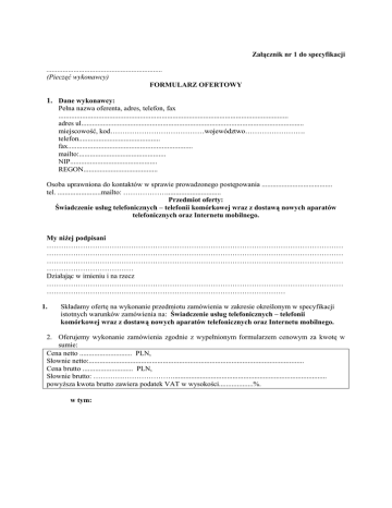 Załącznik nr 1 do specyfikacji ................................................................ (Pieczęć wykonawcy) FORMULARZ OFERTOWY 1. Dane wykonawcy: Pełna nazwa oferenta, adres, telefon, fax ............................................................................................................................... adres ul........................................................................................................................... miejscowość, kod…………………………………województwo……………………. telefon............................................. fax..................................................................... mailto:................................................ NIP................................................ REGON......................................... Osoba uprawniona do kontaktów w sprawie prowadzonego postępowania ....................................... tel. ........................mailto: ……………….............................. Przedmiot oferty: Świadczenie usług telefonicznych – telefonii komórkowej wraz z dostawą nowych aparatów telefonicznych oraz Internetu mobilnego. My niżej podpisani …………………………………………………………………………………………………………… …………………………………………………………………………………………………………… …………………………………………………………………………………………………………… ……………………………… Działając w imieniu i na rzecz …………………………………………………………………………………………………………… ……………………………………………………………………………………… 1. Składamy ofertę na wykonanie przedmiotu zamówienia w zakresie określonym w specyfikacji istotnych warunków zamówienia na: Świadczenie usług telefonicznych – telefonii komórkowej wraz z dostawą nowych aparatów telefonicznych oraz Internetu mobilnego. 2. Oferujemy wykonanie zamówienia zgodnie z wypełnionym formularzem cenowym za kwotę w sumie: Cena netto ............................. PLN, Słownie netto:....................................................................................................................... Cena brutto ............................ PLN, Słownie brutto: ……………………………..................................................................................... powyższa kwota brutto zawiera podatek VAT w wysokości...................%. w tym: A. Wartość abonamentów + połączeń: cena jednostkowa ilość netto (zł) l.p. treść (1) (2) (3) (4) 1 cena miesięczna abonamentu nr 1 5 2 cena miesięczna abonamentu nr 2 14 3 cena miesięczna abonamentu nr 3 32 4 Cena 1 minuty rozmów w sieci Wykonawcy dla abonamentu 2 i 3 10000* 5 6 7 Cena 1 minuty rozmów na telefony stacjonarne dla abonamentu 2 i 3 Cena 1 minuty rozmów do pozostałych operatorów dla abonamentu 2 i 3 Cena 1 minuty roamingu dla abonamentu 2 i 3 (5) (3 x 4) (6) (7) 15000* 26000* 1000* 8 Cena 1 SMS dla abonamentu 2 i 3 3000* 9 Cena 1 MMS dla abonamentu 2 i 3 500* 10 cena miesięcznego abonamentu nr 4 5 cena abonamentu miesięcznego nr 5 dla aktywnej karty SIM internetu 11 mobilnego Bez limitu transferu danych 1 cena abonamentu miesięcznego nr 6 dla aktywnej karty SIM internetu 12 mobilnego bez limitu transferu danych cena cena wartość brutto netto (zł) VAT (zł) (zł) 1 13 Cena razem miesięcznie 14 Cena razem za 24 miesiące (cały okres trwania umowy) ** W/w ceny dotyczą połączeń krajowych * Ilości wymienione w wierszach od 7 do 12 są ilościami szacunkowymi służącymi wyłącznie do obliczenia ceny oferty. ** Cena razem za 24 miesiące, wyliczona powyżej, nie stanowi wartości umowy a służy jedynie do porównania złożonych ofert. Wynagrodzenie Wykonawcy w okresie rozliczenia zawartej umowy będzie wyliczane na podstawie cen jednostkowych zawartych w tabeli powyżej i zrealizowanych połączeń oraz ilości aktywnych abonamentów. B. Cena aparatów telefonicznych oraz modemów Typ/model Sprzęt telefonu komórkowego/ modemu (1) (2) Cena netto (1 szt.) VAT Cena brutto (1 szt.) (3) (4) (5) Telefon aktywowany w ramach opłaty abonamentowej 1 (5 aparatów) Telefon aktywowany w ramach opłaty abonamentowej 2 – (14 aparatów) Telefon aktywowany w ramach opłaty abonamentowej 3 – (32 aparaty) Modem aktywny w ramach opłaty abonamentowej 5 Modem aktywny w ramach opłaty abonamentowej 6 Łączny koszt dostawy 51 telefonów oraz 2 modemów za cenę ofertową brutto .................... PLN (słownie ……. PLN, tj. za cenę ofertowa netto ……… PLN + podatek VAT (…%), w kwocie …… PLN, w tym cena za: 5 telefonów brutto ……. PLN, 14 telefonów brutto ……. PLN 32 telefonów brutto ……. PLN. 1 modem brutto………….PLN 1 modem brutto ………….PLN Łączna wartość umowy netto jest sumą [tabela A rubryka (5) + [cena netto 51 aparatów telefonicznych + cena dwóch modemów] Wartość netto, wartość brutto oraz należny podatek VAT należy wpisać w punkcie 2 niniejszego formularza ofertowego. Wartość ta stanowić będzie wartość oferty i umowy. 3. Oświadczamy, że zapoznaliśmy się ze Specyfikacją Istotnych Warunków Zamówienia i uznajemy się za związanych określonymi w niej zasadami postępowania, nie wnosimy do niej zastrzeżeń, posiadamy wszystkie informacje niezbędne do przygotowania oferty i wykonania przedmiotu zamówienia. 4. Uważamy się za związanych z ofertą przez czas wskazany w Specyfikacji Istotnych Warunków Zamówienia. 5. Akceptuję/my/ projekt umowy i w razie wybrania naszej oferty zobowiązujemy się do podpisania umowy na warunkach zawartych w specyfikacji istotnych warunków zamówienia, w miejscu i terminie wskazanym przez Zamawiającego. 6. Udzielę gwarancj