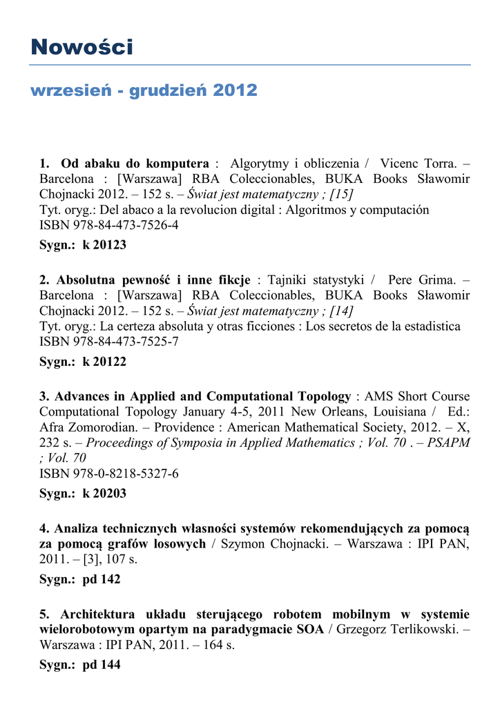 Nowości wrzesień - grudzień 2012 1. Od abaku do komputera : Algorytmy i obliczenia / Vicenc Torra. – Barcelona : [Warszawa] RBA Coleccionables, BUKA Books Sławomir Chojnacki 2012. – 152 s. – Świat jest matematyczny ; [15] Tyt. oryg.: Del abaco a la revolucion digital : Algoritmos y computación ISBN 978-84-473-7526-4 Sygn.: k 20123 2. Absolutna pewność i inne fikcje : Tajniki statystyki / Pere Grima. – Barcelona : [Warszawa] RBA Coleccionables, BUKA Books Sławomir Chojnacki 2012. – 152 s. – Świat jest matematyczny ; [14] Tyt. oryg.: La certeza absoluta y otras ficciones : Los secretos de la estadistica ISBN 978-84-473-7525-7 Sygn.: k 20122 3. Advances in Applied and Computational Topology : AMS Short Course Computational Topology January 4-5, 2011 New Orleans, Louisiana / Ed.: Afra Zomorodian. – Providence : American Mathematical Society, 2012. – X, 232 s. – Proceedings of Symposia in Applied Mathematics ; Vol. 70 . – PSAPM ; Vol. 70 ISBN 978-0-8218-5327-6 Sygn.: k 20203 4. Analiza technicznych własności systemów rekomendujących za pomocą za pomocą grafów losowych / Szymon Chojnacki. – Warszawa : IPI PAN, 2011. – [3], 107 s. Sygn.: pd 142 5. Architektura układu sterującego robotem mobilnym w systemie wielorobotowym opartym na paradygmacie SOA / Grzegorz Terlikowski. – Warszawa : IPI PAN, 2011. – 164 s. Sygn.: pd 144 6. Badanie bezkresu : Nieskończoność w matematyce / Grac Enrique Gracian. – Barcelona : [Warszawa] RBA Coleccionables, BUKA Books Sławomir Chojnacki 2012. – 136 s. – Świat jest matematyczny ; [18] Tyt. oryg.: Un descubrimiento sin fin : El infinito matematico si ISBN 978-84-473-7529-5 Sygn.: k 20127 7. Coarse-to-Fine Natural Language Processing / Slav Petrov. – Berlin : Springer, 2012. – XXII, 105 s. – Theory and Applications of Natural Language Processing Monographs ISBN 978-3-642-22742-4 Sygn.: k 20190 8. Combinatorial Optimization : Second International Symposium, ISCO 2012, Athens, Greece, April 19-21, Revised Selected Papers / Ed. : A. Ridha Mahjoub [i in.]. – Berlin : Springer, 2012. – XIV, 476 s. – Lecture Notes in Computer Science ; 7422 7422 ISBN 978-3-642-32146-7 Sygn.: k 20206 9. Computing and Combinatorics : 18th Annual International Conference, COCOON 2012. Sydney, Astralia, August 20-22, 2012. Proceedings / Eds. Joachim Gudmundsson , Julian Mestre, Taso Viglas. – Berlin : Springer, 2012. – XIV, 606 s. – Lecture Notes in Computer Science ; 7434 7434 ISBN 978-3-642-32240-2 Sygn.: k 20207 10. Constructibility and Mathemmatical Existence / Charles S. Chihara. – Oxford : Clarendon Press, 1991. – XV, 282 s. ISBN 0-19-823975-0 – ISBN 0-19-824817-2 Sygn.: k 20195 11. Construction Morphology / Geert Booijs. – Oxford : Oxford University Press, 2010. – XII, 298 s. ISBN 978-0-19-957192-5 Sygn.: k 20205 12. Cost-Sensitive Machine Learning / Ed. by Balaji Krishnapuram, Shipeng Yu, Bharat Rao. – Boca Raton : Taylor and Francis : Chapman and Hall : CRC ; 2012. – XVIII, 313 s. – Chapman and Hall/CRC Machine Learning and Pattern Recognition Series ISBN 978-1-4398-3925-6 Sygn.: k 20157 13. A Course in Topological Combinatorics / Mark de Longueville. – New York : Springer, 2013. – XII, 238 s. – Universitext ISBN 978-1-4419-7909-4 Sygn.: k 20215 14. Czwarty wymiar : Czy nasz świat to tylko cień innego? / Raul Ibanez. – Barcelona : [Warszawa] RBA Coleccionables, BUKA Books Sławomir Chojnacki 2012. – 161 s. – Świat jest matematyczny ; [12] Tyt. oryg.: La cuarta dimension : Es nuestro universo la sombra de otro? ISBN 978-84-473-7523-3 Sygn.: k 20120 15. Dylematy więźniów i zwycięskie strategie : Teoria gier / Jordi Deulofeu. – Barcelona : [Warszawa] RBA Coleccionables, BUKA Books Sławomir Chojnacki 2012. – 141 s. – Świat jest matematyczny ; [7] Tyt. oryg.: Prisioneros con dilemas y estrategias dominantes. Teoria de juegos ISBN 978-84-473-7518-9 Sygn.: k 20115, k 20075 16. Executable Modeling for Database Applications and Beyond Combining UML, query language, executable semantics and visual programming for truly object-oriented application development / Piotr Habela. – Warszawa : PJWSTK, 2011. – VIII, 230 s. – Monografie Naukowe ; t. 4 ISBN 978-83-89244-95-6 Sygn.: k 20201 17. Grupy liczebnikowe we współczesnym języku polskim : zarys opisu zależnościowego / Magdalena Derwojedowa. – Warszawa : Wydział Polonistyki UW , 2011. – 218 s. ISBN 978-83-62100-41-5 Sygn.: k 20192 18. Harmonia sfer : Astronomia i matematyka / Rosa Maria Ros. – Barcelona : [Warszawa] RBA Coleccionables, BUKA Books Sławomir Chojnacki 2012. – 175 s. – Świat jest matematyczny ; [30] Tyt. oryg.: La musica de las esferas : Astronomia y matematicas climatico ISBN 978-84-473-7541-7 Sygn.: k 20138 19. Harmonia tkwi w liczbach : Muzyka i matematyka/ Javier Arbones, Pablo Milrud. – Barcelona : [Warszawa] RBA Coleccionables, BUKA Books Sławomir Chojnacki 2012. – 167 s. – Świat jest matematyczny ; [10] Tyt. oryg.: La armonia es numerica : Musica y matematicas ISBN 978-84-473-7521-9 Sygn.: k 20078, k 20118 20. Hipoteki i równania : Matematyk W ekonomii / Lluis Artal, Josep Sales. – Barcelona : [Warszawa] RBA Coleccionables, BUKA Books Sławomir Chojnacki 2012. – 168 s. – Świat jest matematyczny ; [22] Tyt. oryg.: Hipotecas y ecuaciones : Las matematicas de la economia ISBN 978-84-473-7533-28 Sygn.: k 20130 21. Kobiety w matematyce : Od Hypatii do Emmy Noether ? Joaquin Navarro. – Barcelona : [Warszawa] RBA Coleccionables, BUKA Books Sławomir Chojnacki 2012. – 142 s. – Świat jest matematyczny ; [35] Tyt. oryg.: Mujeres matematicas : De Hipatia a Emmy Noether ISBN 978-84-473-7548-6 Sygn.: k 20143 22. Liczby pierwsze : W drodze do nieskończoności / Enrique Gracian. – Barcelona : [Warszawa] RBA Colleccionables, BUKA Books Sławomir Chojnacki 2012. – 143 s. – Świat jest matematyczny ; [3] Tyt. oryg.: Los numeros primos : Un largo camino al infinito ISBN 978-84-