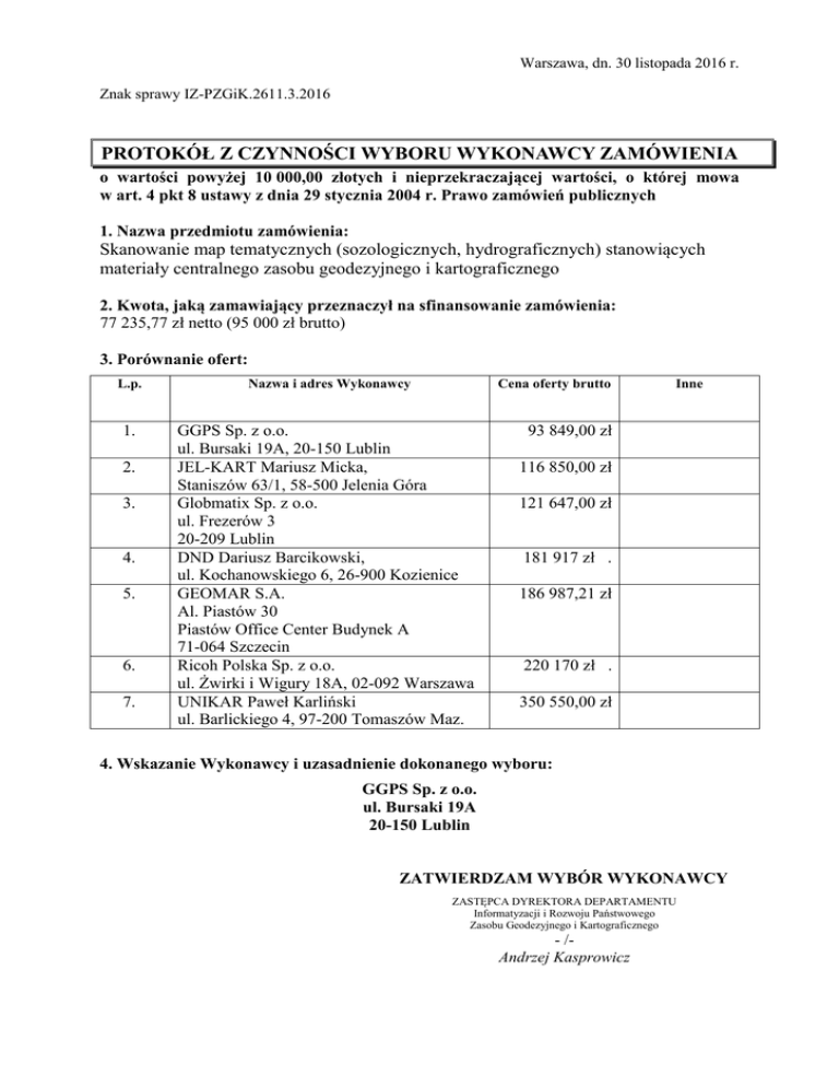 Warszawa, dn. 30 listopada 2016 r. Znak sprawy IZ-PZGiK.2611.3.2016 PROTOKÓŁ Z CZYNNOŚCI WYBORU WYKONAWCY ZAMÓWIENIA o wartości powyżej 10 000,00 złotych i nieprzekraczającej wartości, o której mowa w art. 4 pkt 8 ustawy z dnia 29 stycznia 2004 r. Prawo zamówień publicznych 1. Nazwa przedmiotu zamówienia: Skanowanie map tematycznych (sozologicznych, hydrograficznych) stanowiących materiały centralnego zasobu geodezyjnego i kartograficznego 2. Kwota, jaką zamawiający przeznaczył na sfinansowanie zamówienia: 77 235,77 zł netto (95 000 zł brutto) 3. Porównanie ofert: L.p. Nazwa i adres Wykonawcy 1. GGPS Sp. z o.o. ul. Bursaki 19A, 20-150 Lublin JEL-KART Mariusz Micka, Staniszów 63/1, 58-500 Jelenia Góra Globmatix Sp. z o.o. ul. Frezerów 3 20-209 Lublin DND Dariusz Barcikowski, ul. Kochanowskiego 6, 26-900 Kozienice GEOMAR S.A. Al. Piastów 30 Piastów Office Center Budynek A 71-064 Szczecin Ricoh Polska Sp. z o.o. ul. Żwirki i Wigury 18A, 02-092 Warszawa UNIKAR Paweł Karliński ul. Barlickiego 4, 97-200 Tomaszów Maz. 2. 3. 4. 5. 6. 7. Cena oferty brutto Inne 93 849,00 zł 116 850,00 zł 121 647,00 zł 181 917 zł . 186 987,21 zł 220 170 zł . 350 550,00 zł 4. Wskazanie Wykonawcy i uzasadnienie dokonanego wyboru: GGPS Sp. z o.o. ul. Bursaki 19A 20-150 Lublin ZATWIERDZAM WYBÓR WYKONAWCY ZASTĘPCA DYREKTORA DEPARTAMENTU Informatyzacji i Rozwoju Państwowego Zasobu Geodezyjnego i Kartograficznego - /Andrzej Kasprowicz