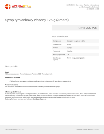 SK-FARM II Sp. z o.o. - Apteka Internetowa ul. Kleeberga 34, Białystok +48 42 279 40 05 Syrop tymiankowy złożony 125 g (Amara) Cena: 3,30 PLN Opis słownikowy Dostępność Dostępny w aptece w 24h Opakowanie 125 g Postać Syropy Producent AMARA Rodzaj rejestracji Lek Substancja czynna Thymi sirupus compositus Opis produktu Skład 100g syropu zawiera Thymi Extractum Fluidum 15,0, Thymolum 0,01. Wskazania i działanie W kaszlu towarzyszącym nieżytom górnych dróg oddechowych jako środek wykrztuśny. Przeciwwskazania Nie stosować przy nadwrażliwości na tymianek lub którykolwiek składnik syropu. Informacje dodatkowe Przed użyciem zapoznaj się z ulotką dołączoną do opakowania, która zawiera wskazania, przeciwwskazania, dane dotyczące działań niepożądanych i dawkowanie oraz informacje dotyczące stosowania i przechowywania produktu leczniczego, bądź skonsultuj się z lekarzem lub farmaceutą, gdyż każdy lek niewłaściwie stosowany zagraża Twojemu życiu lub zdrowiu. Służymy Państwu pomocą pod adresem [email protected]. Plik wygenerowano: 03-03-2017 Powered by TCPDF (www.tcpdf.org) Oprogramowanie sklepu: AptusShop