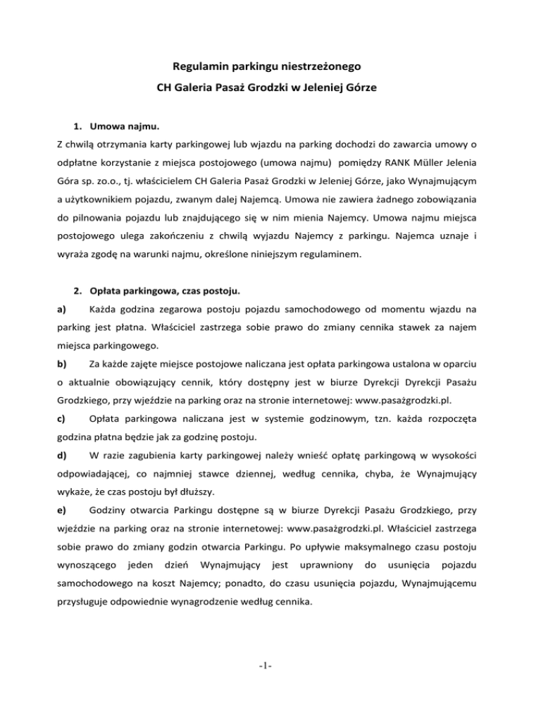 Regulamin parkingu niestrzeżonego CH Galeria Pasaż Grodzki w Jeleniej Górze 1. Umowa najmu. Z chwilą otrzymania karty parkingowej lub wjazdu na parking dochodzi do zawarcia umowy o odpłatne korzystanie z miejsca postojowego (umowa najmu) pomiędzy RANK Müller Jelenia Góra sp. zo.o., tj. właścicielem CH Galeria Pasaż Grodzki w Jeleniej Górze, jako Wynajmującym a użytkownikiem pojazdu, zwanym dalej Najemcą. Umowa nie zawiera żadnego zobowiązania do pilnowania pojazdu lub znajdującego się w nim mienia Najemcy. Umowa najmu miejsca postojowego ulega zakończeniu z chwilą wyjazdu Najemcy z parkingu. Najemca uznaje i wyraża zgodę na warunki najmu, określone niniejszym regulaminem. 2. Opłata parkingowa, czas postoju. a) Każda godzina zegarowa postoju pojazdu samochodowego od momentu wjazdu na parking jest płatna. Właściciel zastrzega sobie prawo do zmiany cennika stawek za najem miejsca parkingowego. b) Za każde zajęte miejsce postojowe naliczana jest opłata parkingowa ustalona w oparciu o aktualnie obowiązujący cennik, który dostępny jest w biurze Dyrekcji Dyrekcji Pasażu Grodzkiego, przy wjeździe na parking oraz na stronie internetowej: www.pasażgrodzki.pl. c) Opłata parkingowa naliczana jest w systemie godzinowym, tzn. każda rozpoczęta godzina płatna będzie jak za godzinę postoju. d) W razie zagubienia karty parkingowej należy wnieść opłatę parkingową w wysokości odpowiadającej, co najmniej stawce dziennej, według cennika, chyba, że Wynajmujący wykaże, że czas postoju był dłuższy. e) Godziny otwarcia Parkingu dostępne są w biurze Dyrekcji Pasażu Grodzkiego, przy wjeździe na parking oraz na stronie internetowej: www.pasażgrodzki.pl. Właściciel zastrzega sobie prawo do zmiany godzin otwarcia Parkingu. Po upływie maksymalnego czasu postoju wynoszącego jeden dzień Wynajmujący jest uprawniony do usunięcia pojazdu samochodowego na koszt Najemcy; ponadto, do czasu usunięcia pojazdu, Wynajmującemu przysługuje odpowiednie wynagrodzenie według cennika. -1- 3. Odpowiedzialność Wynajmującego. Wynajmujący nie ponosi żadnej odpowiedzialności za pojazdy, rzeczy stanowiące ich wyposażenie lub pozostawione w pojeździe oraz inne przedmioty pozostawione na parkingu. Wynajmujący odpowiada jedynie za udowodnione szkody wyrządzone z winy umyślnej przez jego pracowników lub pełnomocników. Najemca jest zobowiązany niezwłocznie zgłosić taką szkodę Wynajmującemu. Szkody widoczne muszą być zgłoszone w każdym wypadku przed opuszczeniem parkingu. Wynajmujący nie odpowiada za szkody, za które ponoszą odpowiedzialność inni najemcy lub osoby trzecie. 4. Odpowiedzialność Najemcy. Najemca odpowiada za wszystkie zawinione szkody wyrządzone Wynajmującemu lub osobom trzecim przez niego samego, jego pełnomocników lub osoby mu towarzyszące. Najemca jest zobowiązany zgłosić takie szkody Wynajmującemu niezwłocznie bez wezwania, najpóźniej przed opuszczeniem parkingu. Ponadto odpowiada on za zawinione zanieczyszczenia parkingu. 5. Prawo zastawu. Wynajmującemu z tytułu jego roszczeń wynikających z umowy najmu przysługuje prawo zatrzymania oraz ustawowe prawo zastawu na zaparkowanym pojeździe Najemcy. 6. Postanowienia dotyczące korzystania z parkingu. a) Pojazdy mogą być parkowane tylko na oznaczonych do tego celu miejscach postojowych. b) Zabronione jest parkowanie na miejscach oznaczonych szyldami informacyjnymi jako zarezerwowane dla stałych użytkowników bądź nie przeznaczonych na miejsca postojowe. W razie nieprzestrzegania tych postanowień przez Najemcę, Wynajmujący jest uprawniony, według swojego wyboru, do zlecenia odholowania pojazdu na koszt Najemcy i do naliczenia opłaty za niezgodne z regulaminem parkingu zajęcie miejsca postojowego. c) Wynajmujący jest uprawniony w przypadku nieprawidłowo zaparkowanego pojazdu dokonać jego blokady przy użyciu odpowiednich środków technicznych. -2- d) Najemca jest zobowiązany do przestrzegania przepisów obowiązującej Ustawy Prawo o ruchu drogowym, a w szczególności znaków drogowych i innych warunków korzystania z parkingu oraz do stosowania się do wskazówek pracowników Parkingu. e) Bezwzględnie zabronione jest parkowanie, przez osoby nieupoważnione na podstawie stosownych dokumentów, na miejscach dla inwalidów. W razie nieprzestrzegania tego postanowienia przez Najemcę, Wynajmujący jest uprawniony do zlecenia odholowania pojazdu na koszt Najemcy i do naliczenia opłaty za niezgodne z regulaminem parkingu zajęcie miejsca postojowego. 7. Przepisy bezpieczeństwa. a) Na terenie parkingu pojazdy mogą poruszać się z maksymalną prędkością 10 km/h. b) Na terenie parkingu zabronione jest palenie tytoniu, używanie ognia oraz nieuzasadnione włączanie i przeprowadzanie prób silników. c) Zabronione jest umyślne parkowanie pojazdów z nieszczelnym zbiornikiem paliwa. d) Przebywanie osób na terenie parkingu dozwolone jest jedynie w związku z parkowaniem. e) Na miejscach postojowych i jezdniach parkingu oraz na rampach wjazdowych i wyjazdowych zabronione jest naprawianie pojazdów, mycie lub sprzątanie wnętrza pojazdu, jak również spuszczanie płynów eksploatacyjnych. f) Na terenie parkingu obowiązuje zakaz jazdy jednośladów w szczególności rowerów i motocykli. 8. Postanowienia końcowe. a) Spory, które mogą wyniknąć z niniejszej umowy, podlegają rozstrzygnięciu przez Sąd powszechny, w którego okręgu Wynajmujący ma swoją siedzibę. b)W sprawach nieuregulowanych niniejszą umową zastosowanie mają przepisy Kodeksu Cywilnego. Zarząd – Rank Müller Jelenia Góra sp. zo.o. Jelenia Góra, dnia 28 Października 2010 r. Centrum Handlowe Galeria Pasaż Grodzki w Jeleniej Górze -3-