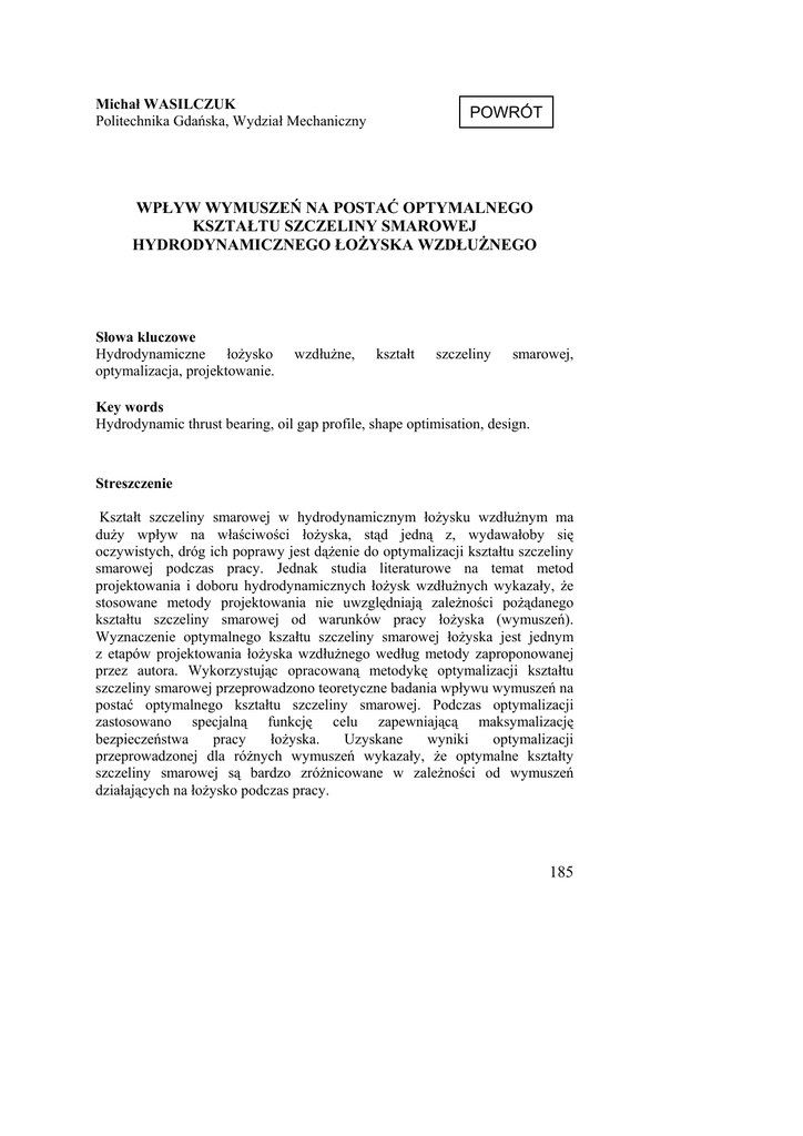 Michał WASILCZUK Politechnika Gdańska, Wydział Mechaniczny POWRÓT WPŁYW WYMUSZEŃ NA POSTAĆ OPTYMALNEGO KSZTAŁTU SZCZELINY SMAROWEJ HYDRODYNAMICZNEGO ŁOŻYSKA WZDŁUŻNEGO Słowa kluczowe Hydrodynamiczne łożysko optymalizacja, projektowanie. wzdłużne, kształt szczeliny smarowej, Key words Hydrodynamic thrust bearing, oil gap profile, shape optimisation, design. Streszczenie Kształt szczeliny smarowej w hydrodynamicznym łożysku wzdłużnym ma duży wpływ na właściwości łożyska, stąd jedną z, wydawałoby się oczywistych, dróg ich poprawy jest dążenie do optymalizacji kształtu szczeliny smarowej podczas pracy. Jednak studia literaturowe na temat metod projektowania i doboru hydrodynamicznych łożysk wzdłużnych wykazały, że stosowane metody projektowania nie uwzględniają zależności pożądanego kształtu szczeliny smarowej od warunków pracy łożyska (wymuszeń). Wyznaczenie optymalnego kszałtu szczeliny smarowej łożyska jest jednym z etapów projektowania łożyska wzdłużnego według metody zaproponowanej przez autora. Wykorzystując opracowaną metodykę optymalizacji kształtu szczeliny smarowej przeprowadzono teoretyczne badania wpływu wymuszeń na postać optymalnego kształtu szczeliny smarowej. Podczas optymalizacji zastosowano specjalną funkcję celu zapewniającą maksymalizację bezpieczeństwa pracy łożyska. Uzyskane wyniki optymalizacji przeprowadzonej dla różnych wymuszeń wykazały, że optymalne kształty szczeliny smarowej są bardzo zróżnicowane w zależności od wymuszeń działających na łożysko podczas pracy. 185 Uzyskane zróżnicowane wyniki optymalizacji w zależności od wymuszeń działających na łożysko przekonują do celowości wykorzystania optymalizacji kształtu szczeliny smarowej podczas projektowania łożyska. WPROWADZENIE – METODA SZCZELINY SMAROWEJ OPTYMALIZACJI KSZTAŁTU Optymalizację kształtu przeprowadzono według algorytmu przedstawionego na rys. 1 [1]. Celem optymalizacji jest uzyskanie takiego kształtu szczeliny smarowej (opisanego za pomocą 10 parametrów – zmiennych decyzyjnych), dla którego minimalna grubość filmu i maksymalna temperatura łożyska, wyznaczone za pomocą termohydrodynamicznego modelu szczeliny smarowej, są możliwie odległe od wartości dopuszczalnych. Podkreślenia wymaga fakt że według proponowanej metody projektowania wyznaczanie optymalnego kształtu szczeliny smarowej jest oddzielone od określania postaci konstrukcyjnej łożyska – kształt optymalny nie jest zatem związany z żadną konkretną postacią konstrukcyjną łożyska. Podczas optymalizacji stosowano oryginalną funkcję celu (1) uzależnioną od maksymalnej temperatury łożyska i minimalnej grubości filmu. (h −h ) + 0.1(hdop −hdobre) (tdop − tmax) + 0.1(tdop − tdobre) f(hmin, tmax) = dop min × hdop −hdobre tdop − tdobre −1 (1) gdzie: hminminimalna grubość filmu dla danego kształtu szczeliny tmax- maksymalna temperatura łożyska dla danego kształtu szczeliny tdop- dopuszczalna wartość maksymalnej temperatury łożyska hdop- dopuszczalna wartość minimalnej grubości szczeliny smarowej hdobrezadowalająca wartość minimalnej grubości szczeliny smarowej tdop- dopuszczalna wartość maksymalnej temperatury łożyska tdobrezadowalająca wartość maksymalnej temperatury łożyska 186 Dane: prędkość, obciążenie, środek smarowy, funkcja celu, początkowe wartości zmiennych decyzyjnych Wyznaczanie współczynników wielomianów opisujących kształt szczeliny smarowej Wyznaczenie lokalnych grubości filmu w węzłach siatki wykorzystywanej przez program obliczeń termohydrodynamicznych Wyznaczenie nowej wartości zmiennych decyzyjnych, według przyjętej metody optymalizacji Obliczenia THD - dla danego kształtu szczeliny smarowej wyznaczenie minimalnej grubości filmu i maksymalnej temperatury, strat tarcia, natężenia przepływu środka smarowego Wyznaczenie wartości funkcji celu TAK Czy wartość funkcji celu zmieniła się w ostatnim kroku więcej niż o założoną wartość (np. 1%) NIE Zapisywanie wyniku: optymalnego kształtu szczeliny smarowej Rys. 1. Schemat blokowy przebiegu optymalizacji [1] Fig. 1. Flow chart of the optimisation procedure [1] Warstwicowy wykres funkcji celu przedstawiono na rys. 2. Przebieg opracowanej funkcji celu jest taki, że jej nachylenie maleje w miarę oddalania się wartości grubości filmu lub temperatury od wartości granicznych, co powoduje większą tendencję do powiększania grubości filmu i zmniejszania temperatury w pobliżu niebezpiecznych wartości granicznych, a mniejszą w miarę oddalania się od wartości granicznych.. Wydaje się, że tak sformułowana funkcja celu zapewnia maksymalizację bezpieczeństwa pracy łożyska. Wartości ograniczeń przyjmowane są według zaleceń norm i inżynierskich metod obliczeniowych łożysk wzdłużnych [2], [3]. 187 t dop Zgodnie z przyjętą metodą opisu kształtu zastosowano 10 zmiennych decyzyjnych. Dla zwiększenia pewności dotarcia do globalnego optimum w każdym przypadku stosowano kilkanaście różnych punktów startowych optymalizacji. Okazało się to konieczne ponieważ niektóre przypadki optymalizacji nie prowadziły do uzyskania ostatecznego wyniku, a inne do optimów lokalnych. Jednak z reguły kilka różnych przypadków prowadziło także do uzyskania bardzo zbliżonych wyników (kształtów) o niewielkim zróżnicowaniu wartości funkcji celu – spośród tego podzbioru wybierano przypadek o najmniejszej wartości funkcji celu i uznawano go za optimum globalne. Obliczenia jednego wariantu optymalizacji (z jednego punktu startowego) na komputerze z procesorem Pentium III o częstotliwości 800 MHz zajmowało od ok. 40 min do 3 godzin. Bliższe szczegóły dotyczące metody optymalizacji przedstawiono w [1]. 90 4 7 6 2 3 2 80 10 75 9 70 8 t dobre temperatura łożyska [°C] 85 65 1 5 4 3 2 1 7 6 60 5 55 43 2 1 50 10 h dop 12 14 16 18 20 h dobre 22 24 