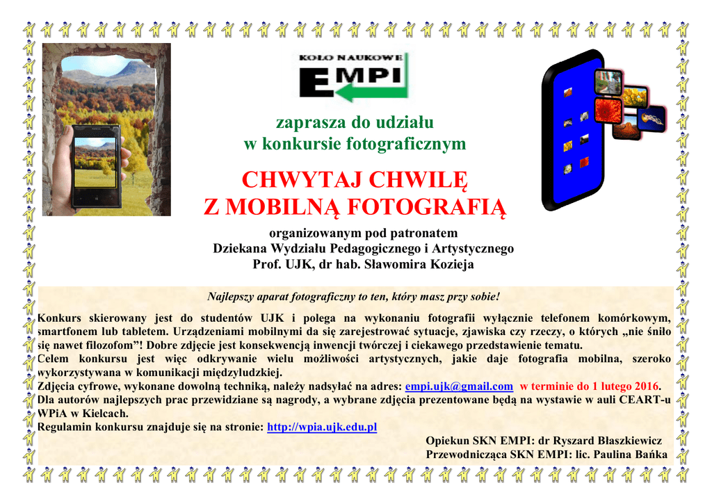 zaprasza do udziału w konkursie fotograficznym CHWYTAJ CHWILĘ Z MOBILNĄ FOTOGRAFIĄ organizowanym pod patronatem Dziekana Wydziału Pedagogicznego i Artystycznego Prof. UJK, dr hab. Sławomira Kozieja Najlepszy aparat fotograficzny to ten, który masz przy sobie! Konkurs skierowany jest do studentów UJK i polega na wykonaniu fotografii wyłącznie telefonem komórkowym, smartfonem lub tabletem. Urządzeniami mobilnymi da się zarejestrować sytuacje, zjawiska czy rzeczy, o których „nie śniło się nawet filozofom”! Dobre zdjęcie jest konsekwencją inwencji twórczej i ciekawego przedstawienie tematu. Celem konkursu jest więc odkrywanie wielu możliwości artystycznych, jakie daje fotografia mobilna, szeroko wykorzystywana w komunikacji międzyludzkiej. Zdjęcia cyfrowe, wykonane dowolną techniką, należy nadsyłać na adres: [email protected] w terminie do 1 lutego 2016. Dla autorów najlepszych prac przewidziane są nagrody, a wybrane zdjęcia prezentowane będą na wystawie w auli CEART-u WPiA w Kielcach. Regulamin konkursu znajduje się na stronie: http://wpia.ujk.edu.pl Opiekun SKN EMPI: dr Ryszard Błaszkiewicz Przewodnicząca SKN EMPI: lic. Paulina Bańka