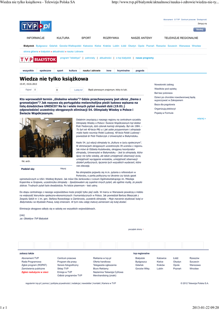 Wiedza nie tylko książkowa - Telewizja Polska SA 1z1 http://www.tvp.pl/bialystok/aktualnosci/nauka-i-zdrowie/wiedza-nie-ty... Abonament O TVP Centrum prasowe Dostępność Zaloguj się INFORMACJE KULTURA SPORT ROZRYWKA NASZE ANTENY TELEWIZJE REGIONALNE Białystok Bydgoszcz Gdańsk Gorzów Wielkopolski Katowice Kielce Kraków Lublin Łódź Olsztyn Opole Poznań Rzeszów Szczecin Warszawa Wrocław strona główna » białystok » aktualności » nauka i zdrowie program "obiektyw" | patronaty | aktualności | o tvp białystok | nasze programy wszystkie społeczne sport kultura nauka i zdrowie inne kryminalne pogoda Wiedza nie tylko książkowa 15:47, 19.01.2013 Fajne! 0 Nowatorski zabieg Lubię to! 0 Wasilków pod opieką Bądź pierwszym znajomym, który to lubi. Bal bez poloneza Kto wprowadził termin „Globalna wioska"? Gdzie przechowywany jest obraz „Dama z gronostajem"? Jak nazywa się portugalska melancholijna pieśń ludowa wpisana na listę dziedzictwa UNESCO? Na te i wiele innych pytań musieli dziś (19.01.) odpowiedzieć uczestnicy okręgowych eliminacji 54. Olimpiady Wiedzy o Polsce i Świecie Współczesnym. Dzieci po chorobie nowotworowej będą wypoczywać w Zakopanem Baza dla pogotowia Organizują plebiscyt Pojadą w Formule więcej » Ostatnim zwycięzcą z naszego regionu na centralnym szczeblu Olimpiady Wiedzy o Polsce i Świecie Współczesnym był doktor Piotr Fiedorczyk, dziś członek komisji olimpiady. Był rok 1984. To był rok 40-lecia PRL-u i jak sobie przypominam i olimpiada miała hasło rocznicę Polski Ludowej, 40-lecia Polski Ludowej powiedział dr Piotr Fiedorczyk z Uniwersytet w Białymstoku. Hasło 54. już edycji olimpiady to „Kultura w życiu społecznym". W eliminacjach okręgowych uczestniczyło 39 uczniów z regionu. Jak mówi dr Elżbieta Kużelewska, okręgowy koordynator olimpiady, Uniwersytet w Białymstoku - Jest to olimpiada, która łączy nie tylko wiedzę, ale także umiejętność obserwacji życia, umiejętność wyciągania wniosków, umiejętność obserwacji działań politycznych, łączenia tych wszystkich wydarzeń, które nas otaczają. fot. arch. Podziel się: Więcej Na olimpiadzie pojawiły się m.in. pytania o referendum w Portoryko, o partię polityczną na Ukrainie czy tytuły gazet opiniotwórczych w USA i Wielkiej Brytanii. Jak mówi Ola Jankowska z Liceum Ogólnokształcącego im. Mikołaja Kopernika w Grajewie, uczestniczka olimpiady - Spodziewałam się zupełnie innych pytań, ale ogólnie myślę, że poszło dobrze. Trudnych pytań było dwadzieścia. Po teście pisemnym - test ustny. Do etapu centralnego z naszego województwa może przejść tylko pięć osób. W marcu w Warszawie powalczą o indeks na większość kierunków społeczno-ekonomicznych i humanistycznych w Polsce. Jak powiedział Bartosz Błaszczak z Zespołu Szkół nr 1 im. gen. Stefana Roweckiego w Zambrowie, uczestnik olimpiady - Moje marzenie studiować tutaj w Białymstoku na Wydziale Prawa, tutaj zmierzam. W tym roku zdaję maturę zamierzam się tutaj dostać. Eliminacje okręgowe odbyły się w sobotę we wszystkich województwach. (mk) za: Obiektyw TVP Białystok początek strony ^ zobacz także Abonament TVP Rada Programowa Zgłoś program (ROPAT) Zamówienia publiczne Zgłoś nadużycie w sieci tvp regionalne Centrum prasowe Program dla prasy Serwis fotograficzny Sklep TVP Emisja w TVP Odbiór programów TVP Reklama w tvp.pl Oferta handlowa Telegazeta ogłoszenia Biuro Reklamy Naziemna Telewizja Cyfrowa Merchandising (znaki) regulamin tvp.pl | pomoc | polityka prywatności | redakcja | newsletter | kontakt | Kariera w TVP Białystok Bydgoszcz Gdańsk Gorzów Wlkp. Katowice Kielce Kraków Lublin Łódź Olsztyn Opole Poznań Rzeszów Szczecin Warszawa Wrocław © 2012 Telewizja Polska S.A. 2013-01-22 09:20