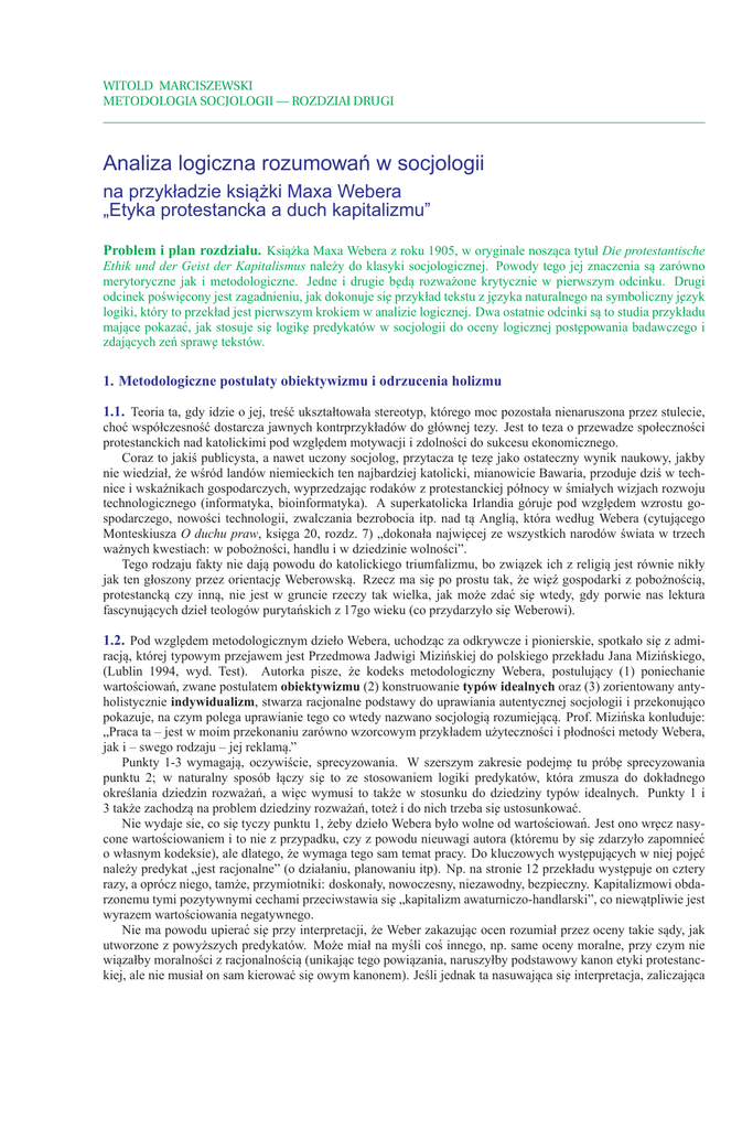 WITOLD MARCISZEWSKI METODOLOGIA SOCJOLOGII — ROZDZIAł DRUGI Analiza logiczna rozumowań w socjologii na przykładzie ksiażki ˛ Maxa Webera „Etyka protestancka a duch kapitalizmu” Problem i plan rozdziału. Ksiażka ˛ Maxa Webera z roku 1905, w oryginale noszaca ˛ tytuł Die protestantische Ethik und der Geist der Kapitalismus należy do klasyki socjologicznej. Powody tego jej znaczenia sa˛ zarówno merytoryczne jak i metodologiczne. Jedne i drugie b˛eda˛ rozważone krytycznie w pierwszym odcinku. Drugi odcinek poświ˛econy jest zagadnieniu, jak dokonuje si˛e przykład tekstu z j˛ezyka naturalnego na symboliczny j˛ezyk logiki, który to przekład jest pierwszym krokiem w analizie logicznej. Dwa ostatnie odcinki sa˛ to studia przykładu majace ˛ pokazać, jak stosuje si˛e logik˛e predykatów w socjologii do oceny logicznej post˛epowania badawczego i zdajacych ˛ zeń spraw˛e tekstów. 1. Metodologiczne postulaty obiektywizmu i odrzucenia holizmu 1.1. Teoria ta, gdy idzie o jej, treść ukształtowała stereotyp, którego moc pozostała nienaruszona przez stulecie, choć współczesność dostarcza jawnych kontrprzykładów do głównej tezy. Jest to teza o przewadze społeczności protestanckich nad katolickimi pod wzgl˛edem motywacji i zdolności do sukcesu ekonomicznego. Coraz to jakiś publicysta, a nawet uczony socjolog, przytacza t˛e tez˛e jako ostateczny wynik naukowy, jakby nie wiedział, że wśród landów niemieckich ten najbardziej katolicki, mianowicie Bawaria, przoduje dziś w technice i wskaźnikach gospodarczych, wyprzedzajac ˛ rodaków z protestanckiej północy w śmiałych wizjach rozwoju technologicznego (informatyka, bioinformatyka). A superkatolicka Irlandia góruje pod wzgl˛edem wzrostu gospodarczego, nowości technologii, zwalczania bezrobocia itp. nad ta˛ Anglia,˛ która według Webera (cytujacego ˛ Monteskiusza O duchu praw, ksi˛ega 20, rozdz. 7) „dokonała najwi˛ecej ze wszystkich narodów świata w trzech ważnych kwestiach: w pobożności, handlu i w dziedzinie wolności”. Tego rodzaju fakty nie daja˛ powodu do katolickiego triumfalizmu, bo zwiazek ˛ ich z religia˛ jest równie nikły jak ten głoszony przez orientacj˛e Weberowska.˛ Rzecz ma si˛e po prostu tak, że wi˛eź gospodarki z pobożnościa,˛ protestancka˛ czy inna,˛ nie jest w gruncie rzeczy tak wielka, jak może zdać si˛e wtedy, gdy porwie nas lektura fascynujacych ˛ dzieł teologów purytańskich z 17go wieku (co przydarzyło si˛e Weberowi). 1.2. Pod wzgl˛edem metodologicznym dzieło Webera, uchodzac ˛ za odkrywcze i pionierskie, spotkało si˛e z admiracja,˛ której typowym przejawem jest Przedmowa Jadwigi Mizińskiej do polskiego przekładu Jana Mizińskiego, (Lublin 1994, wyd. Test). Autorka pisze, że kodeks metodologiczny Webera, postulujacy ˛ (1) poniechanie wartościowań, zwane postulatem obiektywizmu (2) konstruowanie typów idealnych oraz (3) zorientowany antyholistycznie indywidualizm, stwarza racjonalne podstawy do uprawiania autentycznej socjologii i przekonujaco ˛ pokazuje, na czym polega uprawianie tego co wtedy nazwano socjologia˛ rozumiejac ˛ a.˛ Prof. Mizińska konluduje: „Praca ta – jest w moim przekonaniu zarówno wzorcowym przykładem użyteczności i płodności metody Webera, jak i – swego rodzaju – jej reklama.” ˛ Punkty 1-3 wymagaja,˛ oczywiście, sprecyzowania. W szerszym zakresie podejm˛e tu prób˛e sprecyzowania punktu 2; w naturalny sposób łaczy ˛ si˛e to ze stosowaniem logiki predykatów, która zmusza do dokładnego określania dziedzin rozważań, a wi˛ec wymusi to także w stosunku do dziedziny typów idealnych. Punkty 1 i 3 także zachodza˛ na problem dziedziny rozważań, toteż i do nich trzeba si˛e ustosunkować. Nie wydaje sie, co si˛e tyczy punktu 1, żeby dzieło Webera było wolne od wartościowań. Jest ono wr˛ecz nasycone wartościowaniem i to nie z przypadku, czy z powodu nieuwagi autora (któremu by si˛e zdarzyło zapomnieć o własnym kodeksie), ale dlatego, że wymaga tego sam temat pracy. Do kluczowych wyst˛epujacych ˛ w niej poj˛eć należy predykat „jest racjonalne” (o działaniu, planowaniu itp). Np. na stronie 12 przekładu wyst˛epuje on cztery razy, a oprócz niego, tamże, przymiotniki: doskonały, nowoczesny, niezawodny, bezpieczny. Kapitalizmowi obdarzonemu tymi pozytywnymi cechami przeciwstawia si˛e „kapitalizm awaturniczo-handlarski”, co niewatpliwie ˛ jest wyrazem wartościowania negatywnego. Nie ma powodu upierać si˛e przy interpretacji, że Weber zakazujac ˛ ocen rozumiał przez oceny takie sady, ˛ jak utworzone z powyższych predykatów. Może miał na myśli coś innego, np. same oceny moralne, przy czym nie wiazałby ˛ moralności z racjonalnościa˛ (unikajac ˛ tego powiazania, ˛ naruszyłby podstawowy kanon etyki protestanckiej, ale nie musiał on sam kierować si˛e owym kanonem). Jeśli jednak ta nasuwajaca ˛ si˛e interpretacja, zaliczajaca ˛ 2 M. Webera „Etyka protestancka a duch kapitalizmu” — analiza logiczna racjonalność do zalet działania, umysłu itd., obca była Weberowi, to skoro ocenia si˛e tak wysoko jego zakaz stosowania ocen, należy powiedzieć, co miał on w tym zakazie na myśli. 1.3. Wymieniona wyżej jako punkt 3 zasada indywidualizmu metodologicznego żada ˛ – w uj˛eciu Autorki Przedmowy – „żeby procesy i zdarzenia społeczne wyprowadzać: a) z reguł rzadz ˛ acych ˛ zachowaniem uczestniczacych ˛ w nich jednostek oraz: b) z opisów sytuacji, w których te jednostki si˛e znajduja.˛ [...] Indywidualizm metodologiczny wyst˛epuje przeciw holizmowi, w którym zakłada si˛e, że cechy jednostki bez reszty daja˛ si˛e wyjaśnić cechami grupy, do jakiej ona przynależy.” Z tego należy wnosić, że nie jest holista,˛ kto nie twierdzi, że cechy jednostki daja˛ si˛e bez reszty wyjaśnić cechami grupy, a dopatruje si˛e w oddziaływaniu grupy wyjaśnienia jedynie cz˛eściowego. Wtedy je