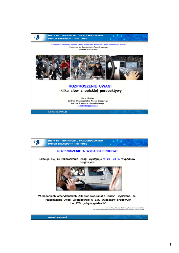Konferencja: „Smartfony, telefony, tablety: rozpraszanie kierowców – nowe zagrożenie na drodze” Partnerstwo dla Bezpieczeństwa Ruchu Drogowego Warszawa, dn. 12. 11. 2013 r. ROZPROSZENIE UWAGI - kilka słów z polskiej perspektywy Ilona Buttler Centrum Bezpieczeństwa Ruchu Drogowego Instytut Transportu Samochodowego [email protected] ROZPROSZENIE A WYPADKI DROGOWE Szacuje się, że rozproszenie uwagi występuje w 20 – 30 % wypadków drogowych. W badaniach amerykańskich „100-Car Naturalistic Study” wykazano, że rozproszenie uwagi występowało w 33% wypadków drogowych i w 27% „niby-wypadkach”. Źródło: Robyn Robertson (Traffic Injury Research Foundation; 2012): The Evolution of Distracted Driving. CAA/TIRF Distracted Driving Conference Toronto, Canada 1 ROZPROSZENIE UWAGI - WSTĘPNE PODSUMOWANIE • rozproszenie wywołane obsługą urządzeń w samochodzie wydaje się mocniej wpływać na jazdę kierowcy niż bodźce napływające z zewnątrz, • korzystanie z telefonu oraz „poważna” rozmowa (przez telefon lub z pasażerem) należą do najsilniejszych czynników rozpraszających kierowcę, • rozproszenie może wpływać na zachowanie kierowcy (prędkość jazdy, pozycja na pasie, odstęp od poprzedniego pojazdu) oraz na bezpieczeństwo (czas reakcji, prawdopodobieństwo wypadku), • strategie kompensacyjne mogą się nie sprawdzać, zwłaszcza wtedy gdy pojawi się niespodziewane zdarzenie. Źródło: George Yannis (2012): The Effects of Different Types of Driver Distractions: Findings from the EU. CAA/TIRF Distracted Driving Conference Toronto, Canada PROBLEMY Z POJĘCIEM „ROZPROSZENIE UWAGI” Definicja 1. Definicja pojęcia Każda czynność, która może odwracać uwagę osoby od podstawowego zadania: prowadzenia pojazdu. Te zakłócenia zagrażają bezpieczeństwu kierowcy, pasażera oraz osób postronnych (David Melton). NHTSA ogólnie definiuje rozproszenie uwagi kierowcy jako cokolwiek, co może oderwać wzrokowe, manualne lub poznawcze zdolności kierowcy od prowadzenia pojazdu. Do rozproszenia dochodzi, gdy kierowca odwraca uwagę od zadań związanych z prowadzeniem pojazdu. Źródło: Amy Schick (2012): Distracted Driving U.S. Federal Initiatives. CAA/TIRF Distracted Driving Conference Toronto, Canada 2 ROZPROSZENIE UWAGI KIEROWCY Wysokie Wzrokowa Średnie Zadania, które wymagają przeniesienia wzroku poza obszar drogi. Niskie Poznawcza Zadania, które odwracają uwagę kierowcy od kontrolowania ruchu pojazdu, manewrów i interakcji z innymi użytkownikami dróg Manualna Zadania, które wymagają od kierowcy manipulowania urządzeniem. Źródło: David Strayer (2012): Effects of Cell Phones on Driving Performance. CAA/TIRF Distracted Driving Conference Toronto, Canada PROBLEMY Z POJĘCIEM „ROZPROSZENIE UWAGI” Definicja opracowana podczas International Conference on Distracted Driving (Kanada; 2005) ..od czynności krytycznych dla bezpiecznego prowadzenia pojazdu „Oderwanie uwagi od prowadzenia pojazdu, gdy kierowca okresowo skupia się na przedmiocie, osobie, zadaniu lub zdarzeniu, które nie są związane z prowadzeniem pojazdu. Ogranicza to świadomość kierowcy, jego zdolność do podejmowania decyzji i wykonania manewrów, a to z kolei zwiększa prawdopodobieństwo (ryzyko) pojawienia się działań korygujących, niby-wypadków lub wypadków drogowych”. Źródło: Hedlund, J., Simpson, H., Mayhew, D.(2005):. International Conference on Distracting Driving: Summary of Proceedings and Recommendations (2–5 October). Retrieved from http://www.distracteddriving.ca/english/presentations.cfm. 3 PROBLEMY Z POJĘCIEM „ROZPROSZENIE UWAGI” Definicja Problem relacji miedzy „rozproszeniem uwagi” a „nieuwagą”; (Propozycja M.A. Regana i in. 2011): Nieuwaga – niewystarczająca lub brak uwagi przy realizacji krytycznych z punktu widzenia bezpieczeństwa działań. Rozproszenie - jedną z form nieuwagi. Problem operacjonalizacji definicji, która umożliwi nie tylko obserwację i kodowanie zachowań kierowcy, a także egzekucję przepisów. Źródło: Michael A. Regan, Charlene Hallett, Craig P. Gordon (2011): Driver distraction and driver inattention: Definition, relationship and taxonomy. Accident Analysis and Prevention 43 (2011) 1771–1781 2009: KAMPANIA „PROWADZISZ - ODŁÓŻ TELEFON” Inicjatywa „Grupy Perswazja w Praktyce” działającej przy Instytucie Psychologii Uniwersytetu Jagiellońskiego, przy współpracy Fundacji Marketingu Społecznego. Badania opini społecznych: Grupy Perswazji w Praktyce (2009) 4 2009 – 20xx ?: KAMPANIA „DAJEMY CI WOLNĄ RĘKĘ” Organizator: Nokia Poland (m.in. vouchery na darmową instalację 1000 zestawów głośnomówiących dowolnej marki). Badania opinii społecznych: Millward Brown SMG/KRC (listopad 2009) Badanie opinii użytkowników dróg na temat zagrożeń występujących w ruchu drogowym w Europie (październik 2010) (Instytut Transportu Samochodowego i Millward Brown SMG/KRC) 19 Badanie zrealizowane zostało na ogólnopolskiej reprezentatywnej próbie trzech grup dorosłych (w wieku 18+) użytkowników dróg: kierowców samochodów, motocyklistów i innych użytkowników dróg (pieszych, rowerzystów, użytkowników komunikacji publicznej). Dobór osób do poszczególnych grup użytkowników dróg miał charakter kwotowy. Dla poszczególnych grup założono następujące liczebności: Próba kierowców samochodów N = 730 osób; Próba motocyklistów N = 545 osób; Próba innych użytkowników dróg N = 540 osób. Badanie właściwe zrealizowane zostało metodą indywidualnych wywiadów kwestionariuszowych (face to face) przeprowadzanych w domach respondentów. Badanie odbyło się w październiku i listopadzie 2010 roku. 5 RAPORT z badań ilościowych przygotowany przy okazji implementacji kampanii budującej świadomość prędkości z serii kampanii „Włącz Myślenie” (04. 2011) („Legend Group” Sp. z o.o. w Konsorcjum z MEC Sp. z o.o. i „On Board Public 