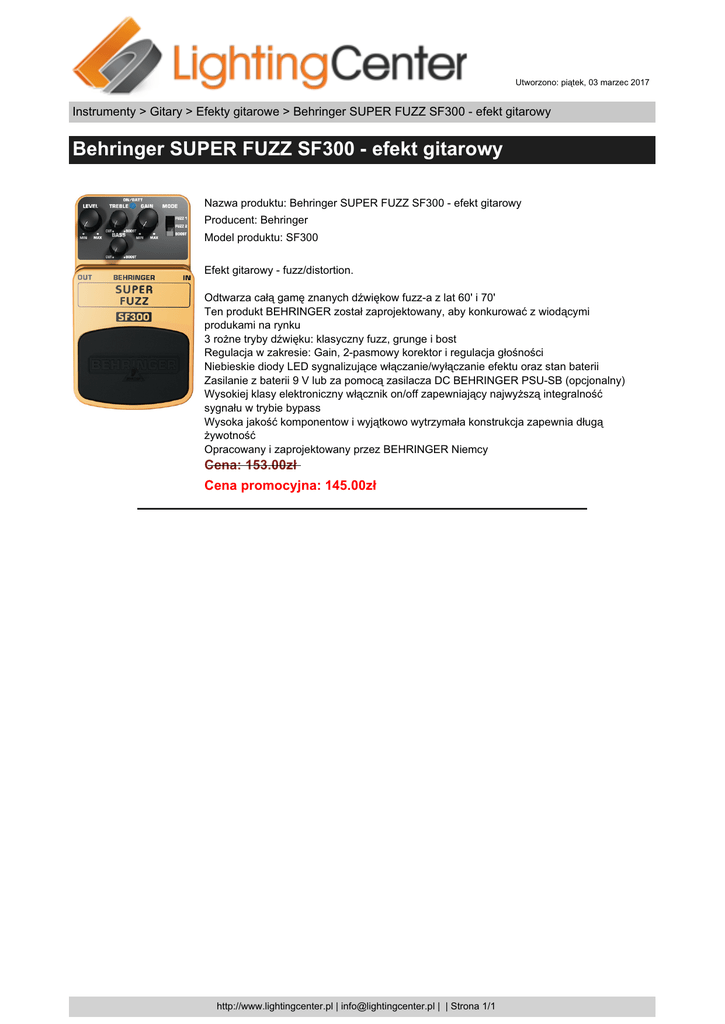 Utworzono: piątek, 03 marzec 2017 Instrumenty > Gitary > Efekty gitarowe > Behringer SUPER FUZZ SF300 - efekt gitarowy Behringer SUPER FUZZ SF300 - efekt gitarowy Nazwa produktu: Behringer SUPER FUZZ SF300 - efekt gitarowy Producent: Behringer Model produktu: SF300 Efekt gitarowy - fuzz/distortion. Odtwarza całą gamę znanych dźwiękow fuzz-a z lat 60' i 70' Ten produkt BEHRINGER został zaprojektowany, aby konkurować z wiodącymi produkami na rynku 3 rożne tryby dźwięku: klasyczny fuzz, grunge i bost Regulacja w zakresie: Gain, 2-pasmowy korektor i regulacja głośności Niebieskie diody LED sygnalizujące włączanie/wyłączanie efektu oraz stan baterii Zasilanie z baterii 9 V lub za pomocą zasilacza DC BEHRINGER PSU-SB (opcjonalny) Wysokiej klasy elektroniczny włącznik on/off zapewniający najwyższą integralność sygnału w trybie bypass Wysoka jakość komponentow i wyjątkowo wytrzymała konstrukcja zapewnia długą żywotność Opracowany i zaprojektowany przez BEHRINGER Niemcy Cena: 153.00zł Cena promocyjna: 145.00zł http://www.lightingcenter.pl | [email protected] | | Strona 1/1