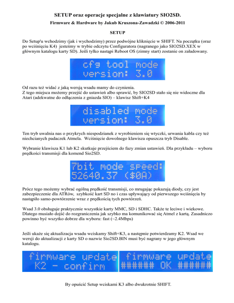 SETUP oraz operacje specjalne z klawiatury SIO2SD.