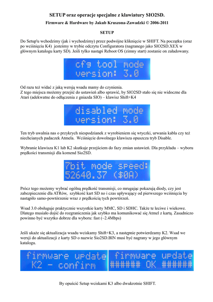 SETUP oraz operacje specjalne z klawiatury SIO2SD. Firmware & Hardware by Jakub Kruszona-Zawadzki © 2006-2011 SETUP Do Setup'u wchodzimy (jak i wychodzimy) przez podwójne kliknięcie w SHIFT. Na początku (oraz po wciśnięciu K4) jesteśmy w trybie odczytu Configuratora (nagranego jako SIO2SD.XEX w głównym katalogu karty SD). Jeśli tylko nastąpi Reboot OS (zimny start) zostanie on załadowany. Od razu też widać z jaką wersją wsadu mamy do czynienia. Z tego miejsca możemy przejść do ustawień albo sprawić, by SIO2SD stało się nie widoczne dla Atari (adekwatne do odłączenia z gniazda SIO) – klawisz Shift+K4 Ten tryb uwalnia nas o przykrych niespodzianek z wyrobieniem się wtyczki, urwania kabla czy też niechcianych padaczek Atmela. Wciśnięcie dowolnego klawisza opuszcza tryb Disable. Wybranie klawisza K1 lub K2 skutkuje przejściem do fazy zmian ustawień. Dla przykładu – wyboru prędkości transmisji dla komend Sio2SD. Prócz tego możemy wybrać ogólną prędkość transmisji, co mrugając pokazują diody, czy jest zabezpieczenie dla ATRów, szybkość kart SD no i czas upływający od pierwszego wciśnięcia by nastąpiło samo-powtórzenie wraz z prędkością tych powtórzeń. Wsad 3.0 obsługuje praktycznie wszystkie karty MMC, SD i SDHC. Także te leciwe i wiekowe. Dlatego musiało dojść do rozgraniczenia jak szybko ma komunikować się Atmel z kartą. Zasadniczo powinno być wszytko dobrze dla wyboru: fast (~2.4Mbps) Jeśli ukaże się aktualizacja wsadu wciskamy Shift+K3, a następnie potwierdzamy K2. Wsad we wersji do aktualizacji z karty SD o nazwie Sio2SD.BIN musi być nagrany w jego głównym katalogu. By opuścić Setup wciskami K3 albo dwukrotnie SHIFT. Zakrywanie D1-D15 przez napędy Virtualne..... …. jak i przez inne dyski D1-D15 Założenie pustego pliku NEWxxxx.ATR Z klawiatury SIO2SD nie możemy wprowadzić nazwy tworzonego pliku. Dlatego firmware utworzy plik z rozszerzeniem ATR, a za „xxxx” wstawi kolejny wzrastający numer. W danym katalogu na wybranym napędzie wciskamy Shift+K4. Nastąpi odłączenie napędu (=OFF=). Następne wciśnięcie Shift+K4 wymusi chęć założenia pustego pliku (=EMPTY=). Jeśli nie zmienimy podpięcia, to z poziomu Atari pierwsza próba wykonania formatowania spowoduje założenie odpowiedniej długości ATRa. Bez tego – plik nie zostanie utworzony! Trwa wyszukiwanie Jakby ktoś nie widział :) Jeśli działanie programu zostanie przerwane (np. Reset), wsad SIO2SD i tak będzie kontynuował przeszukiwanie karty SD, aż natrafi na wpis zgodny z wyświetlaną maską! Pajero. K4 Jeśli dojdzie do BOOTu wgrany zostanie Configurator zapisany w głównym katalogu jako SIO2SD.XEX Dbl SHIFT SHIFT+K4 Tryb wyłączenia całego Sio2SD Nie widoczny dla Atari K1 K2 następne ustawienie Szybkość transmisji dla napędów D1-D15 oraz V1-V99 Szybkość transmisji komend sterujących Sio2SD Szybkość dostępu Atmela do kart MMC/SD/SDHC Wskazania diód... K3 Numer Sio2SD Zezwolenie na zapis do Sio2SD Czas opóźnienia do pierwszego auto-powtórzenia Odstęp między repetycją klawiatury Shift+K1 Shift+K2 poprzednie Schemat nie zawiera informacji o możliwości upgrade wsadu (Shift+K3).....