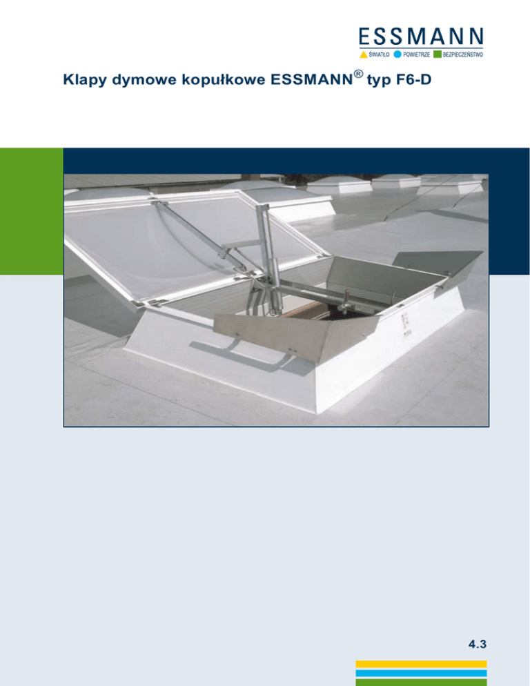 Klapy dymowe kopułkowe ESSMANN ® typ F6-D 4.3 Opis produktu Klapy dymowe kopułkowe ESSMANN ® Typ F6-D Świetliki kopułkowe ESSMANN typ 810 są wykonane z opalizowanego akrylu i we wszystkich wielkościach obudowane są stabilnym obramowaniem z PCV. W jednym elemencie budowlanym łączą trzy zasadnicze role: 1.doświetlają pomieszczenia światłem dziennym 2.zapewniają wentylację pomieszczeń 3.jako system oddymiający stanowią zabezpieczenie przeciwpożarowe zgodnie z normami DIN i EN Świetliki kopułkowe są osadzone na ocieplanych wieńcach o wysokości 30 cm. Klapa dymowa może być wyzwalana automatycznie mechanizmem termicznym wyposażonym w czujki temperaturowe 70oC / 90oC bądź manualnie przez stację wyzwalania awaryjnego. System spełnia wymogi normy PN EN 12101-2. Wymiary klap Stan 1/2007 Zmiany techniczne zastrzeżone. Wymiar nominalny Powierzchnia wlotu światła m2 Geometryczna powierzchnia wlotu m2 Współczynnik Aa w m2 z osłoną wiatrową KLK 100/100 0,81 1,00 0,750 KLK 100/200 1,70 2,00 1,500 KLK 100/250 2,14 2,50 1,875 LK 120/120 1,00 1,44 0,936 KLK 120/120 1,20 1,44 1,080 LK 120/150 1,30 1,80 1,170 LK 120/240 2,20 2,88 2,016 KLK 120/240 2,51 2,88 2,160 LK 150/150 1,69 2,25 1,575 KLK 150/150 1,95 2,25 1,688 LK 150/240 2,86 3,60 2,520 KLK 150/240 3,20 3,60 2,700 KLK 150/250 3,34 3,75 2,813 LK 180/240 3,52 4,32 3,024 KLK 180/240 3,89 4,32 3,240 KLK 180/250 4,06 4,50 3,375 Więcej informacji na www.essmann.pl Inne wielkości na zapytanie (zob. też tabela wartości współczynników Aa, specyfikacja 4.1). Zmiany techniczne zastrzeżone. Essmann Polska Sp. z o.o. Stara Iwiczna, ul. Nowa 23 PL 05-500 Piaseczno Tel.: +48 (22) 750 33 41 Fax: +48 (22) 750 33 10 e-mail: [email protected] www.essmann.pl