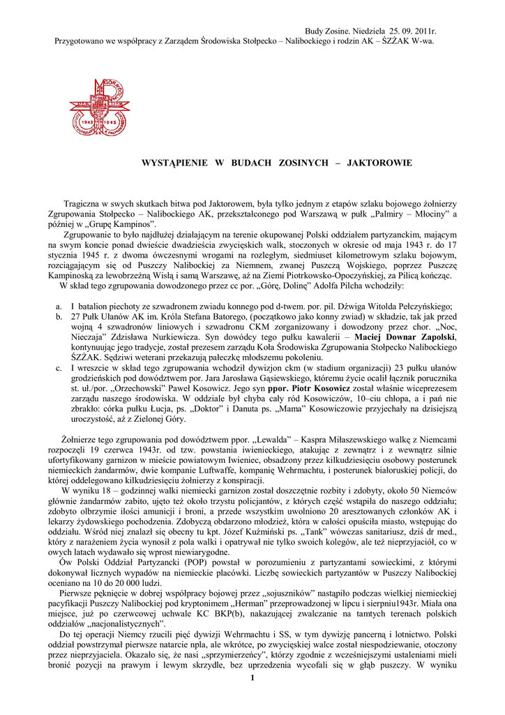 Budy Zosine. Niedziela 25. 09. 2011r. Przygotowano we współpracy z Zarządem Środowiska Stołpecko – Nalibockiego i rodzin AK – ŚZŻAK W-wa. WYSTĄPIENIE W BUDACH ZOSINYCH – JAKTOROWIE Tragiczna w swych skutkach bitwa pod Jaktorowem, była tylko jednym z etapów szlaku bojowego żołnierzy Zgrupowania Stołpecko – Nalibockiego AK, przekształconego pod Warszawą w pułk „Palmiry – Młociny” a później w „Grupę Kampinos”. Zgrupowanie to było najdłużej działającym na terenie okupowanej Polski oddziałem partyzanckim, mającym na swym koncie ponad dwieście dwadzieścia zwycięskich walk, stoczonych w okresie od maja 1943 r. do 17 stycznia 1945 r. z dwoma ówczesnymi wrogami na rozległym, siedmiuset kilometrowym szlaku bojowym, rozciągającym się od Puszczy Nalibockiej za Niemnem, zwanej Puszczą Wojskiego, poprzez Puszczę Kampinoską za lewobrzeżną Wisłą i samą Warszawę, aż na Ziemi Piotrkowsko-Opoczyńskiej, za Pilicą kończąc. W skład tego zgrupowania dowodzonego przez cc por. „Górę, Dolinę” Adolfa Pilcha wchodziły: a. I batalion piechoty ze szwadronem zwiadu konnego pod d-twem. por. pil. Dźwiga Witolda Pełczyńskiego; b. 27 Pułk Ułanów AK im. Króla Stefana Batorego, (początkowo jako konny zwiad) w składzie, tak jak przed wojną 4 szwadronów liniowych i szwadronu CKM zorganizowany i dowodzony przez chor. „Noc, Nieczaja” Zdzisława Nurkiewicza. Syn dowódcy tego pułku kawalerii – Maciej Downar Zapolski, kontynuując jego tradycje, został prezesem zarządu Koła Środowiska Zgrupowania Stołpecko Nalibockiego ŚZŻAK. Sędziwi weterani przekazują pałeczkę młodszemu pokoleniu. c. I wreszcie w skład tego zgrupowania wchodził dywizjon ckm (w stadium organizacji) 23 pułku ułanów grodzieńskich pod dowództwem por. Jara Jarosława Gąsiewskiego, któremu życie ocalił łącznik porucznika st. uł./por. „Orzechowski” Paweł Kosowicz. Jego syn ppor. Piotr Kosowicz został właśnie wiceprezesem zarządu naszego środowiska. W oddziale był chyba cały ród Kosowiczów, 10–ciu chłopa, a i pań nie zbrakło: córka pułku Łucja, ps. „Doktor” i Danuta ps. „Mama” Kosowiczowie przyjechały na dzisiejszą uroczystość, aż z Zielonej Góry. Żołnierze tego zgrupowania pod dowództwem ppor. „Lewalda” – Kaspra Miłaszewskiego walkę z Niemcami rozpoczęli 19 czerwca 1943r. od tzw. powstania iwienieckiego, atakując z zewnątrz i z wewnątrz silnie ufortyfikowany garnizon w mieście powiatowym Iwieniec, obsadzony przez kilkudziesięciu osobowy posterunek niemieckich żandarmów, dwie kompanie Luftwaffe, kompanię Wehrmachtu, i posterunek białoruskiej policji, do której oddelegowano kilkudziesięciu żołnierzy z konspiracji. W wyniku 18 – godzinnej walki niemiecki garnizon został doszczętnie rozbity i zdobyty, około 50 Niemców głównie żandarmów zabito, ujęto też około trzystu policjantów, z których część wstąpiła do naszego oddziału; zdobyto olbrzymie ilości amunicji i broni, a przede wszystkim uwolniono 20 aresztowanych członków AK i lekarzy żydowskiego pochodzenia. Zdobyczą obdarzono młodzież, która w całości opuściła miasto, wstępując do oddziału. Wśród niej znalazł się obecny tu kpt. Józef Kuźmiński ps. „Tank” wówczas sanitariusz, dziś dr med., który z narażeniem życia wynosił z pola walki i opatrywał nie tylko swoich kolegów, ale też nieprzyjaciół, co w owych latach wydawało się wprost niewiarygodne. Ów Polski Oddział Partyzancki (POP) powstał w porozumieniu z partyzantami sowieckimi, z którymi dokonywał licznych wypadów na niemieckie placówki. Liczbę sowieckich partyzantów w Puszczy Nalibockiej oceniano na 10 do 20 000 ludzi. Pierwsze pęknięcie w dobrej współpracy bojowej przez „sojuszników” nastąpiło podczas wielkiej niemieckiej pacyfikacji Puszczy Nalibockiej pod kryptonimem „Herman” przeprowadzonej w lipcu i sierpniu1943r. Miała ona miejsce, już po czerwcowej uchwale KC BKP(b), nakazującej zwalczanie na tamtych terenach polskich oddziałów „nacjonalistycznych”. Do tej operacji Niemcy rzucili pięć dywizji Wehrmachtu i SS, w tym dywizję pancerną i lotnictwo. Polski oddział powstrzymał pierwsze natarcie npla, ale wkrótce, po zwycięskiej walce został niespodziewanie, otoczony przez nieprzyjaciela. Okazało się, że nasi „sprzymierzeńcy”, którzy zgodnie z wcześniejszymi ustaleniami mieli bronić pozycji na prawym i lewym skrzydle, bez uprzedzenia wycofali się w głąb puszczy. W wyniku 1 prowadzonych w głębi puszczy walk, które trwały niemal miesiąc. Polacy, przedzierając się małymi grupami na tyły wroga, zostali zdziesiątkowani, a ułani stracili w bagnach niemal wszystkie konie. Trzeba było organizować zgrupowanie od nowa. Reorganizacja przeprowadzona została sprawnie, przez nowo-mianowanego dowódcę Zgrupowania, młodego lecz energicznego komandosa, rodem ze Śląska cichociemnego podporucznika „Górę, Dolinę” Adolfa Pilcha, którego na kilka tygodni zastąpił mjr Wacław Pełka. Wspólną walkę przeciwko niemieckiemu okupantowi przerwał nieoczekiwanie zdradziecki atak dotychczasowych „sprzymierzeńców” na obóz polskich partyzantów, przed świtem 1 grudnia 1943r., po uprzednim zaproszeniu oficerów polskiego oddziału na odprawę wojenną do sztabu pułkownika Dubowa. Nasi oficerowie, w swoich asyście luzaków nie ujechali konno nawet dwóch kilometrów, gdy zostali otoczeni przez sowieckich partyzantów i obezwładnieni. Jednocześnie mrowie sowieckich żołnierzy, którzy dotąd byli u Polaków codziennymi gośćmi, wtargnęło do ich warownego obozowiska przystępując do rozbrajania śpiących jeszcze partyzantów, pod groźbą rozstrzelania ujętych wcześniej dowódców, w razie stawiania oporu. Ujętych podstępnie oficerów przetransportowano później samolotem przez linię frontu i osadzono w Moskwie na Łubiance, a luzaków wcielono do sowieckiej 